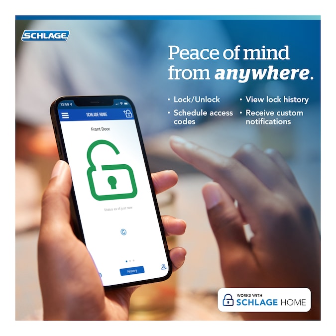 - PEACE OF MIND: Lock and unlock from anywhere, mange up to 100 access codes, view lock history, receive customizable notifications and easily manage multiple locks at once – all when paired to the Schlage Home app and connected to a secure WiFi network
