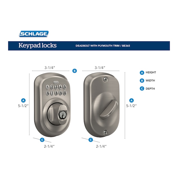 The Schlage keypad deadbolt allow you to lock and unlock your door without using a key. Ideal for front and back doors, as well as garage entry doors and home offices, this electronic deadbolt provides security and simplicity for the entire home. Silicone rubber, wear-resistant buttons with LED backlight make access safe and easy. Trust your home to Schlage, makers of high-quality, innovative door hardware for over 100 years.
