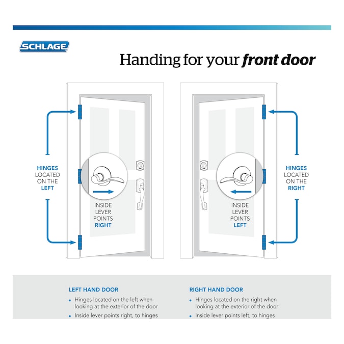 This Schlage front entry handle features an exterior handleset grip with an interior passage door knob or lever. This is the perfect door handle to pair with a mechanical or electronic keypad deadbolt lock for a customized entryway. This entry door grip offers premium construction combined with a sleek design and an industry-leading warranty. Trust your home to Schlage, makers of high-quality, innovative door hardware for over 100 years.