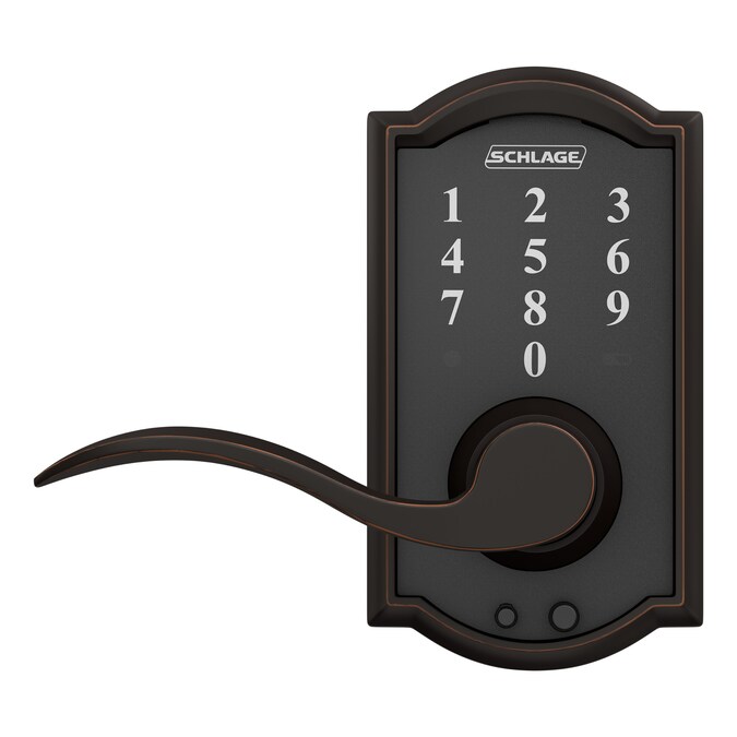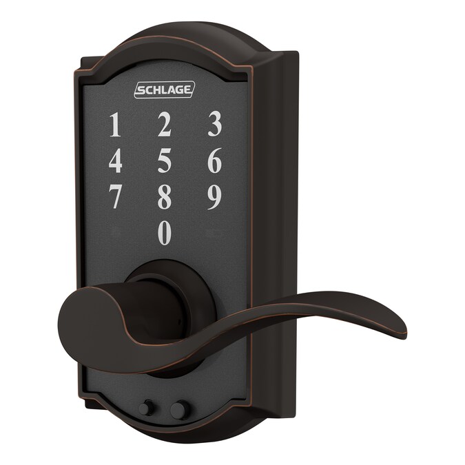With the Schlage Touch™ Keyless Touchscreen Accent Lever with Camelot Trim in Aged Bronze, there’s no key to lose, no re-keying or cutting new keys – no keys at all, thanks to our cylinder-free design. You can finally go for a run or take the dog for a walk without juggling keys or stuffing them in your sock. All in a slim profile and stylish trim that pairs perfectly with interior hardware. The Accent lever is widely popular for its elegant wave-like design that effortlessly matches a room’s style without overshadowing it, while the Camelot trim’s scalloped architectural details make any room charming and approachable. Our Aged Bronze finish is inspired by traditional design, featuring warm, copper tones that break through its darker, aged exterior. Plus, it’s been designed and tested with strength and durability in mind.