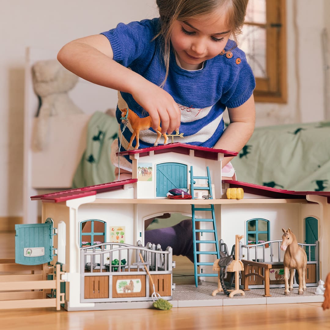 The new Lakeside Riding Center is the centerpiece of your Horse Club collection! Fully upgraded with TONS of new features! A new, open floorplan provides a spacious play area. The updated modular design means you can rearrange the playset infinite ways for limitless variety. More than 50 accessories for hours of play! The Lakeside Riding Center is the dream house Horse Club fans have been waiting for! Schleich Horse Club playsets and figurines introduce the limitless possibilities of storytelling and imaginative play. Featuring dozens of toy horses, riders and accessories, Schleich Horse Club lets your adventure stories run wild. Horse figurines canter in rich detail, while authentic playsets provide an always expanding setting for the adventures of Hannah, Sofia, Lisa and Sarah! Our horse and rider figurines love to be whisked away into stories featuring other Schleich play worlds, from the grasses of the savanna to the majestic pines of the forest! Schleich toys and playsets are built to last for generations. All our toys meet the highest national and international safety standards.