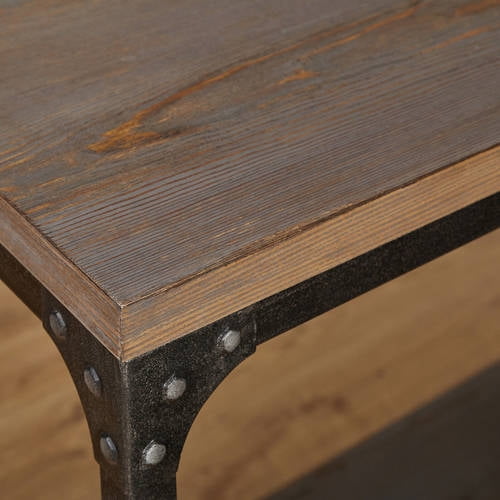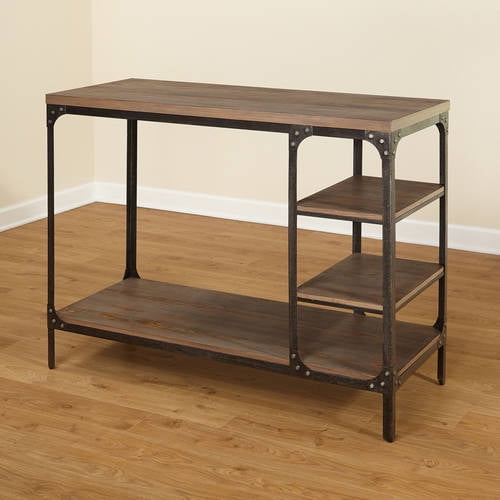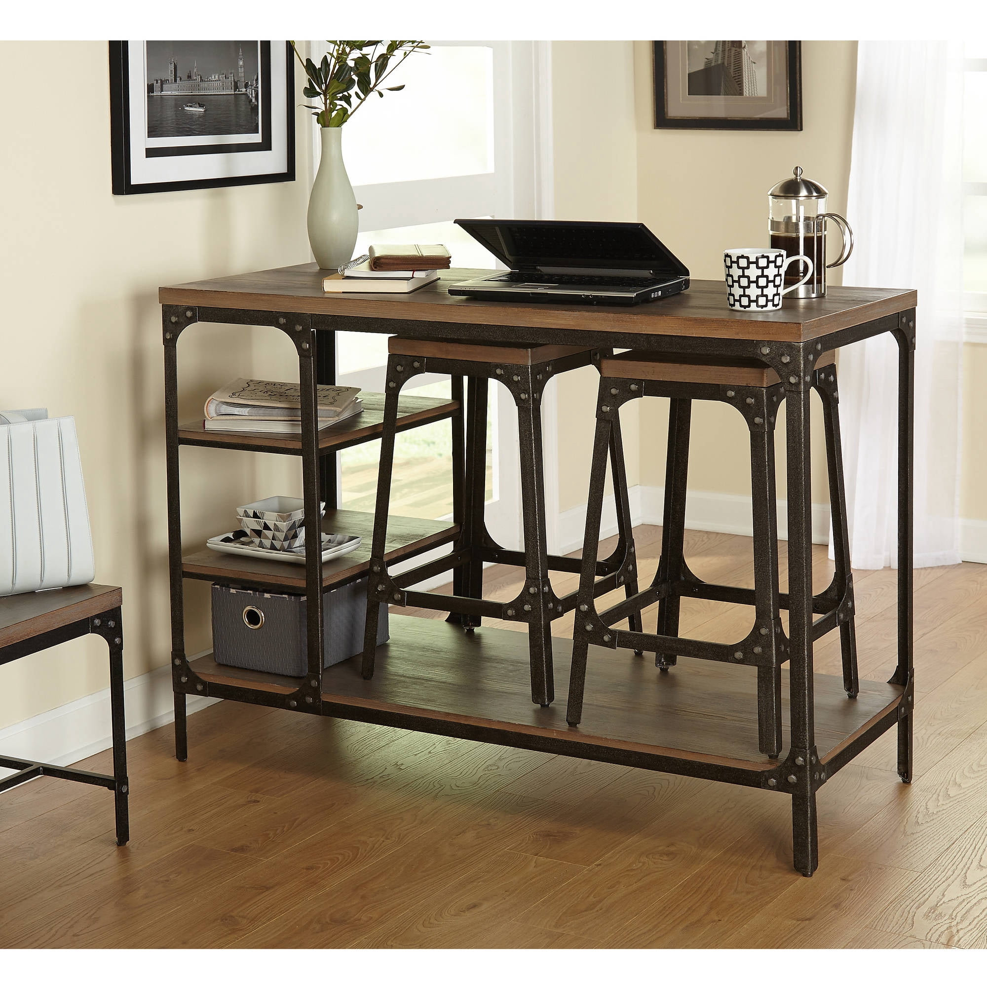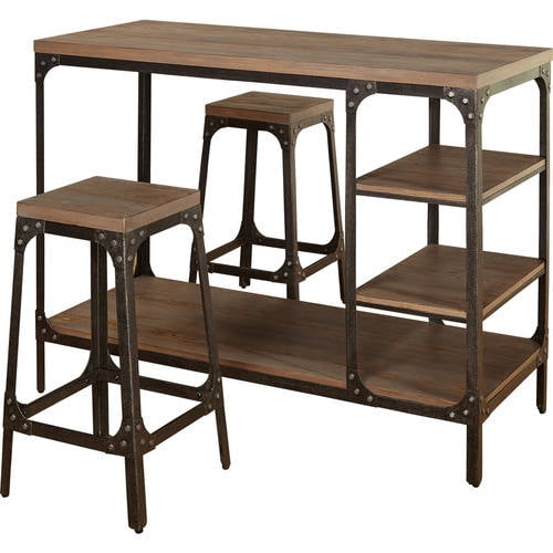This industrial-style of the Scholar Vintage Industrial counter height set adds convenience to dining spaces, workshops and offices. Each piece is crafted with a grey metal frame and topped with wood in a natural, weathered finish for a rustic, vintage look. When not in use, the stools tuck easily into the table’s large lower shelf to save space. Counter-height table features two additional side shelves. Details: Includes: one (1) rectangular table and two (2) 24-inch stools Counter height set Made of MDF with veneer and metal frame Weathered natural grey finish 1 large and 3 small open shelves Industrial style Seats up to 2 Assembly requiredDimensions: Table: 37 inches high x 49.1 inches wide x 20.25 inches deep Bar stool: 26 inches high x 14 inches wide x 14 inches deep Seat: 12.3 inches wide x 12.3 inches deep Large shelf: 27.5 inches high x 25.75 inches wide x 19.8 inches deep Top small open shelf: 8.1 inches high x 12.75 inches wide x 19.6 inches deep Middle small open shelf: 9.1 inches high x 12.75 inches wide x 19.8 inches deep Bottom small open shelf: 7.8 inches high x 12.75 inches wide x 19.8 inches deep