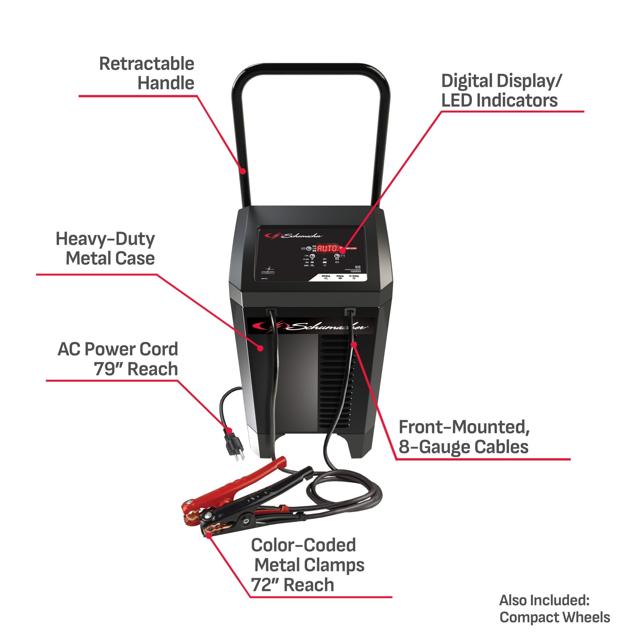 The Schumacher SC1353 Electric Battery Charger with Engine Starter, Boost, and Maintainer – 200 Amp/40 Amp, 12V fully automatic unit offers a 40 Amp boost mode that quickly brings deeply discharged batteries to life and a 200 Amp engine start for cars, trucks, SUVs, and RVs. This charger features strong starting power, a heavy-duty transformer, LED indicators and color-coded clamps with a 6-foot power cord and output cables for 12-feet of total reach. This charger is microprocessor-controlled with multi-stage charging, auto voltage detection, automatic amperage adjustment, a built-in battery and alternator tester, and reverse hook-up protection. Compact wheels allow for easy transport and storage with a durable case and retractable handle. Schu Eco Energy meets the highest industry standards. Compatible with standard and AGM batteries.