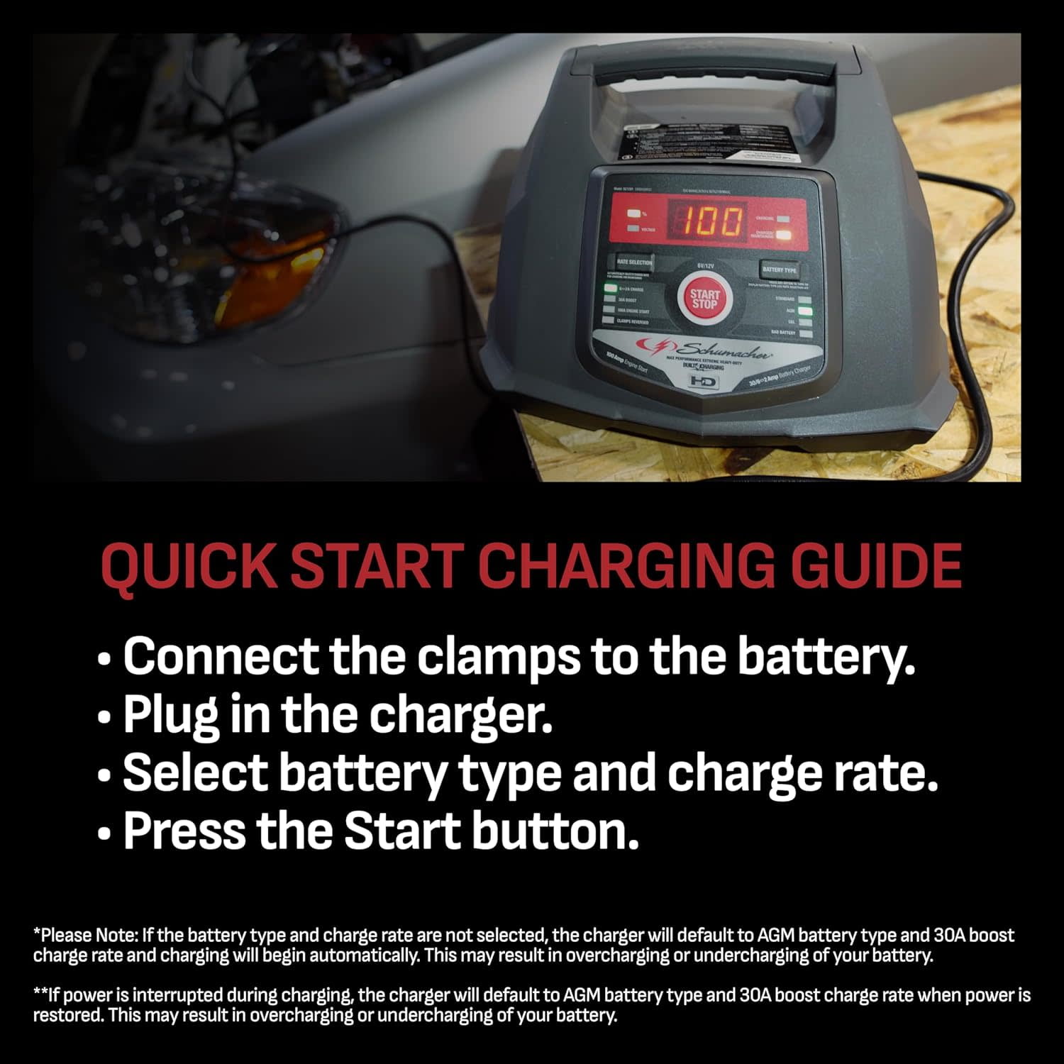 VERSATILE COMPATIBILITY: Charges compatible battery types including standard, AGM, gel and deep-cycle batteries MULTIPLE MODES: Features 30 Amp quick boost and 100 Amp jumpstart, powerful enough to start SUVs, trucks and large batteries FULLY AUTOMATIC: Microprocessor-controlled system automatically adjusts amperage; includes LED indicator lights EASE OF USE: Battery and alternator tester provides charge level and helps diagnose electrical problems automatically; multi-stage charging and auto-voltage detection SAFE & RELIABLE: Reverse hook-up protection ensures charger will not operate if clamps are reversed