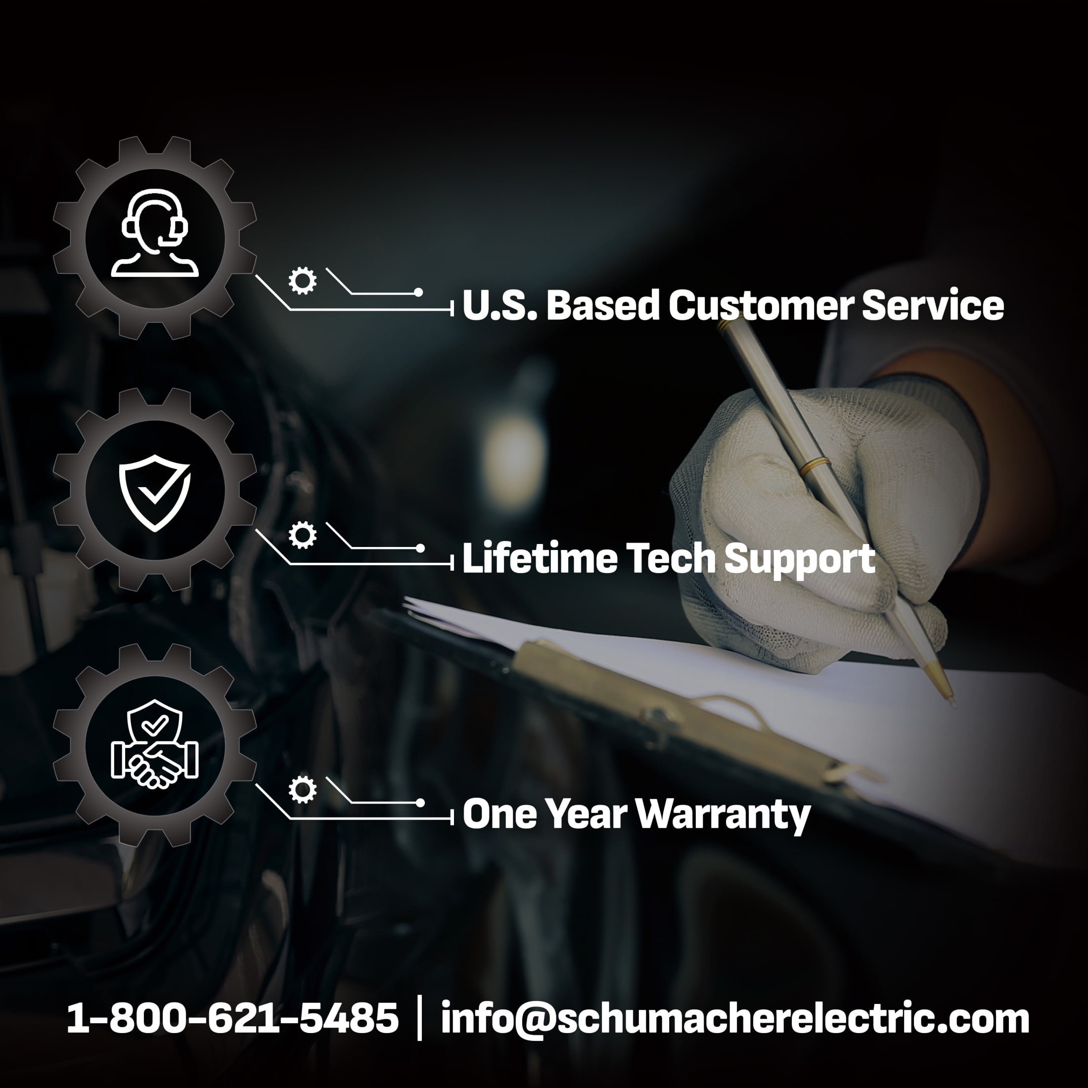 The Schumacher SC1281 is a fully automatic battery charger and engine starter designed for use with SUVs, trucks and large batteries. With 100 Amp engine start and 30 Amp boost mode, this unit delivers results when you need it most. Microprocessor controlled to automatically adjust the amperage rate and diagnose problems. The unit features multi-stage charging for added precision, safety and battery life. Includes auto voltage detection and an easy to use stop/start button. Reverse hook-up protection with an LED light indicator prevents the charger from operating if clamps are reversed. Schu Eco Energy meets the highest industry standards. DOE compliant and compatible with standard, AGM, gel and deep-cycle batteries.