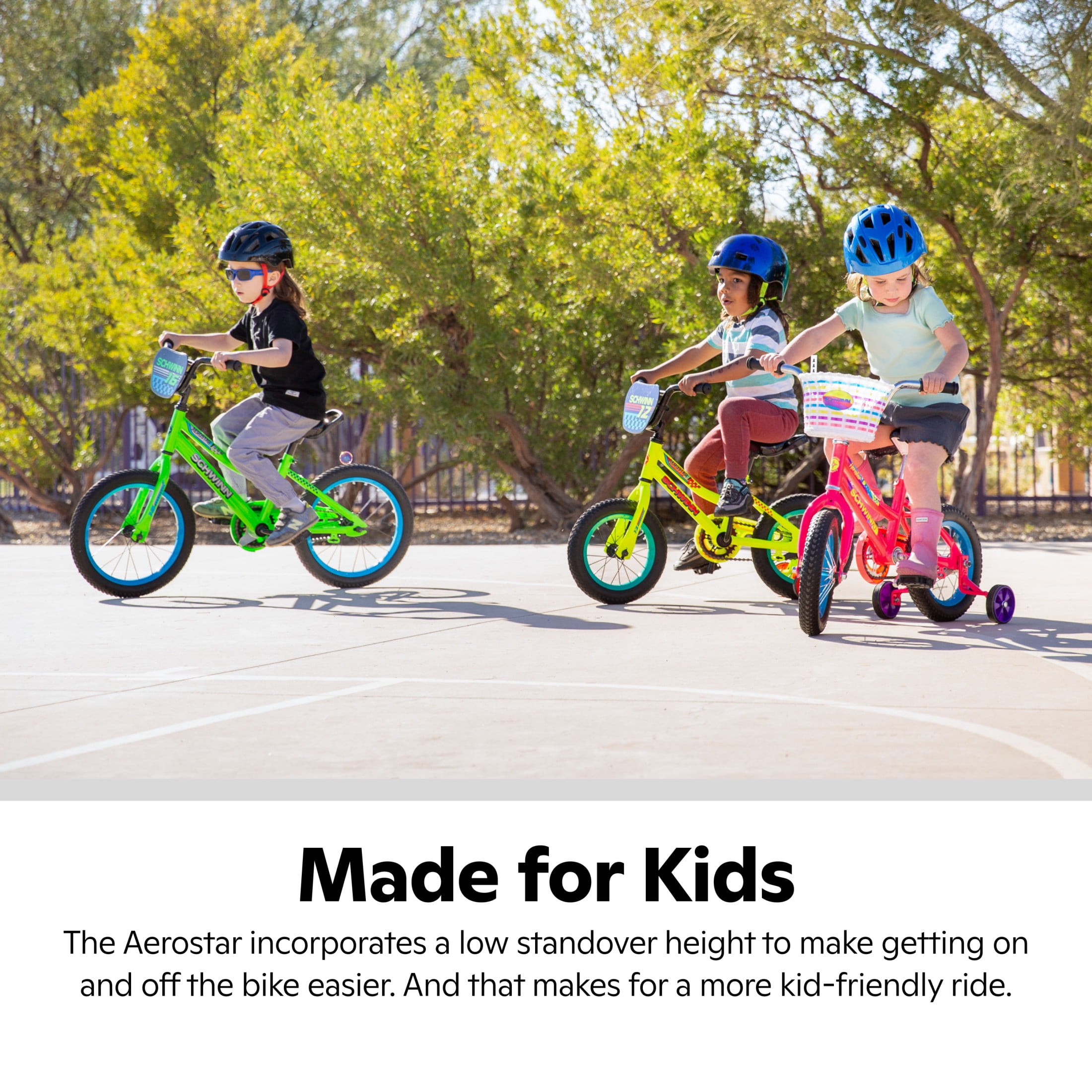 TRUSTED SCHWINN QUALITY: Trusted by parents, designed in Madison, Wisconsin. The Aerostar is a BMX-style kids’ bike for teaching your little one to ride. 12-inch wheels fit riders 36 to 40 inches tall. MADE FOR KIDS: Growing riders deserve a bike made to fit them just right. The Aerostar incorporates a low standover height to make getting on and off the bike easier. And that makes for a more kid-friendly ride. SIMPLE BRAKING: Stopping is easy with the coaster brake, just pedal backward to stop. GROWS WITH THEM: Tool-free adjustable seat allows the bike to grow with your child. The seat handle makes it easy to lend them a guiding hand or carry the bike. AWESOME EXTRAS: Training wheels come included, plus added protection with the chainguard. Boys love the cool BMX-style number plate. QUICK & EASY ASSEMBLY: Assembles in minutes with the included tool and a simple instruction guide. They’ll be pedaling around in no time! Schwinn Prospect Bike Helmet for Kids Shop All Schwinn Kids Bikes