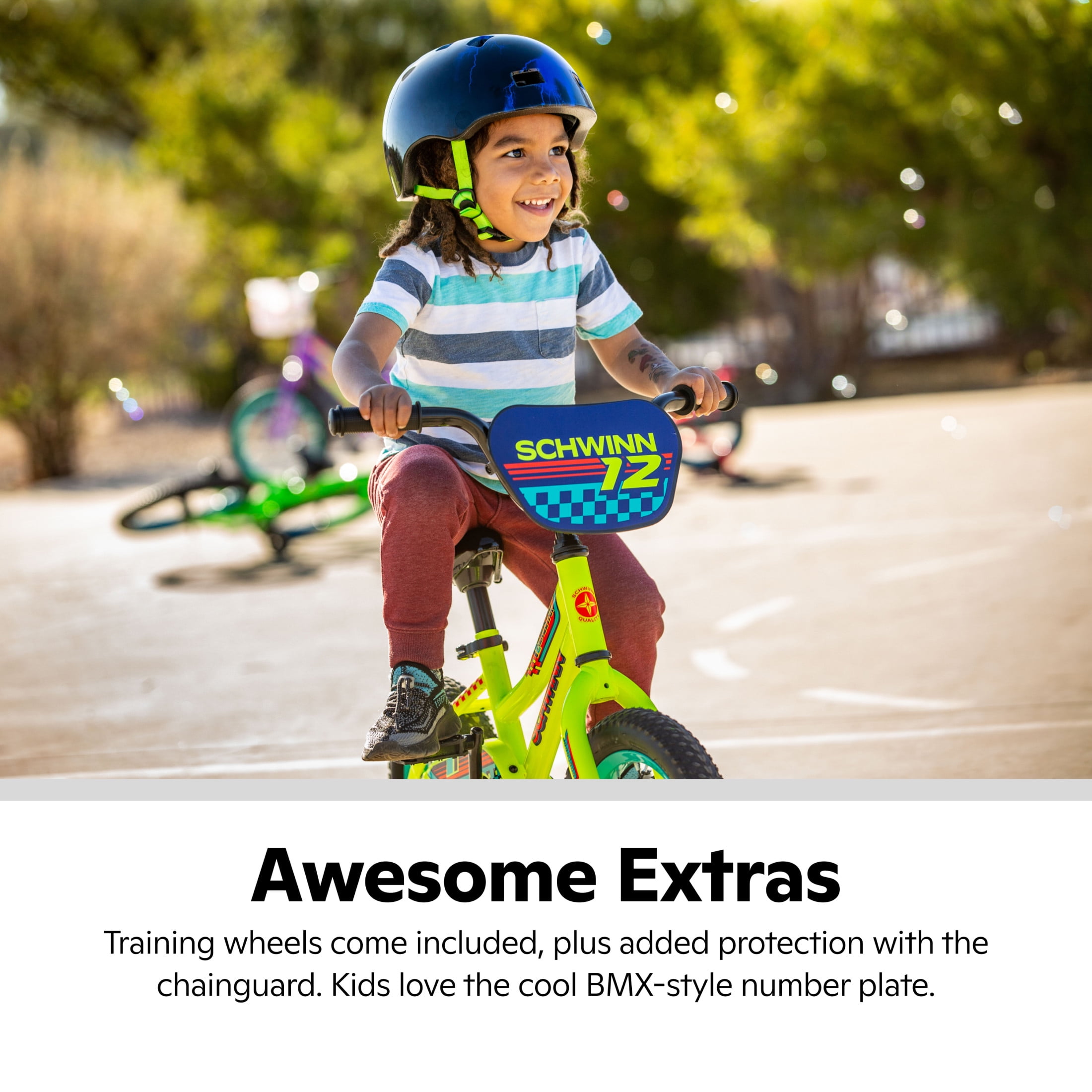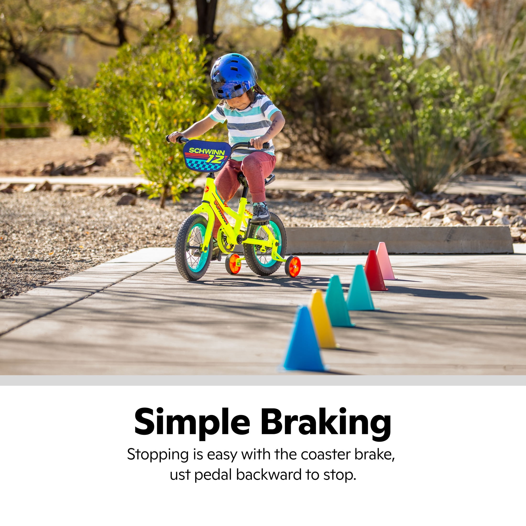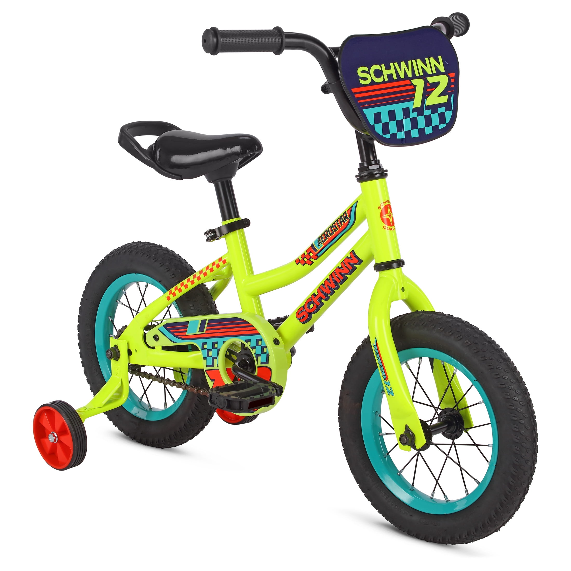 Schwinn Aerostar 12-in. Children’s Bike, Ages 2-4 Years, Yellow Learning to ride is nothing but feel-good fun with the Aerostar. With a frame designed to give kids a ride that’s actually made to fit them, it features a lower standover height. That means kids get to focus on having a blast on their bike. They also get a stopping option that’s easy and intuitive thanks to the rear coaster brake. Removable training wheels offer extra support until they’re riding confidently on their own. Other features include a quick-release seatpost for easy adjustment, a seat handle for extra guidance, a chainguard, and a stylish race plate to complete the look. Who knew learning could be this much fun? View more from us on our brand page.