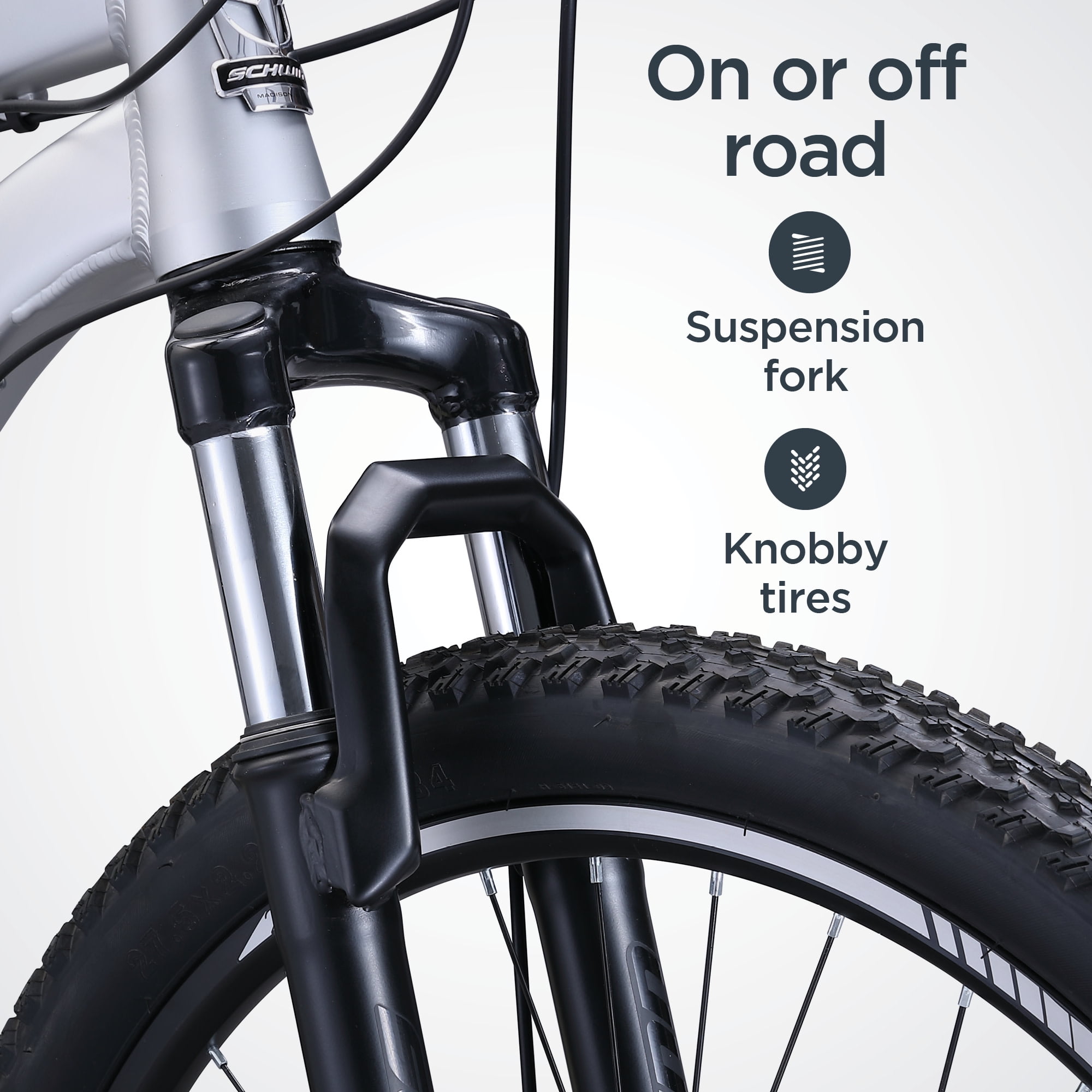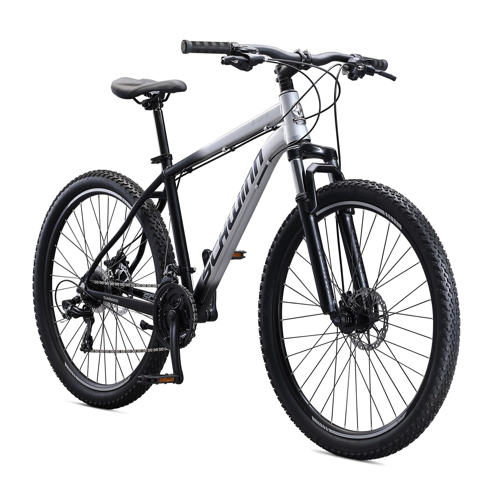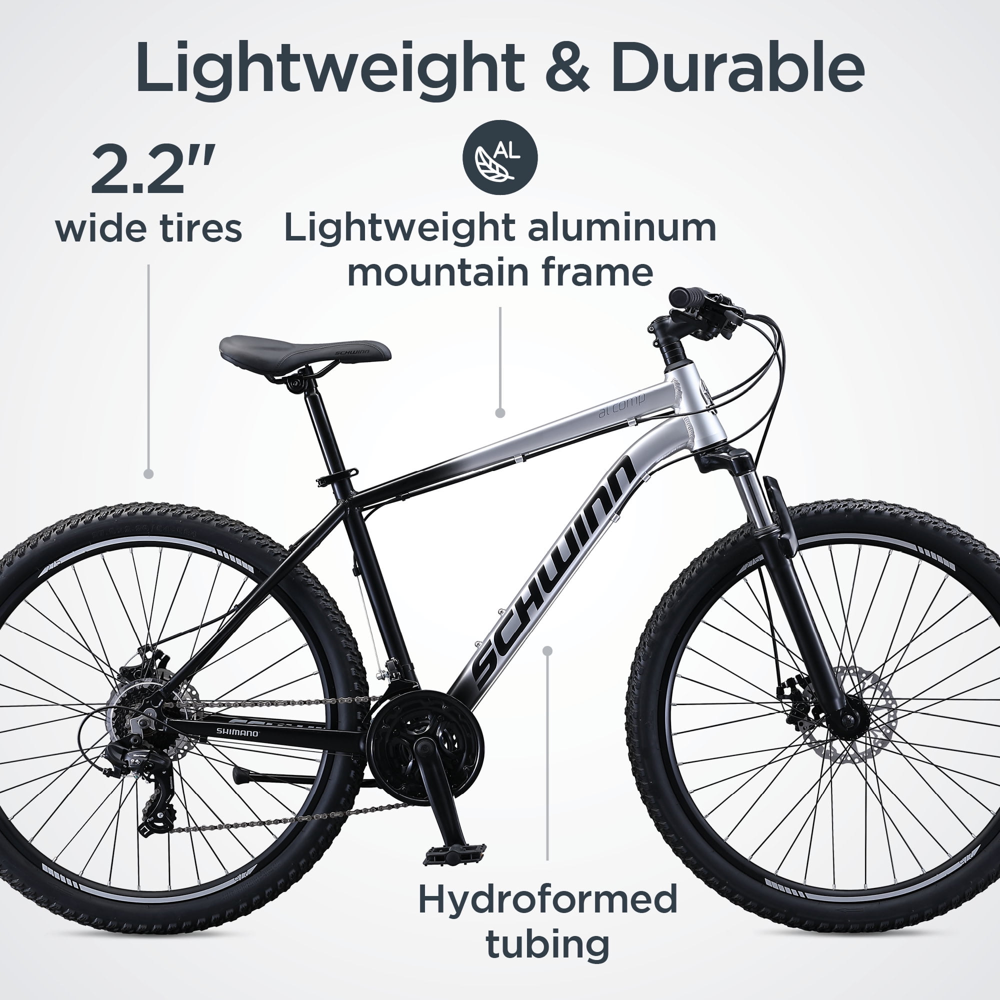 Schwinn AL Comp Mountain Bike, 27.5-in. Wheels, 21 Speed Adult Bicycle, Grey More about this bike: Get away from it all and let loose on the trail with the Schwinn AL Comp. This lightweight aluminum mountain bike features hydro-formed tubing and front suspension for a durable, responsive ride. Adapting to changing terrain is easy with the 21-speed trigger shifters, while front and rear mechanical disc brakes put you in control with all-condition stopping power. Plus, high profile alloy rims add even more lightweight strength without weighing you down. Have a blast with the AL Comp. Enjoy the freedom of riding a Schwinn. View more from us on our brand page.