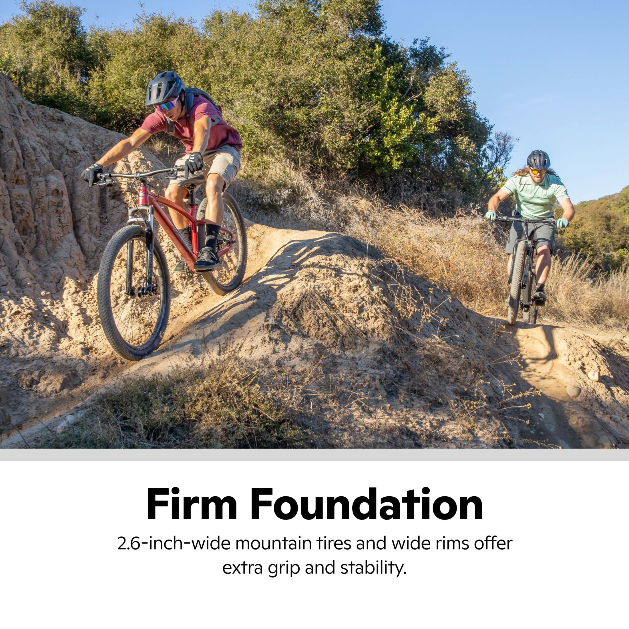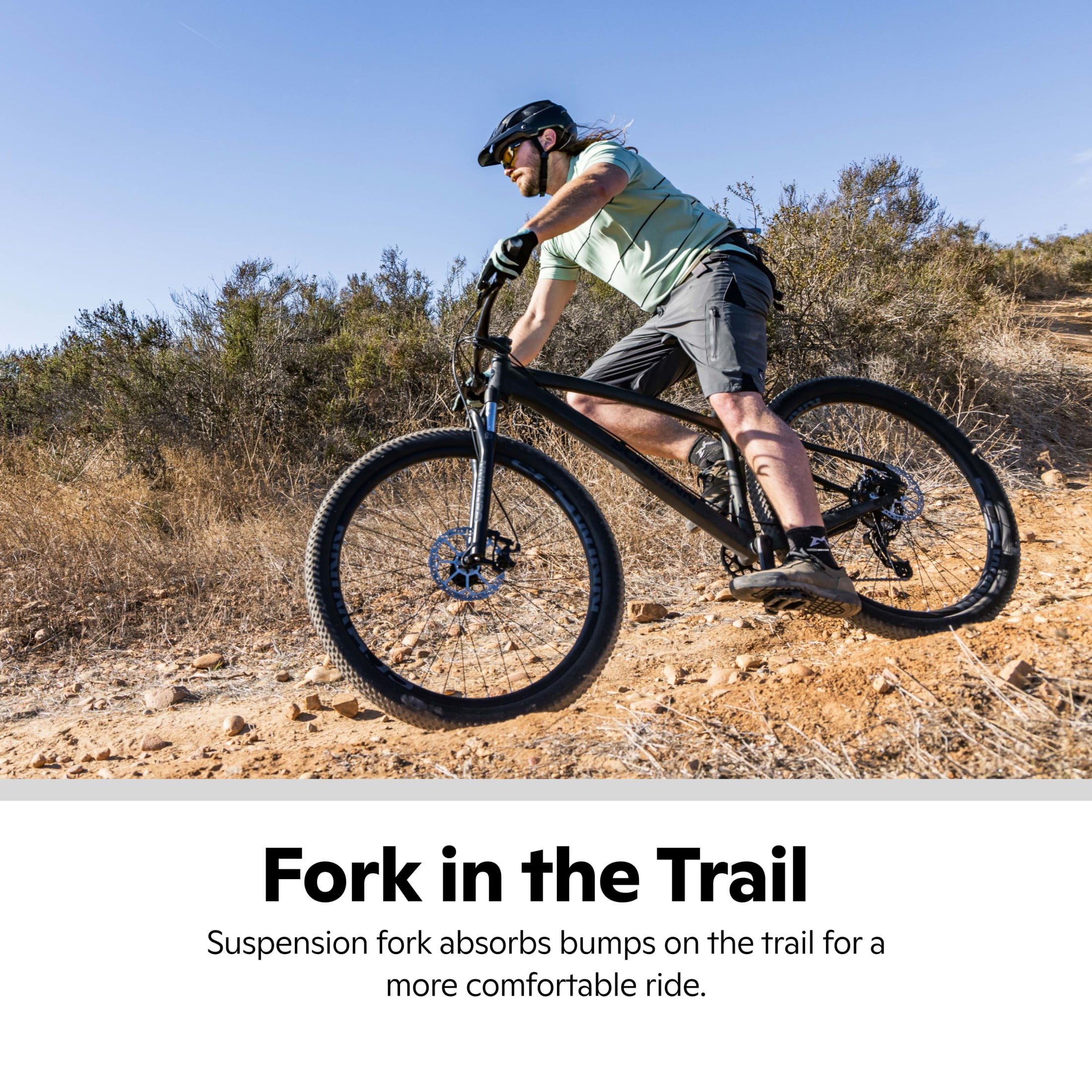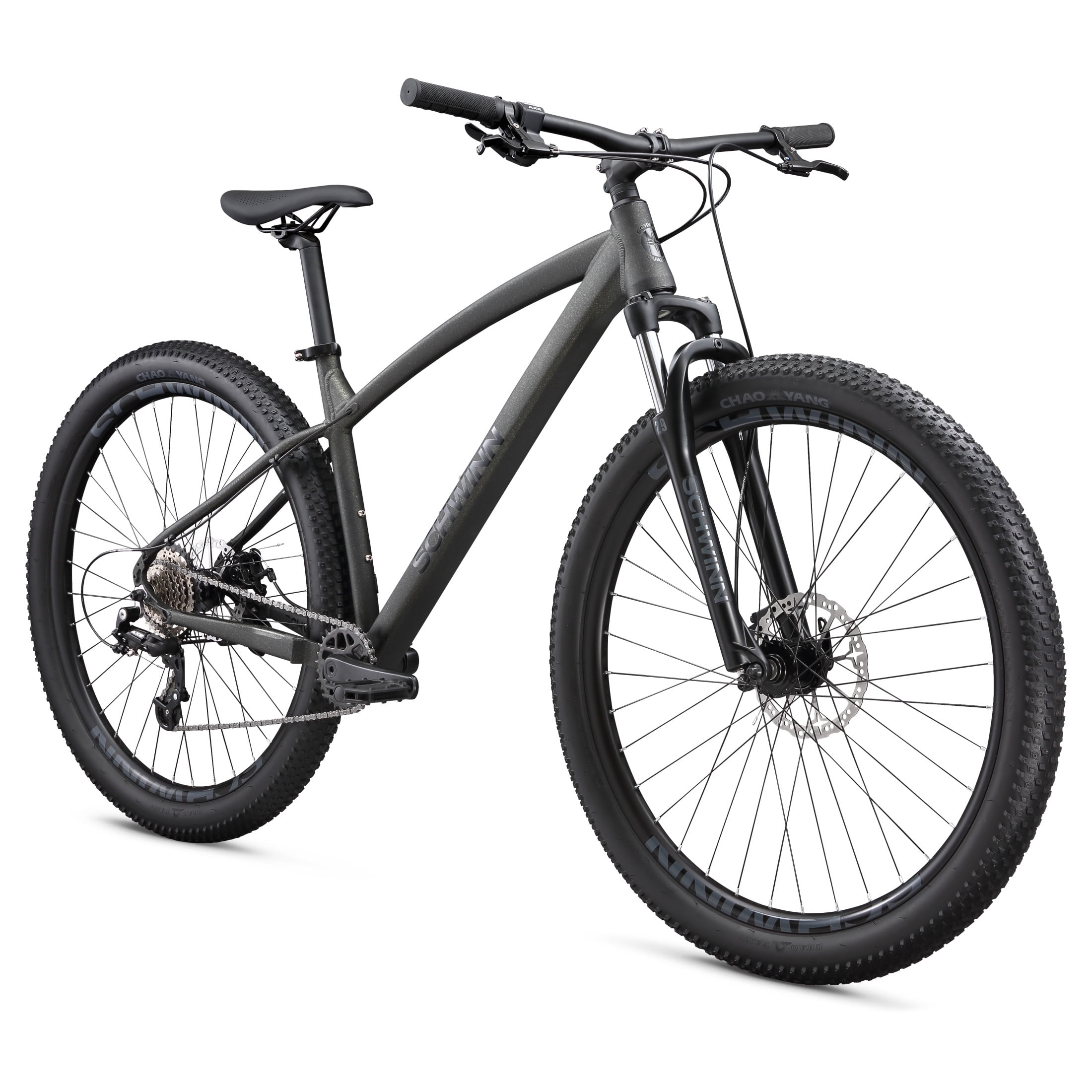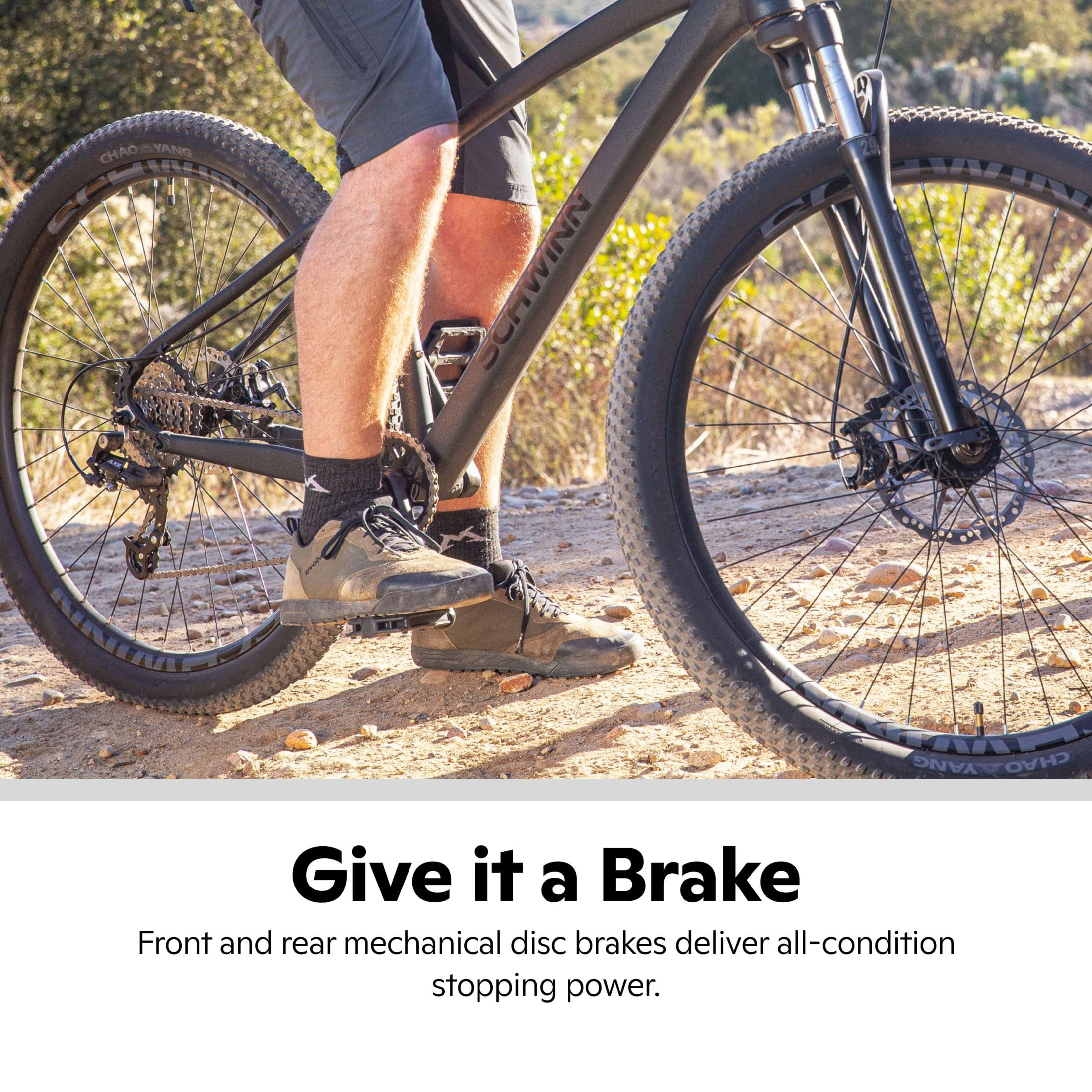 Adult mountain bike featuring a lightweight Schwinn aluminum frame and improved performance, great for rugged trails. 29-inch wheels fit riders between 5′ 4″ and 5′ 8″ tall. Unisex. Tapered head tube and dropper post routing enable easy upgrades. Suspension fork absorbs bumps on the trail for a more comfortable ride. 8-speed shifter makes it easy adapt to your terrain. Front and rear mechanical disc brakes deliver weatherproof stopping power with 180 mm front rotors and 160 mm rear rotors. 2.6-inch-wide mountain tires and wide rims offer extra grip and stability. How to Assemble a Schwinn Mountain Bike Shop All Schwinn Mountain Bikes