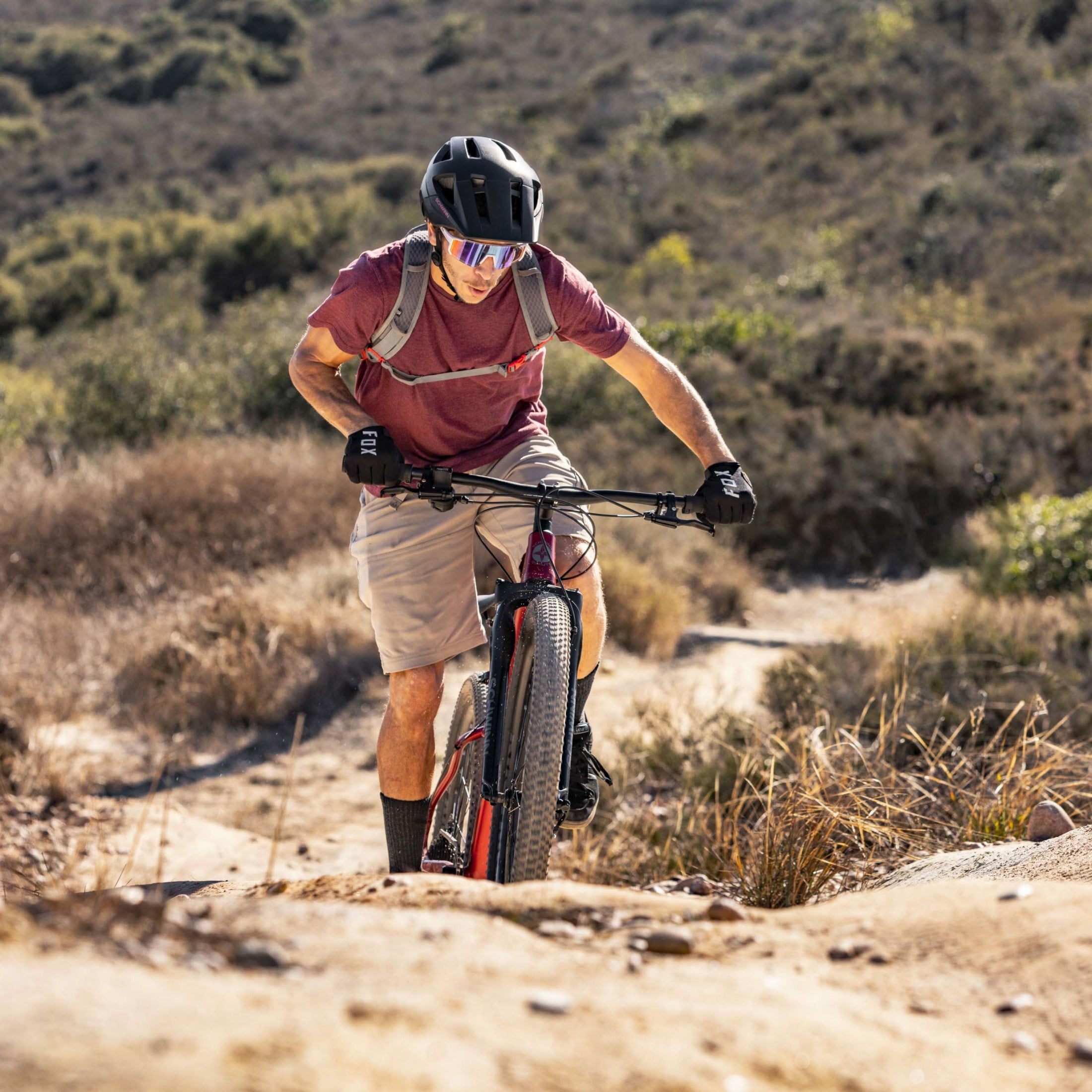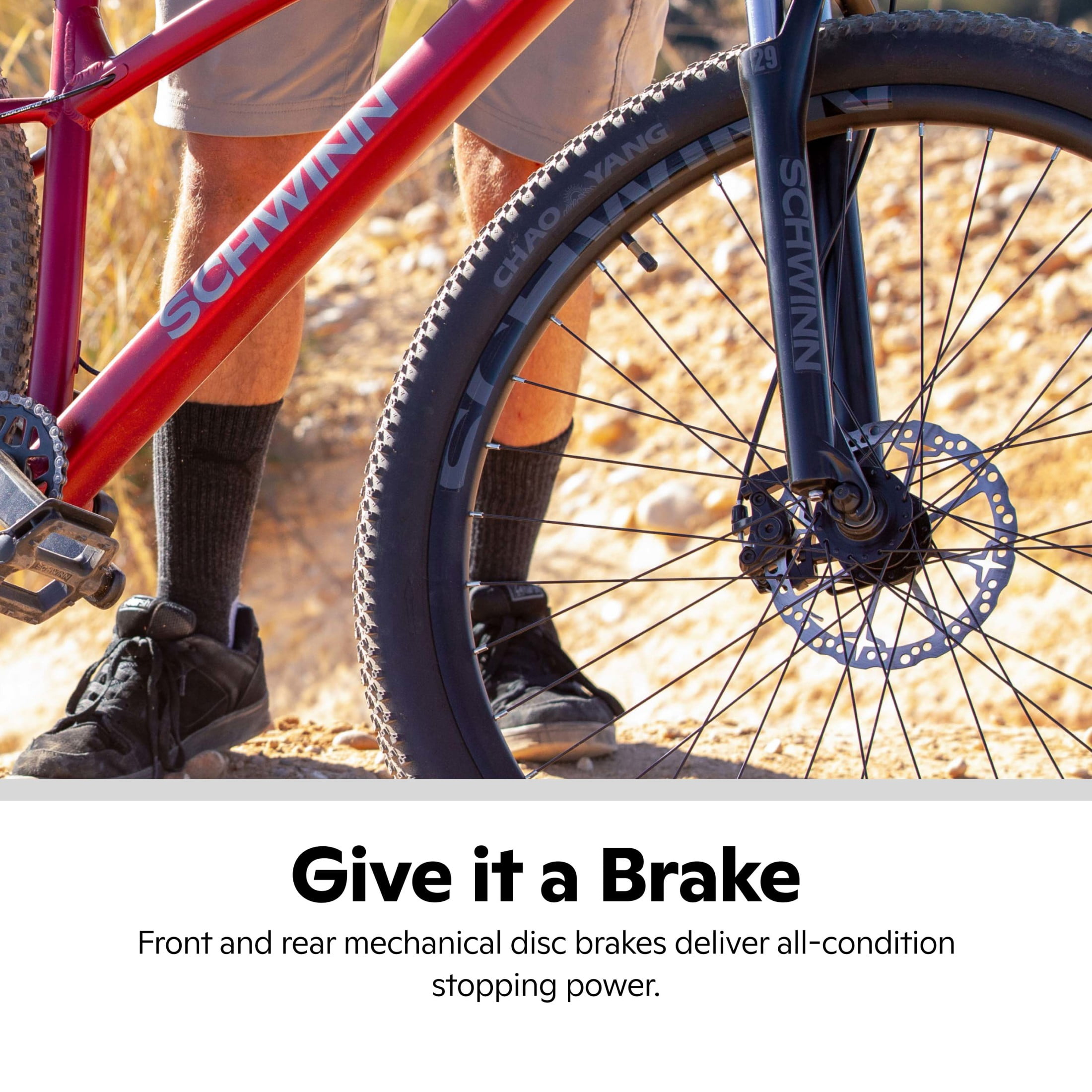 Adult mountain bike featuring a lightweight Schwinn aluminum frame and upgraded components for superior trail performance. 29-inch wheels fit riders between 5′ 8″ and 6′ tall. Unisex. Microshift Acolyte 1×8 wide range drivetrain offers responsive shifting across trail types. KS 125 mm dropper post with alloy lever allows reliable seat height adjustments at crucial moments on your ride. Suspension fork with lockout absorbs bumps on the trail for a more comfortable ride. Front and rear mechanical disc brakes deliver weatherproof stopping power with 180 mm front rotors and 160 mm rear rotors. 2.6-inch-wide mountain tires and wide rims offer extra grip and stability. How to Assemble a Schwinn Mountain Bike Shop All Schwinn Mountain Bikes