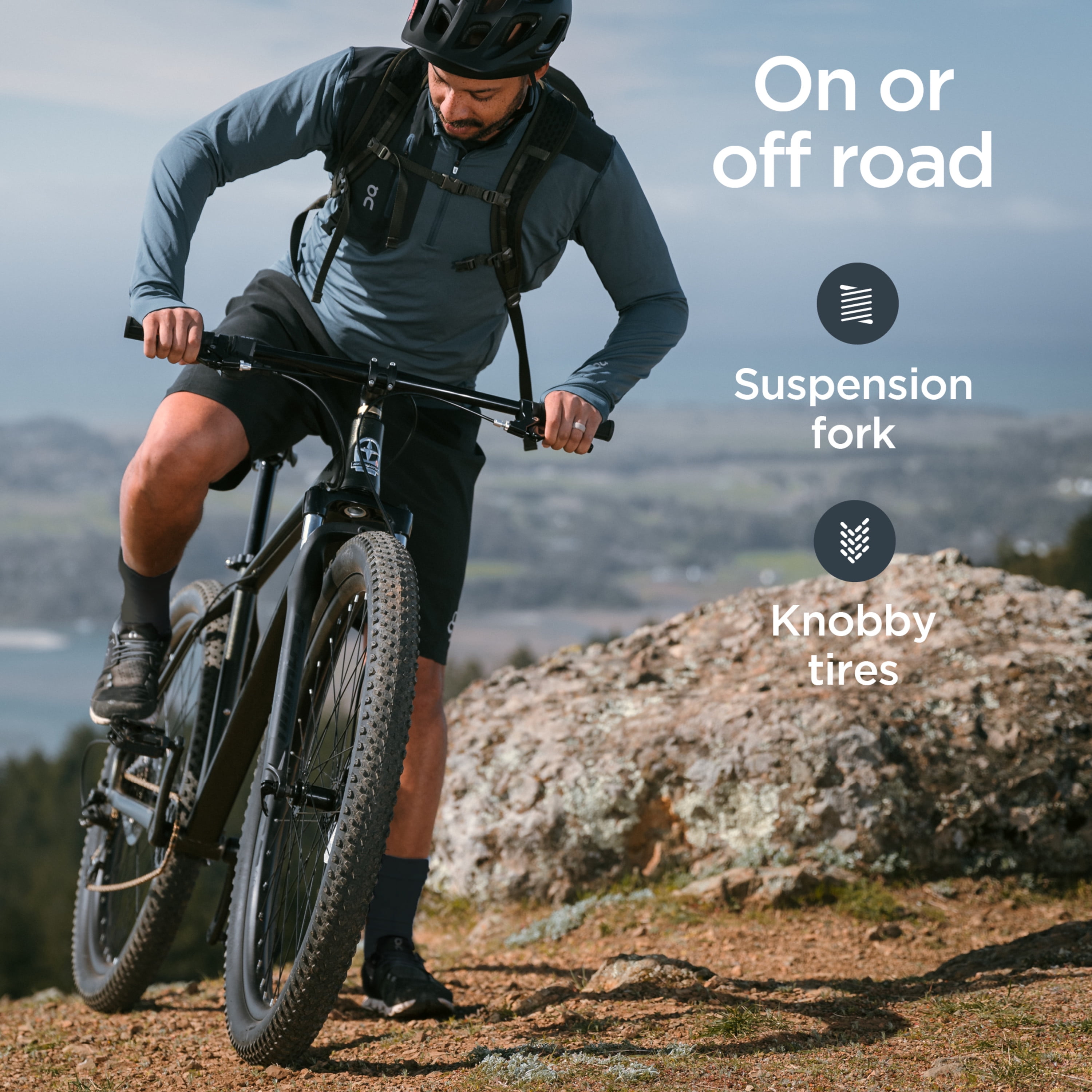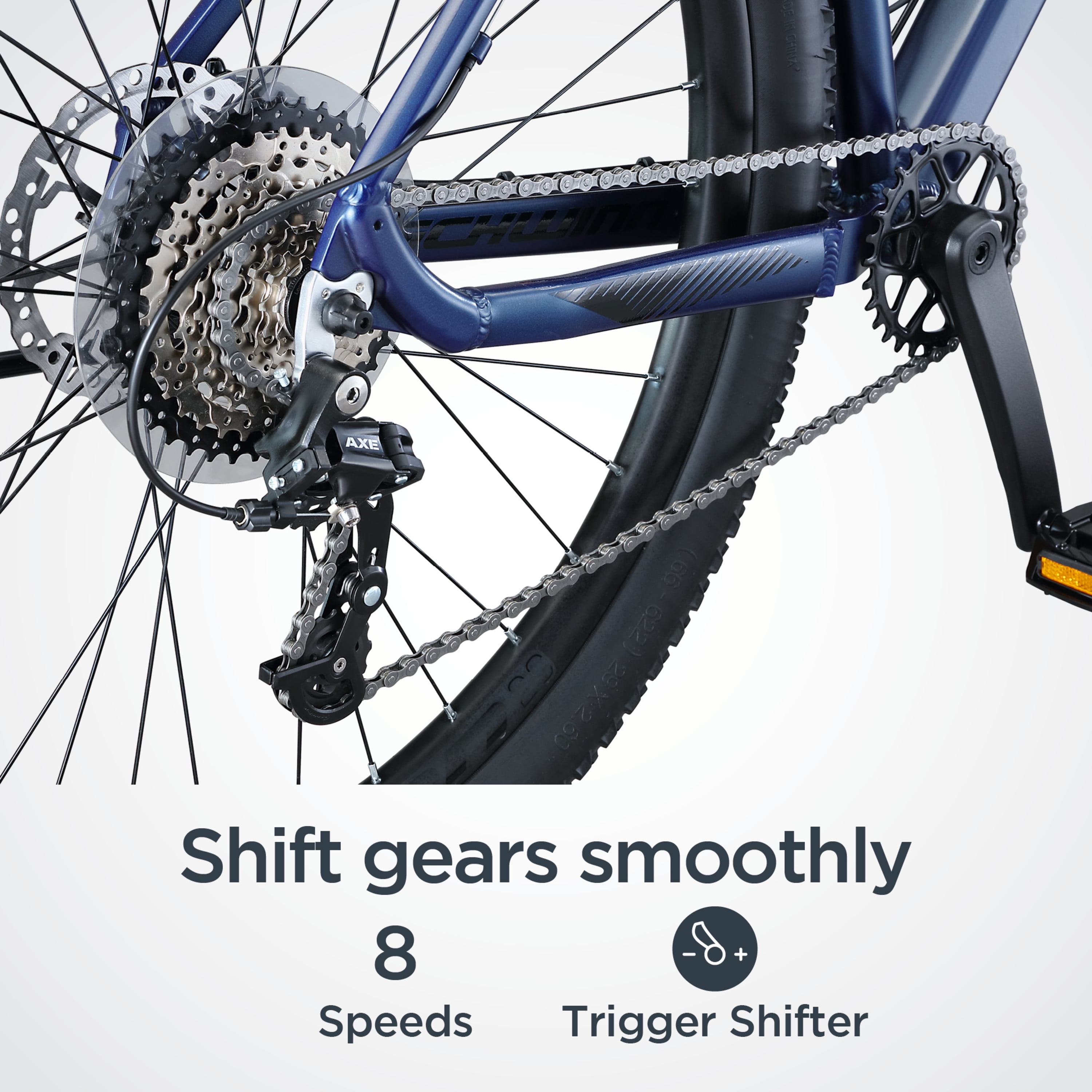 Mountain bike featuring a light Schwinn aluminum frame with suspension fork, great for rugged trails and casual rides. 100 mm travel front suspension fork with lockout absorbs bumps on the trail for a more comfortable ride. Mechanical, KS EXA 900i, 125 mm travel, dropper post makes it easy to adjust your seat height as you ride for optimal performance. 8 speeds with trigger shifters make it easy to adapt to your terrain. Front and rear mechanical disc brakes deliver superior stopping power. Alloy double wall rims provide lightweight durability while 2.6 inch wide mountain tires let you roll over just about anything. 29-inch wheels fit riders 64 to 74 inches tall.