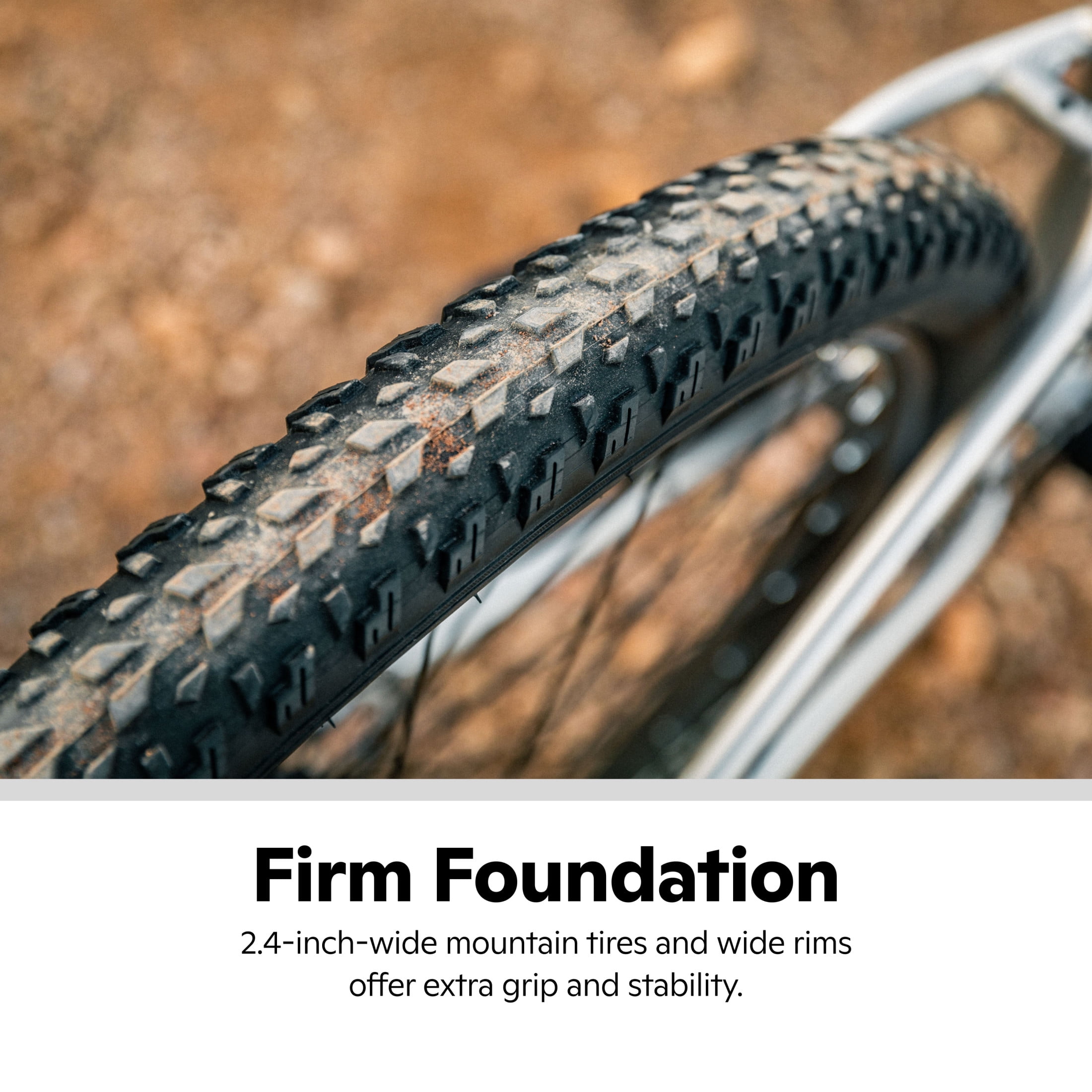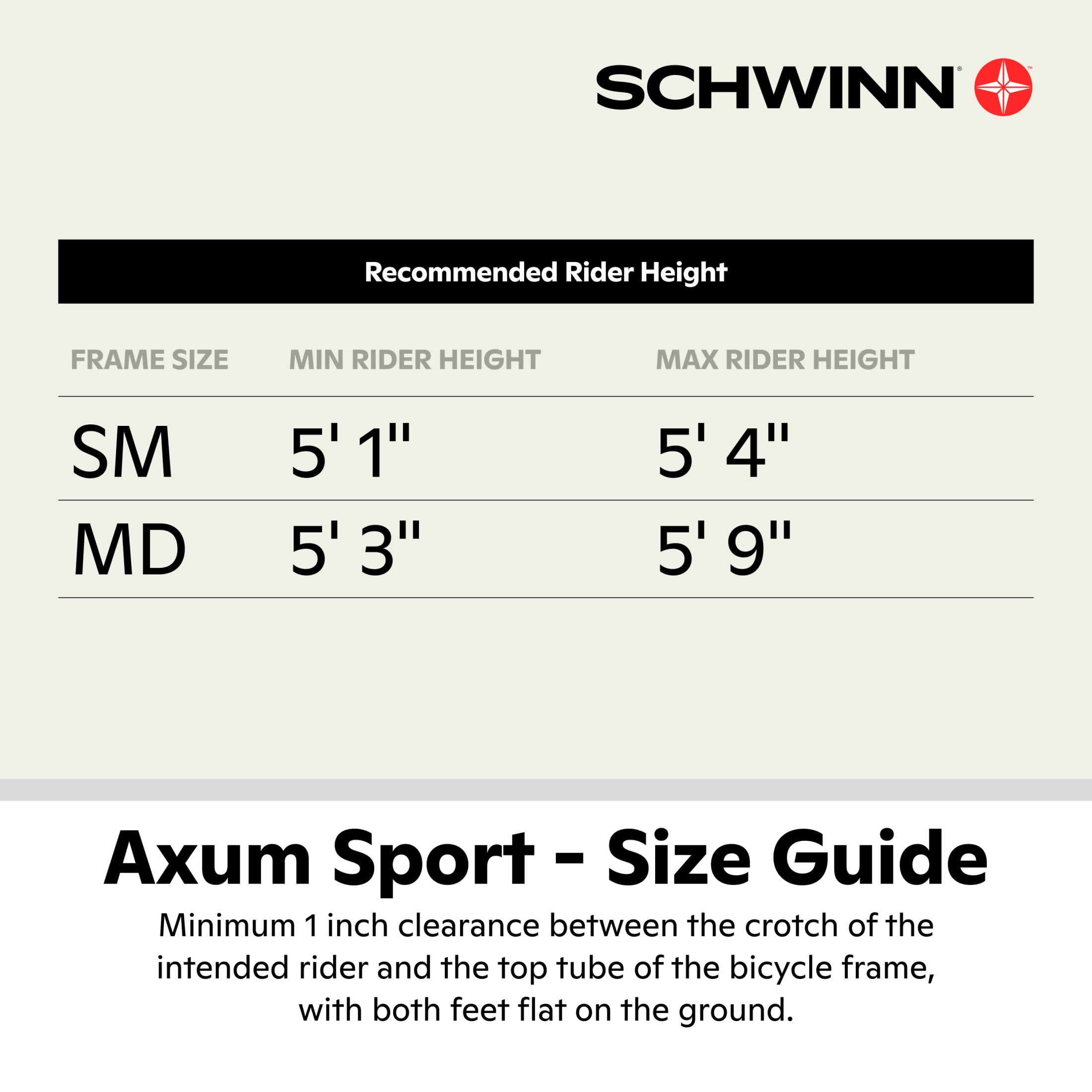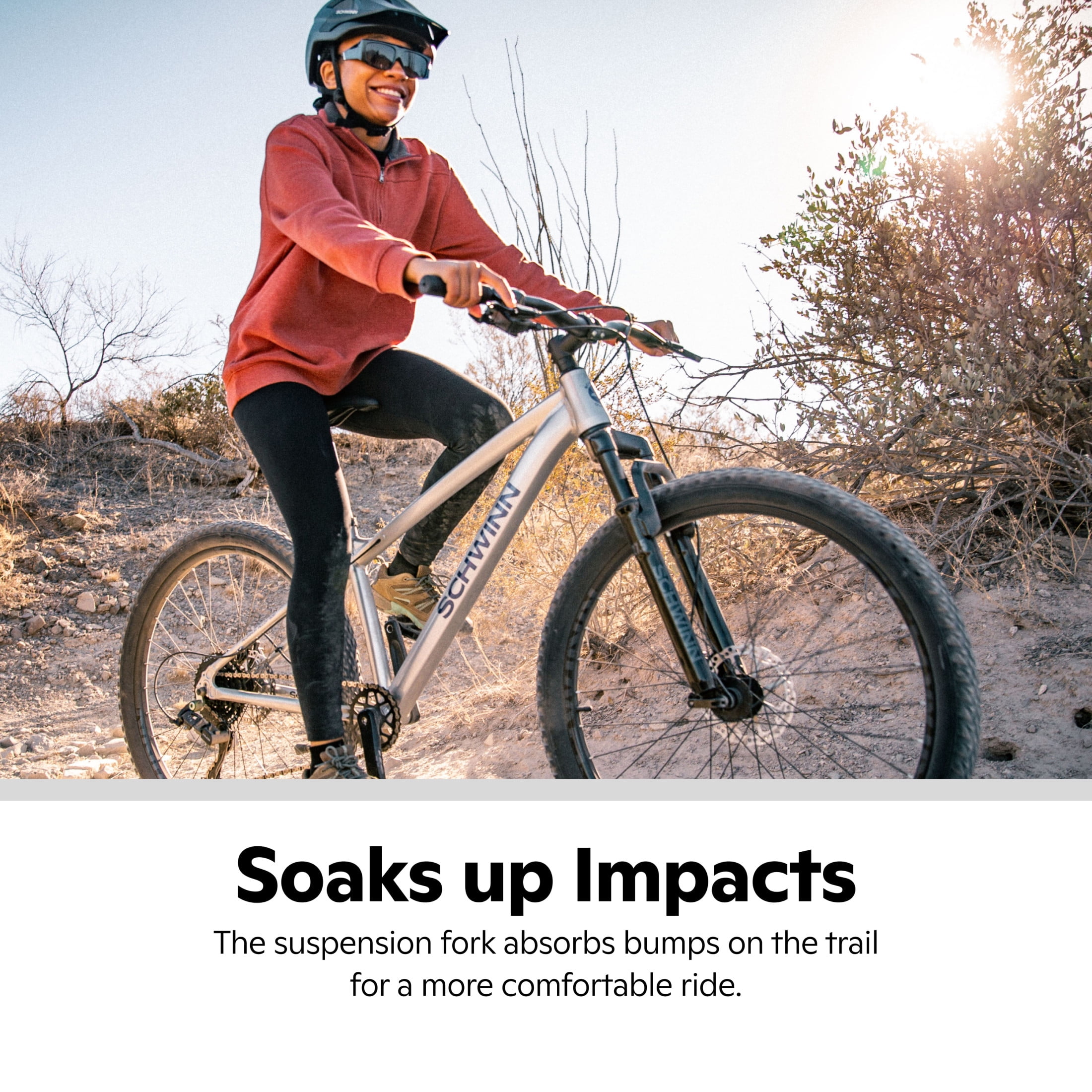 Adult mountain bike featuring a lightweight aluminum frame that adheres to modern performance mountain biking standards for a truly off-road capable machine. 27.5-inch wheels fit riders 5’ 1” to 5’ 5” tall. Tapered head tube and dropper post routing enable easy upgrades. Suspension fork absorbs bumps on the trail for a more comfortable ride. 7-speed shifter makes it easy to adapt to your terrain. Mechanical disc brakes deliver weatherproof stopping power with 160 mm rotors. 2.4-inch-wide mountain tires and wide rims offer extra grip and stability. Shop All Schwinn Mountain Bikes Schwinn Axum Sport 27.5 Mountain Bike Review-KevCentral
