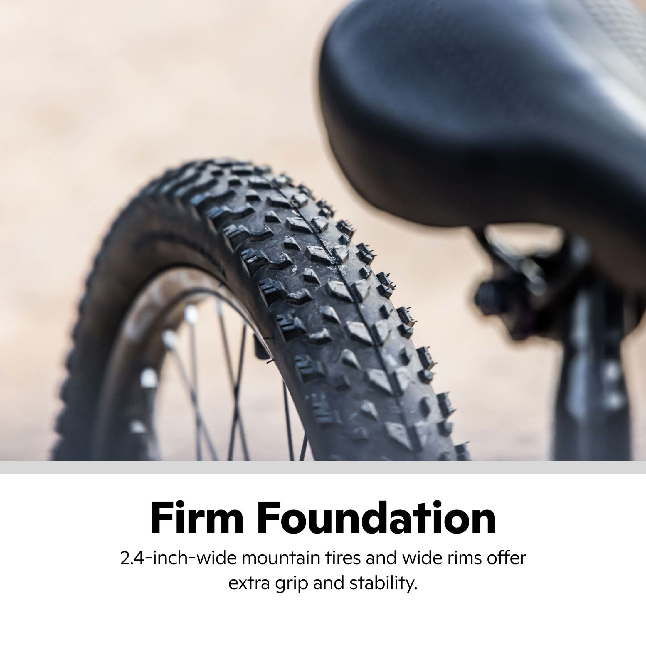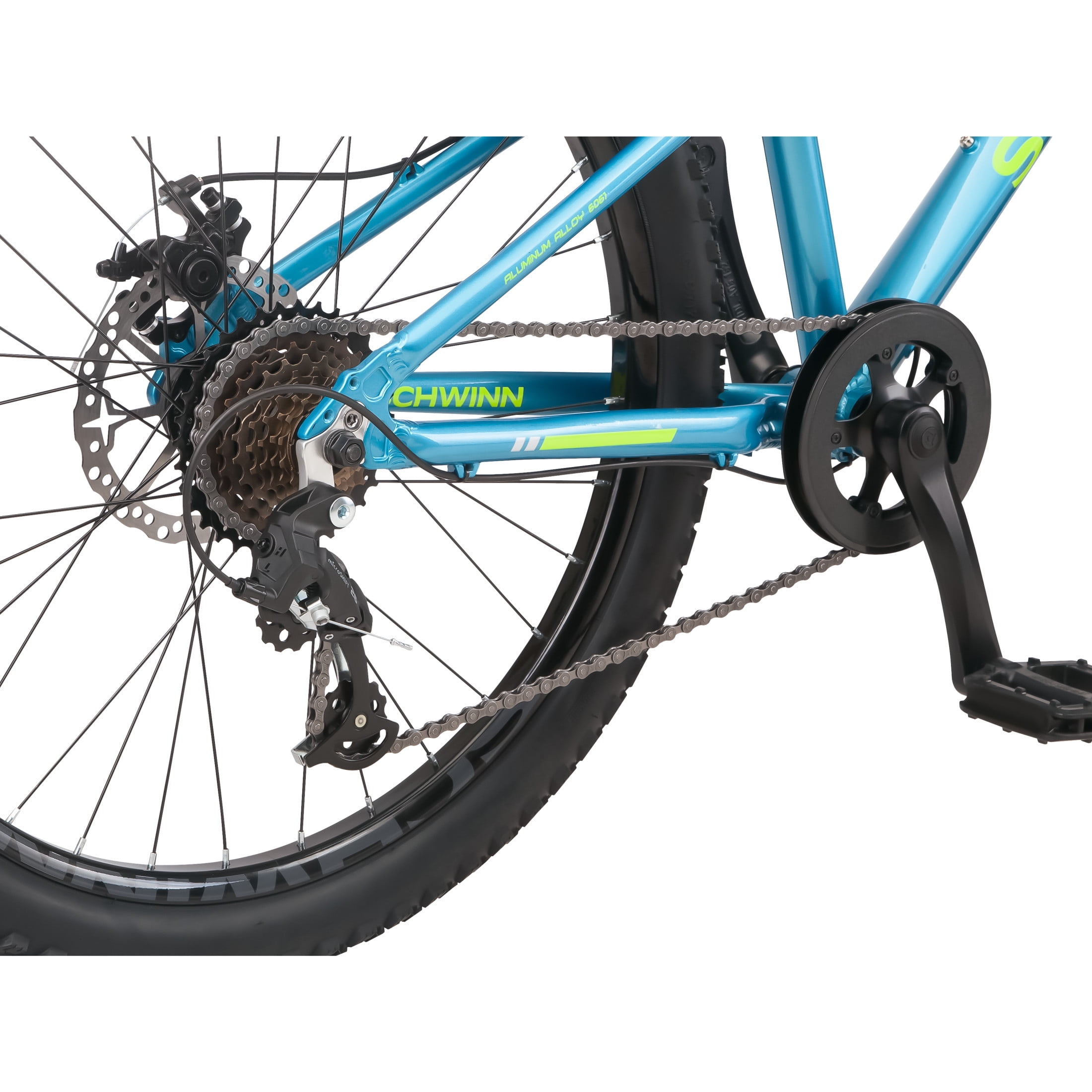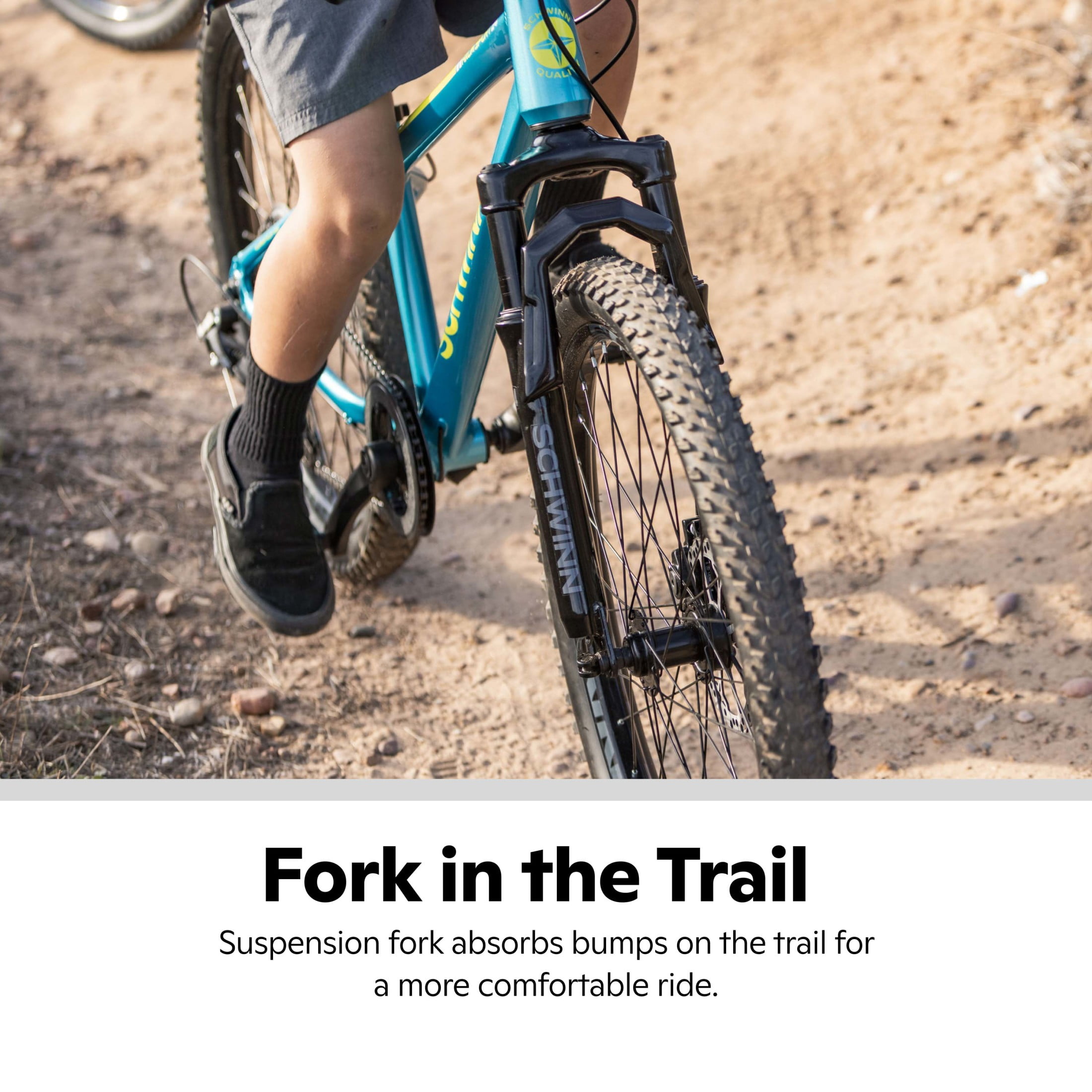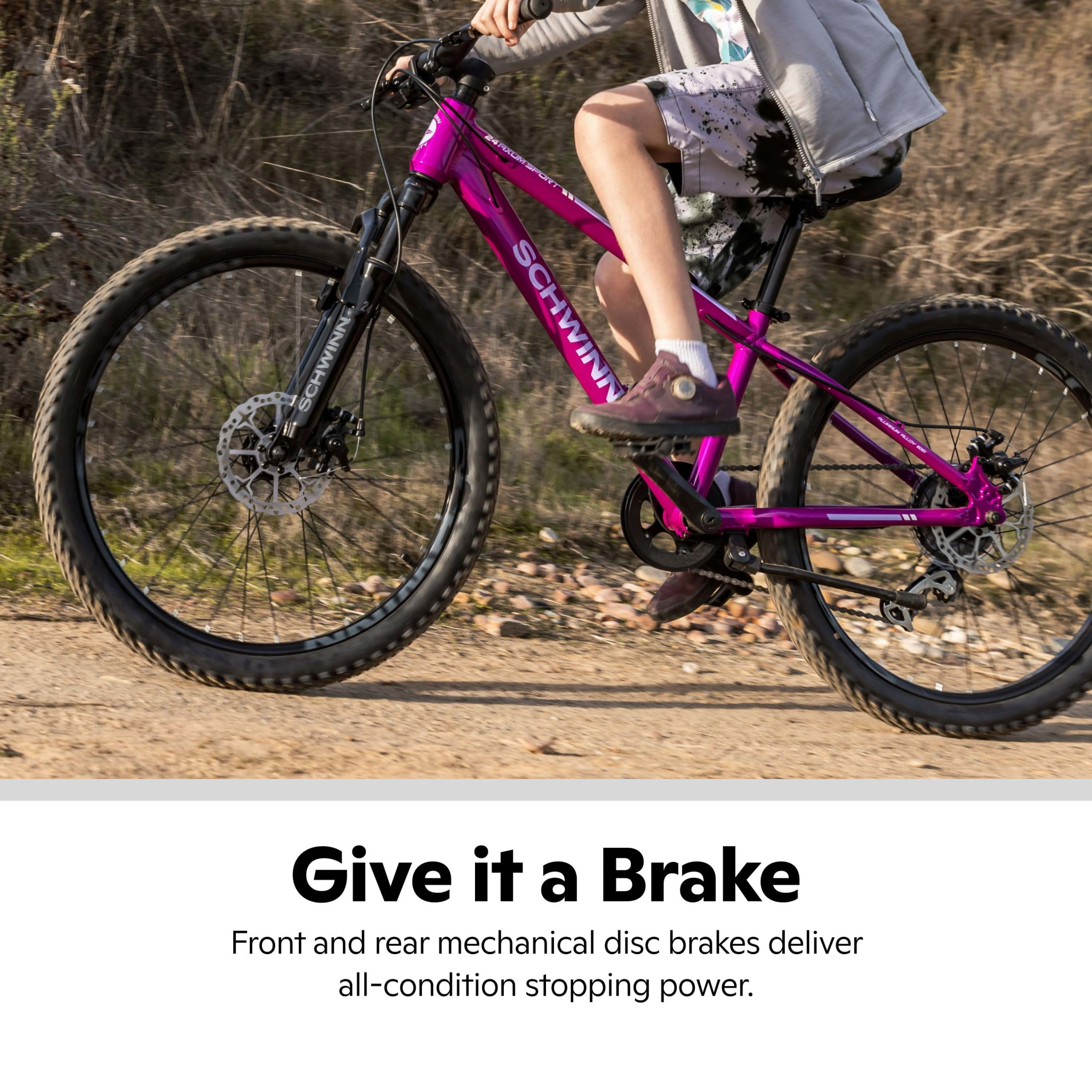 Kids’ mountain bike featuring a lightweight Schwinn aluminum frame, great for rugged trails and casual rides. 24-inch wheels fit riders between 4’4″ and 4’9″ tall. Unisex. Internal cable routing makes for a smoother look and protects cables from dirt and debris. Suspension fork absorbs bumps on the trail for a more comfortable ride. 8-speed shifter makes it easy adapt to your terrain. Front and rear mechanical disc brakes deliver weatherproof stopping power with 180 mm front rotors and 160 mm rear rotors. 2.4-inch-wide mountain tires and wide rims offer extra grip and stability. How to Assemble a Schwinn Mountain Bike Shop All Schwinn Mountain Bikes