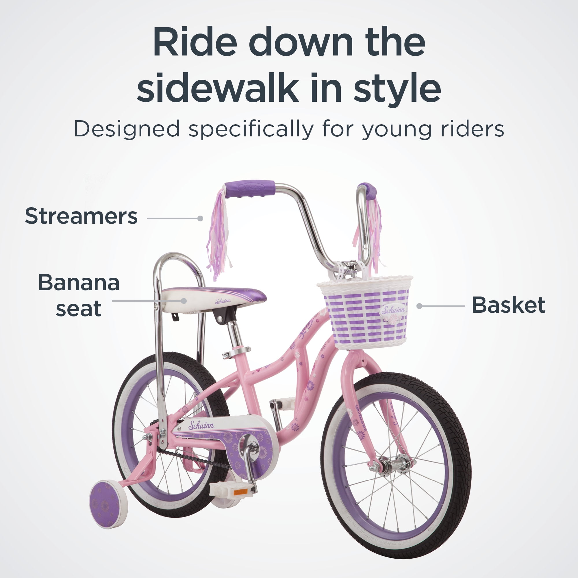 Schwinn SmartStart steel kids frame with rigid fork, designed to give kids a better fit and more stable ride Narrow kid-specific Q-factor fits the body width of the child for easier pedaling and handling Rear coaster brake provides intuitive, reliable stopping power Tool-free adjustable seat post provides room to grow. Includes removable training wheels and front basket to carry their favorite toys