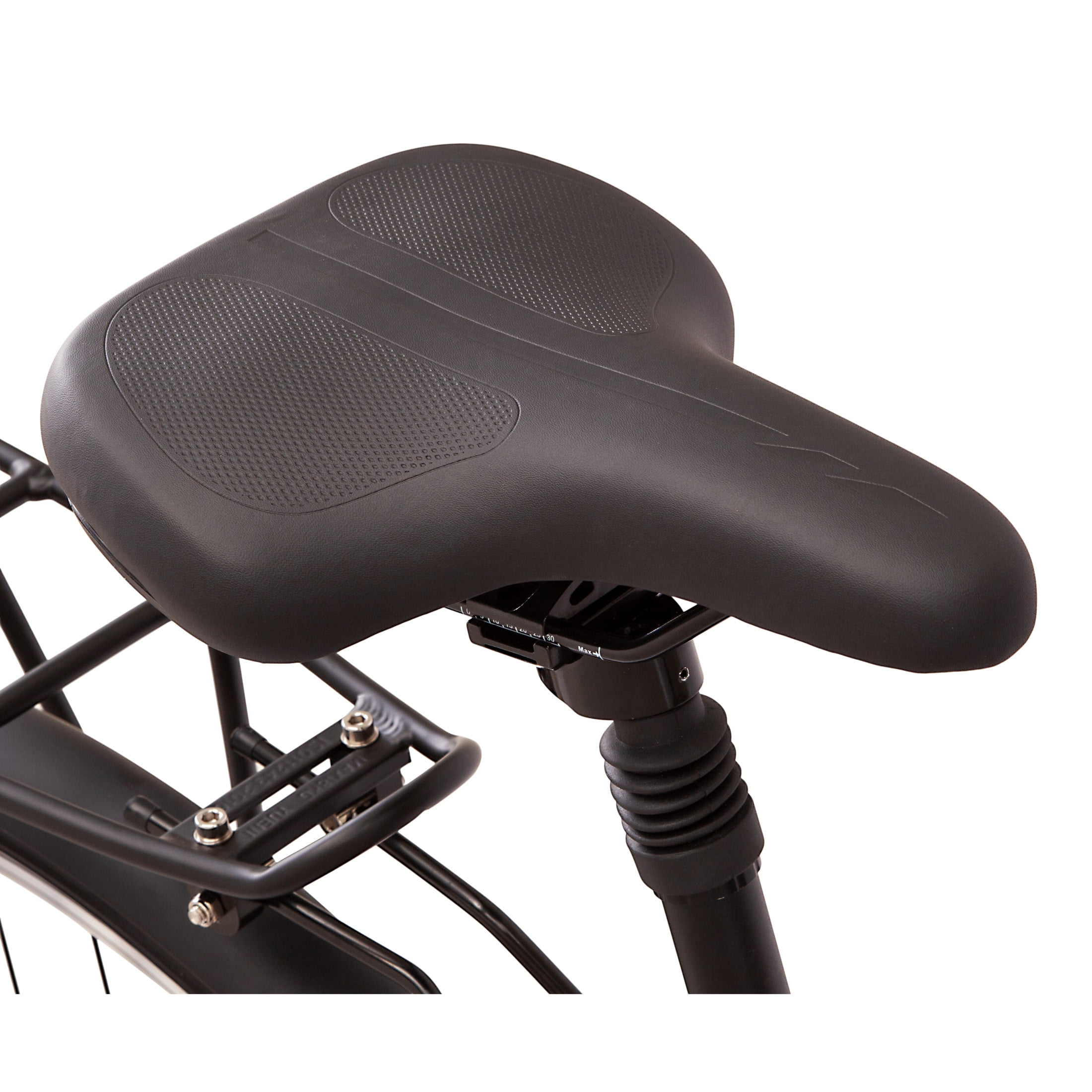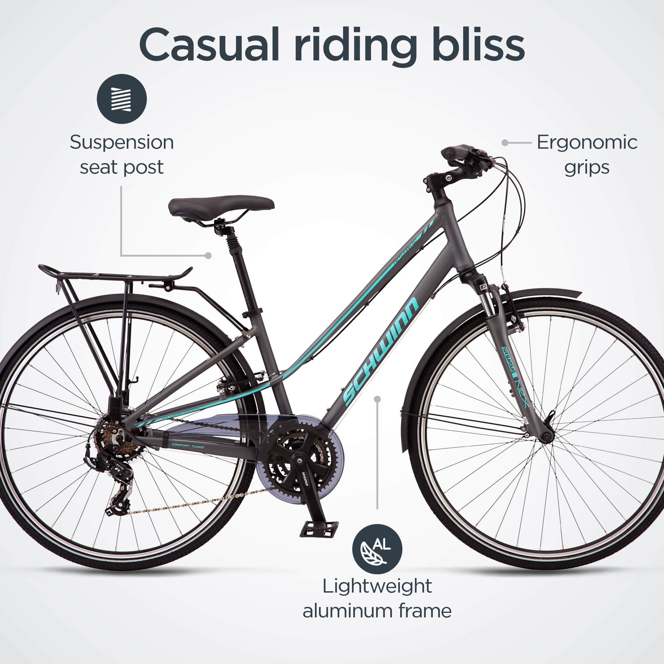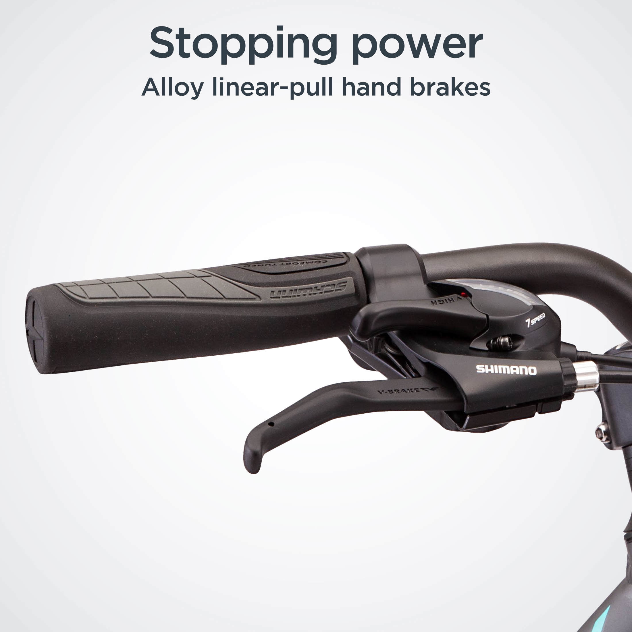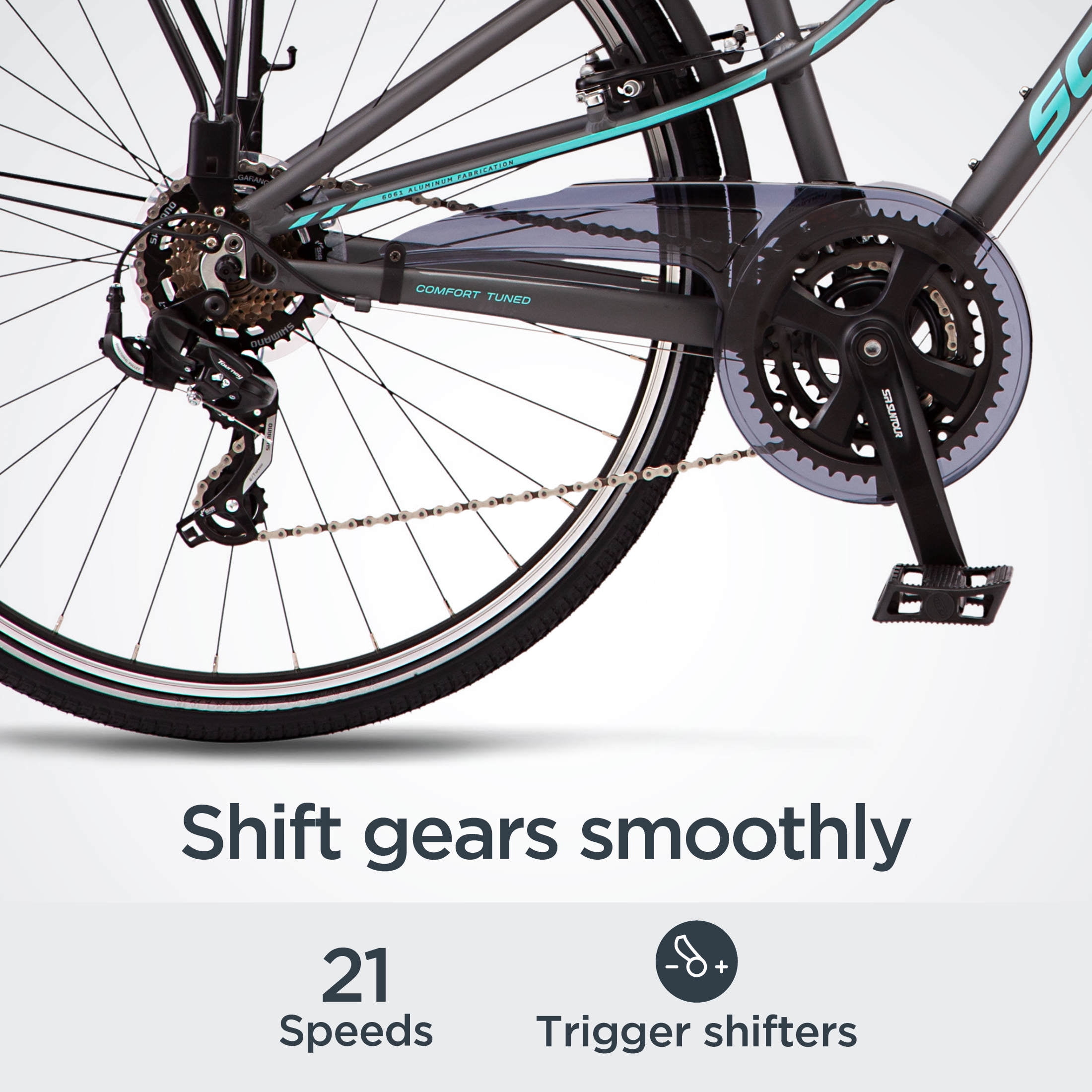 Schwinn alloy hybrid frame and SR Suntour suspension fork provide a smooth ride. 21-speed trigger shifters with front and rear derailleurs offer precise gear changes. Alloy linear pull brakes deliver exceptional stopping power. Suspension seat post and swept back handlebar provide comfortable riding position. Frame size is determined from seat tube length
