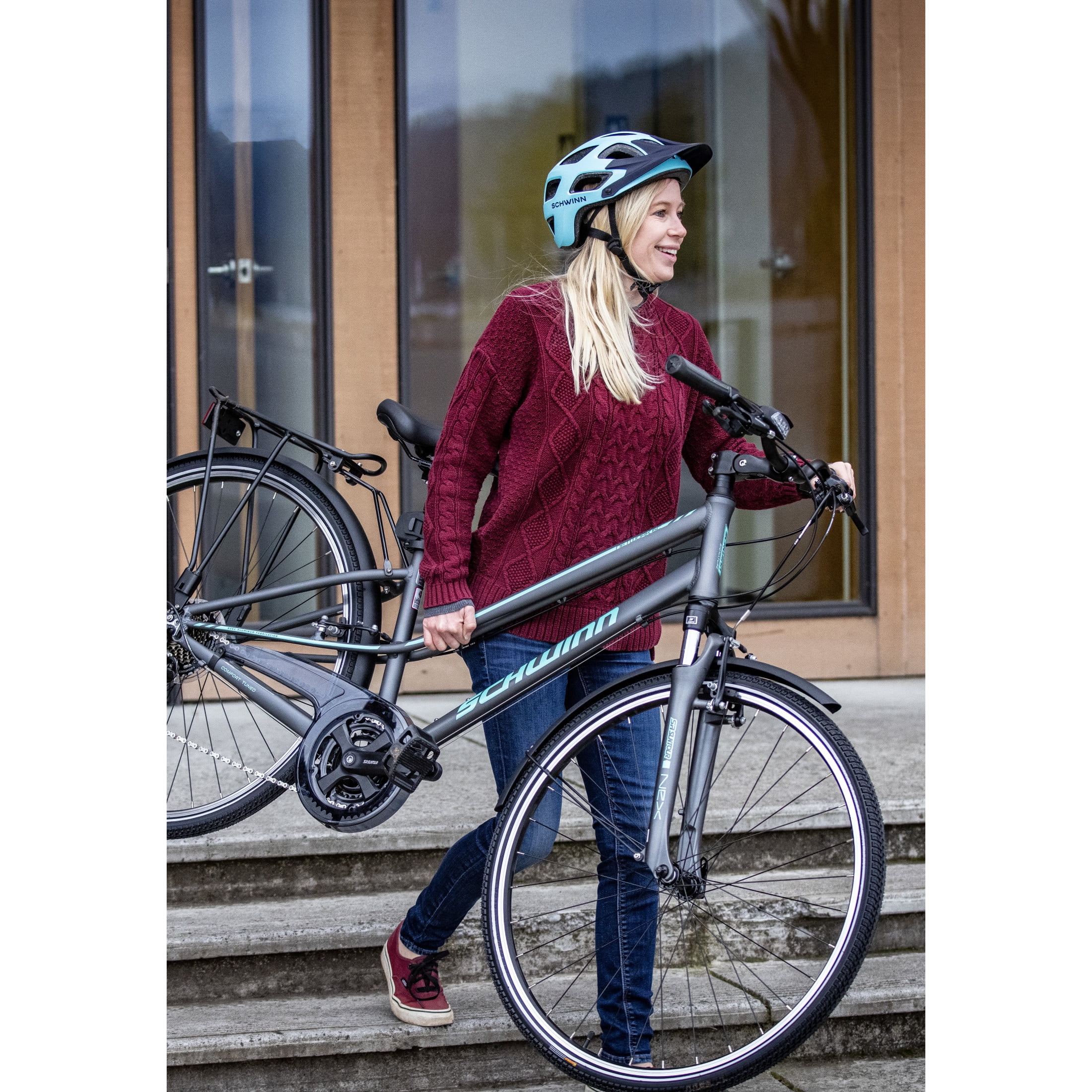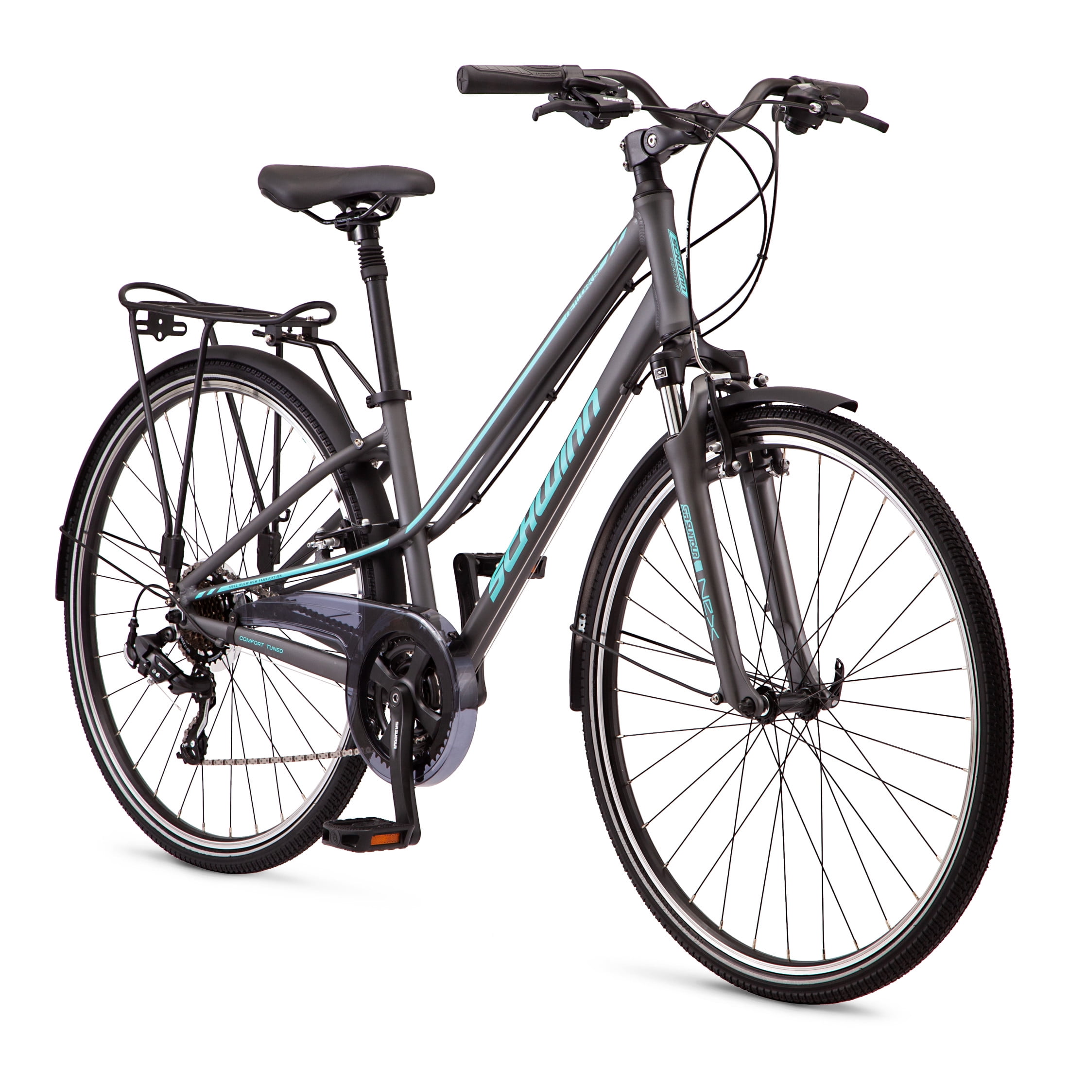 Schwinn Network 6c Hybrid Bike, 21 Speeds, Medium 15.5″ Womens Style Frame, 700c Wheels, Grey Enjoy comfortable, efficient riding with the Network 6c hybrid bike by Schwinn. The Network 6c features an alloy hybrid frame and suspension fork for a smooth ride – perfect for around the neighborhood, down the bike path, or on your morning commute. 21-speed trigger shifters with front and rear derailleurs offer precise gear changes, while alloy linear pull brakes deliver exceptional stopping power. The Network 6c includes an suspension seat post and swept back handlebar for comfortable riding position, as well as a Schwinn hybrid elastomer spring saddle and ergonomic grips to add extra comfort at contact points. Plus, alloy high-rise rims add strength without weighing you down. Like all Schwinn bikes, the Network 6c comes with a limited lifetime warranty for as long as you own the bike. Get out and ride with the Network 6c. Enjoy the freedom of riding a Schwinn. View more from us on our brand page.