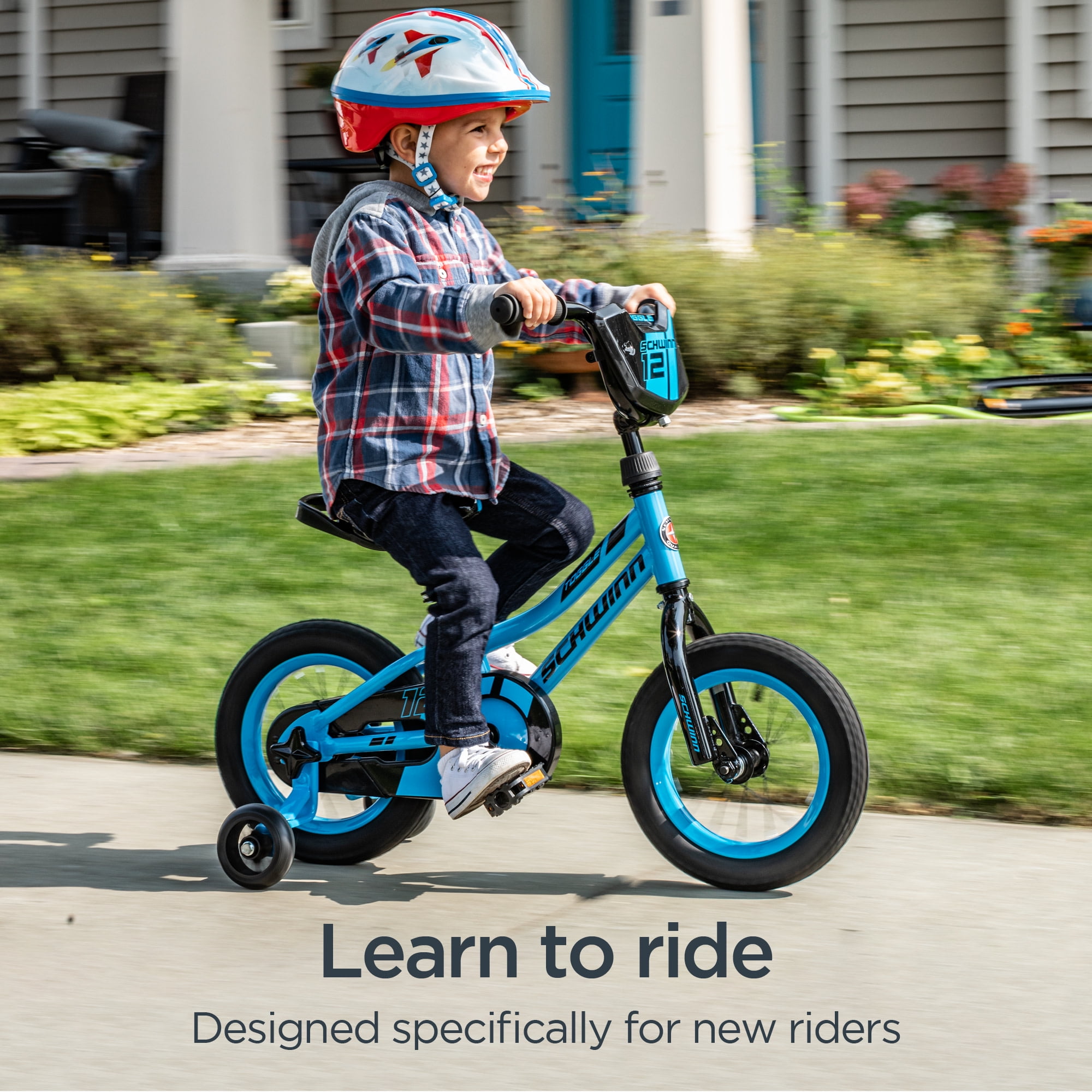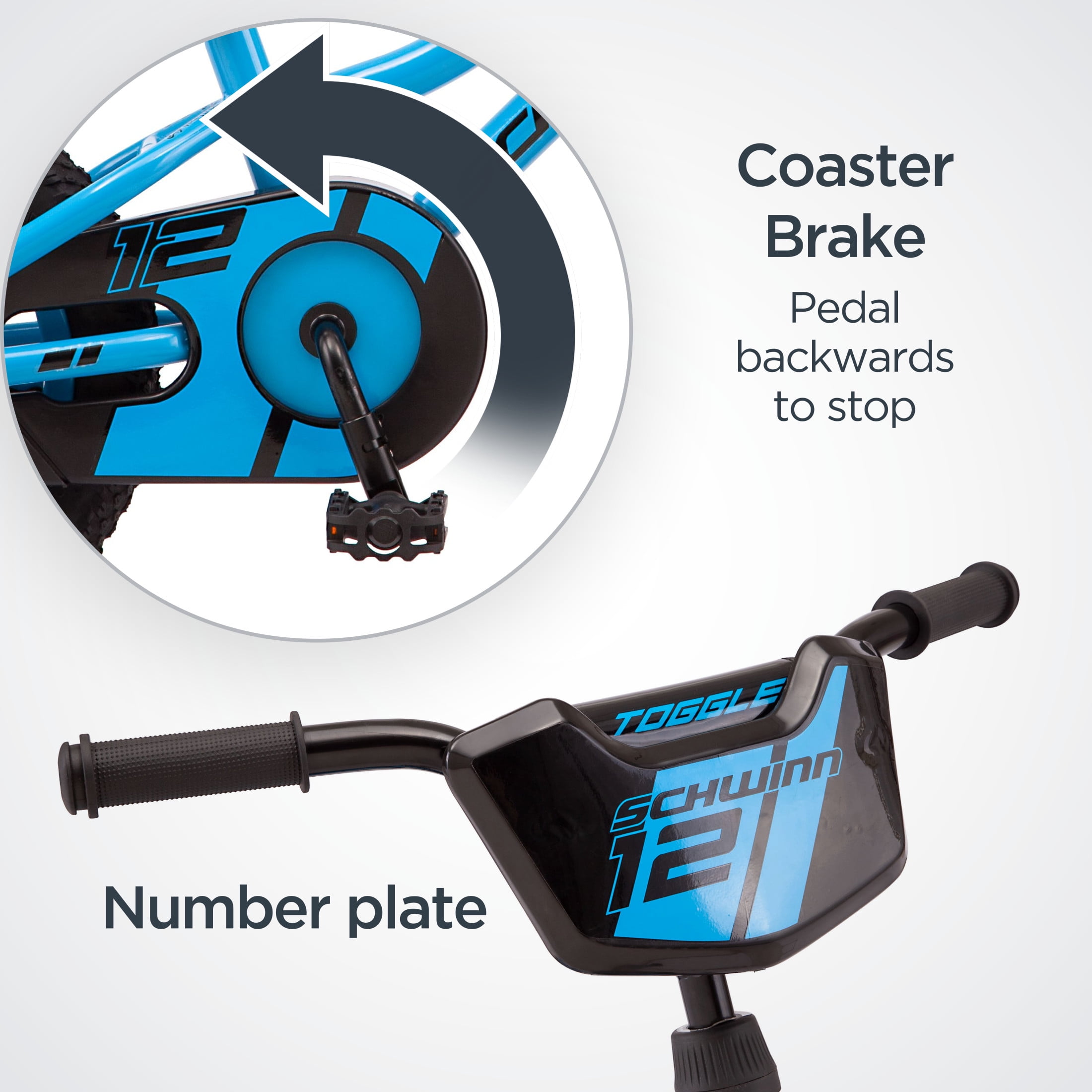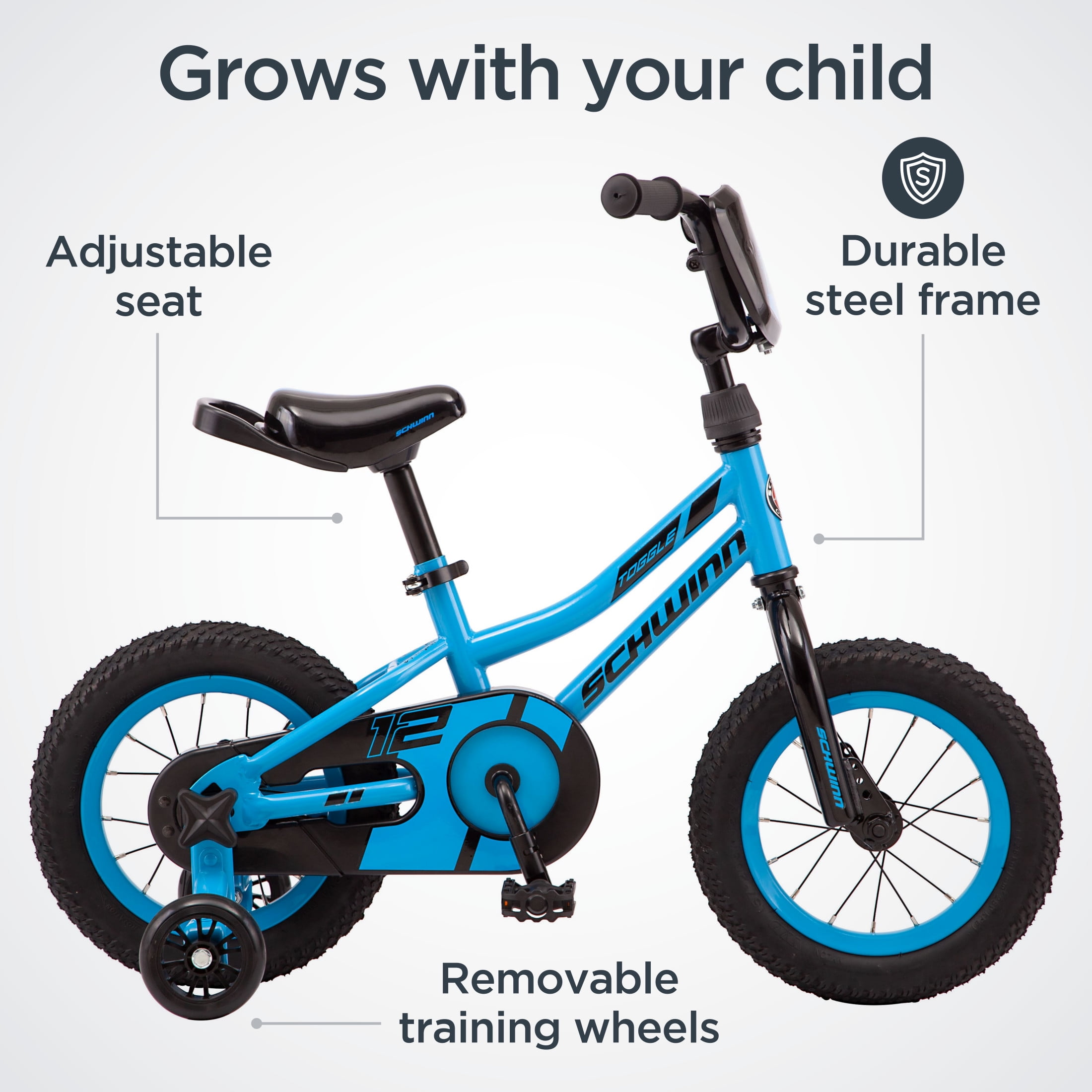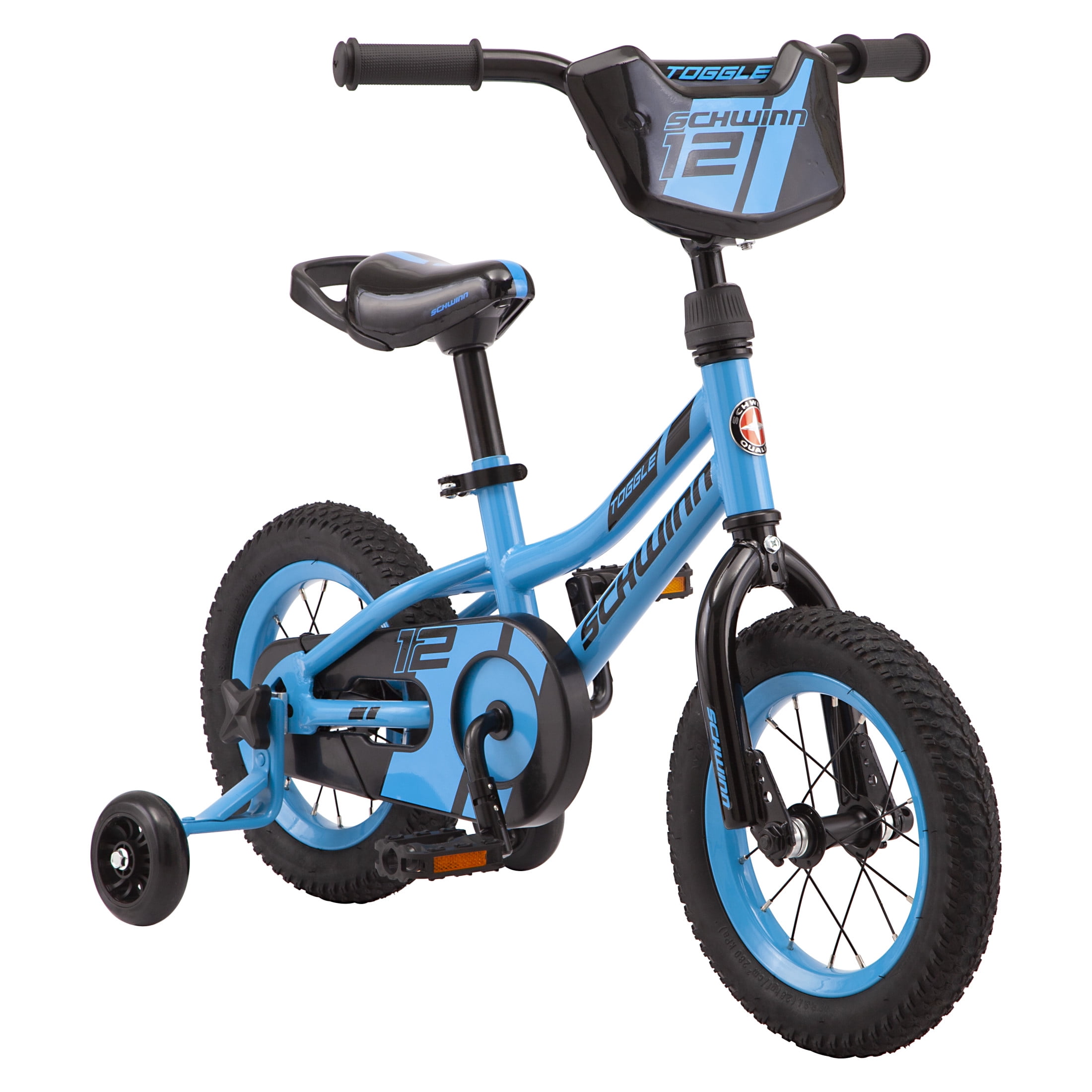 Toggle Quick Build Kids’ Boys’ 12-in. Bike, BlueStart your child on a cycling adventure with the Toggle kids’ bike by Schwinn. Featuring a Schwinn SmartStart steel frame, the Toggle is lightweight with narrower pedal positions, and smaller grips to provide a more stable, confidence-building ride. The simple single-speed drivetrain is easy to use, while the intuitive rear coaster (pedal) brake and front hand brake deliver secure stops. The saddle is designed with kid-friendly proportions, as well as a handle that’s perfect for towing or storing the bike when not in use. Plus, the tool-free adjustable seat post makes it easy to fine tune the fit, allowing the bike to grow with your child as they get taller. But that’s not all! The Toggle is also Quick Build bike, complete with easy-open packaging and tool-free assembly for the pedals, stem, training wheels, and front wheel. Your child can be ready to ride in just a matter of minutes! Like all Schwinn bikes, the Toggle comes with a limited lifetime warranty for as long as you own the bike. Start healthy cycling habits early with the Toggle kids’ bike. Enjoy the freedom of riding a Schwinn. See our products in action.