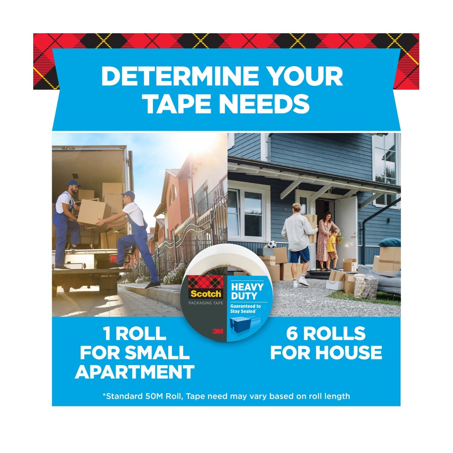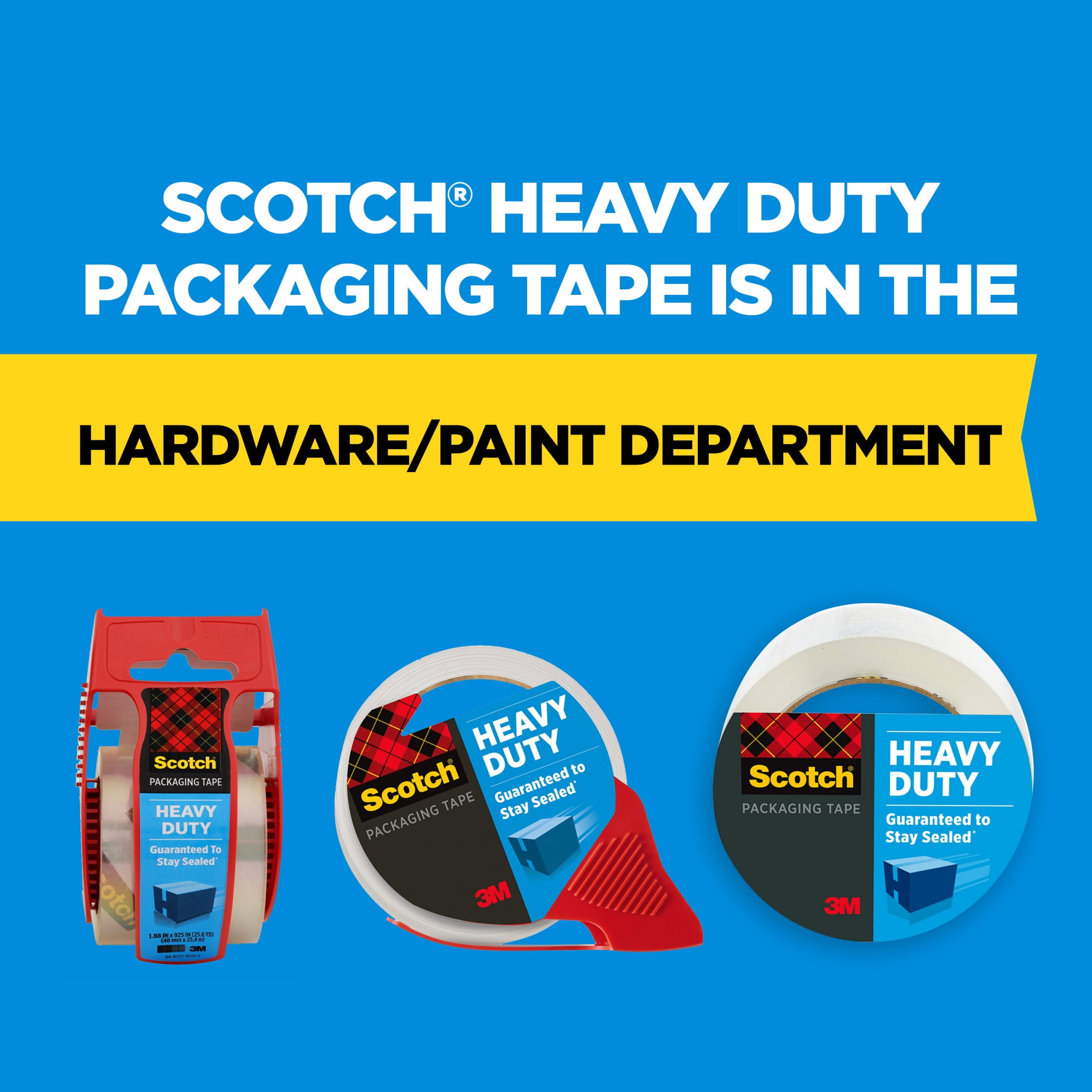 SCOTCH HEAVY DUTY PACKAGING TAPE HAS MOVED: to the hardware paint department PACKING TAPE: 6 rolls of Scotch Heavy Duty Shipping Packing Tape come in dispensers for convenient application and offer excellent holding power for your moving, packing and shipping needs INDUSTRIAL-STRENGTH ADHESIVE: Industrial- strength, solvent-free adhesive adheres instantly to lock in the heavy-duty contents of your boxes and lock out everything else, even through rough handling conditions FOR ALL BOX TYPES: Box tape that works on all types of boxes, including harder-to-stick 100% recycled boxes JUST ONE STRIP NEEDED: Clear adhesive tape that resists slivering, splitting and tearing to keep your boxes sealed with just one strip on each seam IDEAL FOR PACKAGE PROTECTION: Great for shipping packages, as well as sealing moving boxes or packing away seasonal decorations USE AS A REFILL ROLL: Use to refill a Scotch® Brand packing tape dispenser PACKAGE CONTENTS: One package contains six dispensers with six box tape rolls that are 1.88 in. x 22.2 yd., on a 1.5-in. core SCOTCH BRAND PACKAGE PROTECTION: With a full range of adhesive solutions, Scotch Brand delivers confidence in superior results to get the job done well and effectively the first time