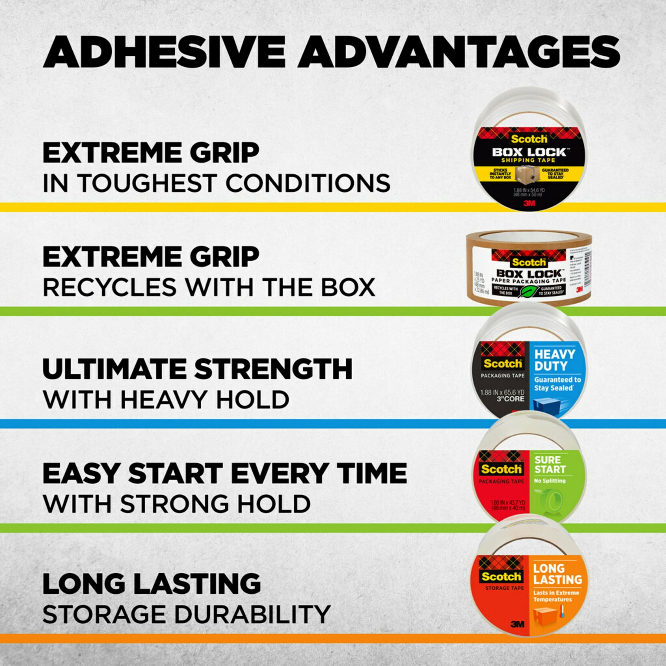 Scotch Heavy Duty Packing Tape provides excellent holding power for your moving, packing and shipping needs. This 3.0-mil thick (typical) box sealing tape holds strong on all box types, including harder-to-stick 100% recycled boxes, and is guaranteed to stay sealed (1). Designed with industrial-strength, solvent-free adhesive, this tape locks in the heavy-duty contents of your boxes and locks out everything else, even through rough handling conditions. Scotch Heavy Duty Packing Tape features instant adhesion and resists slivering, splitting and tearing to keep your moving boxes closed. Whether you’re moving across the country or across the street, this adhesive tape is equipped to keep your boxes sealed with just one strip on each seam. Each roll of box tape features a release coating to make unwinding easy and comes in a convenient dispenser that makes application a breeze. Fall-back tabs on the dispenser help ensure the tape doesn’t fall back on the roll, keeping it ready for the next use. One package contains six rolls of packing tape that are 1.88 in. x 22.2 yd., on a 1.5-in. core, each in its own dispenser. With a full range of adhesive solutions, Scotch Brand delivers confidence in superior results to get the job done well and effectively the first time. By choosing to use the right packaging tape, you’re choosing to create a better result. Scotch Brand offers a full line of tapes specifically designed for the various demands of the project or job. (1) If your box does not stay sealed, 3M will refund the purchase price of this tape. Proof of purchase required. Contact: 1-800-3MHELPS (2) Typical Value