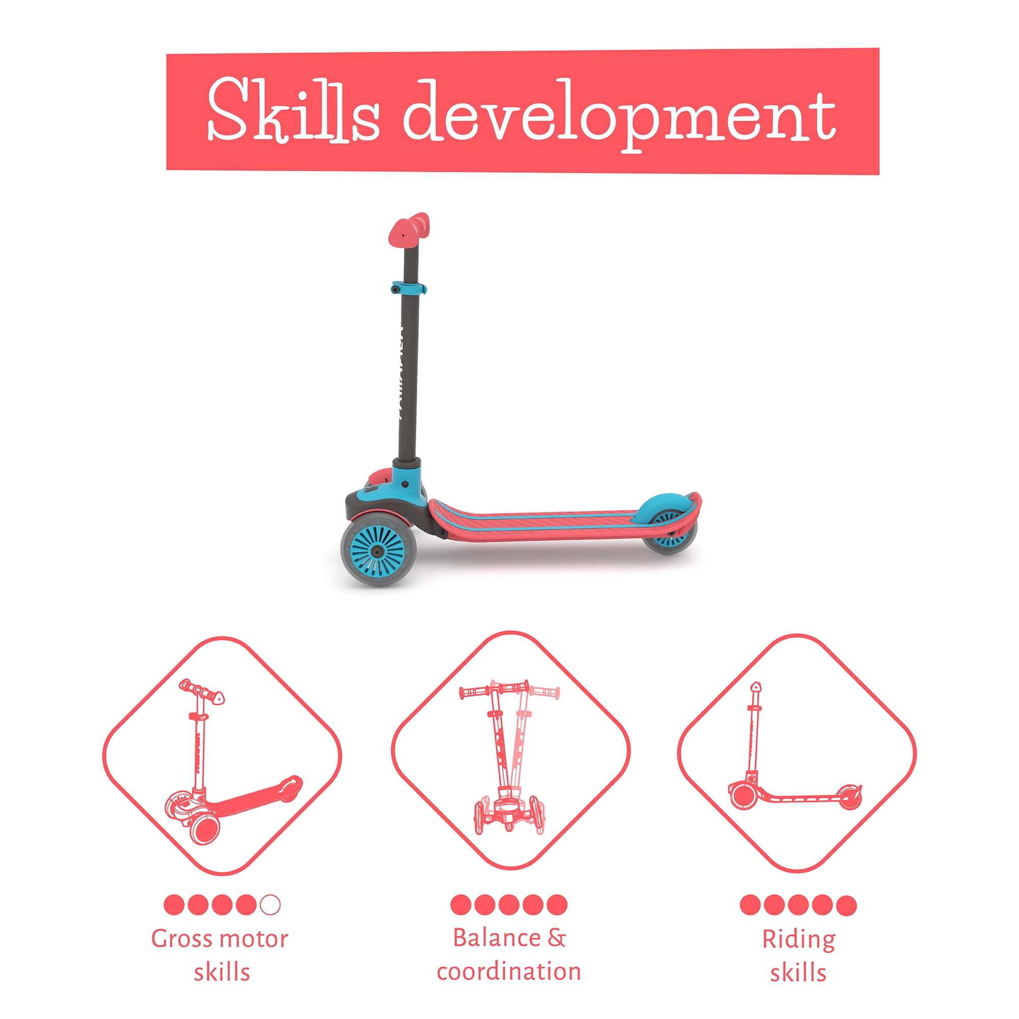 Lightweight 3-wheel scooter for kids age 3 and up. Lean to steer mechanism : just lean your weight to turn – super easy. Re-invented twintip deck design with integrated footbrake for safety. No-tools detachable handlebar can be taken out for easy storage/transport. High-quality ABEC-5 wheels make you roll like you’ll never stop. Max weight 50kg.