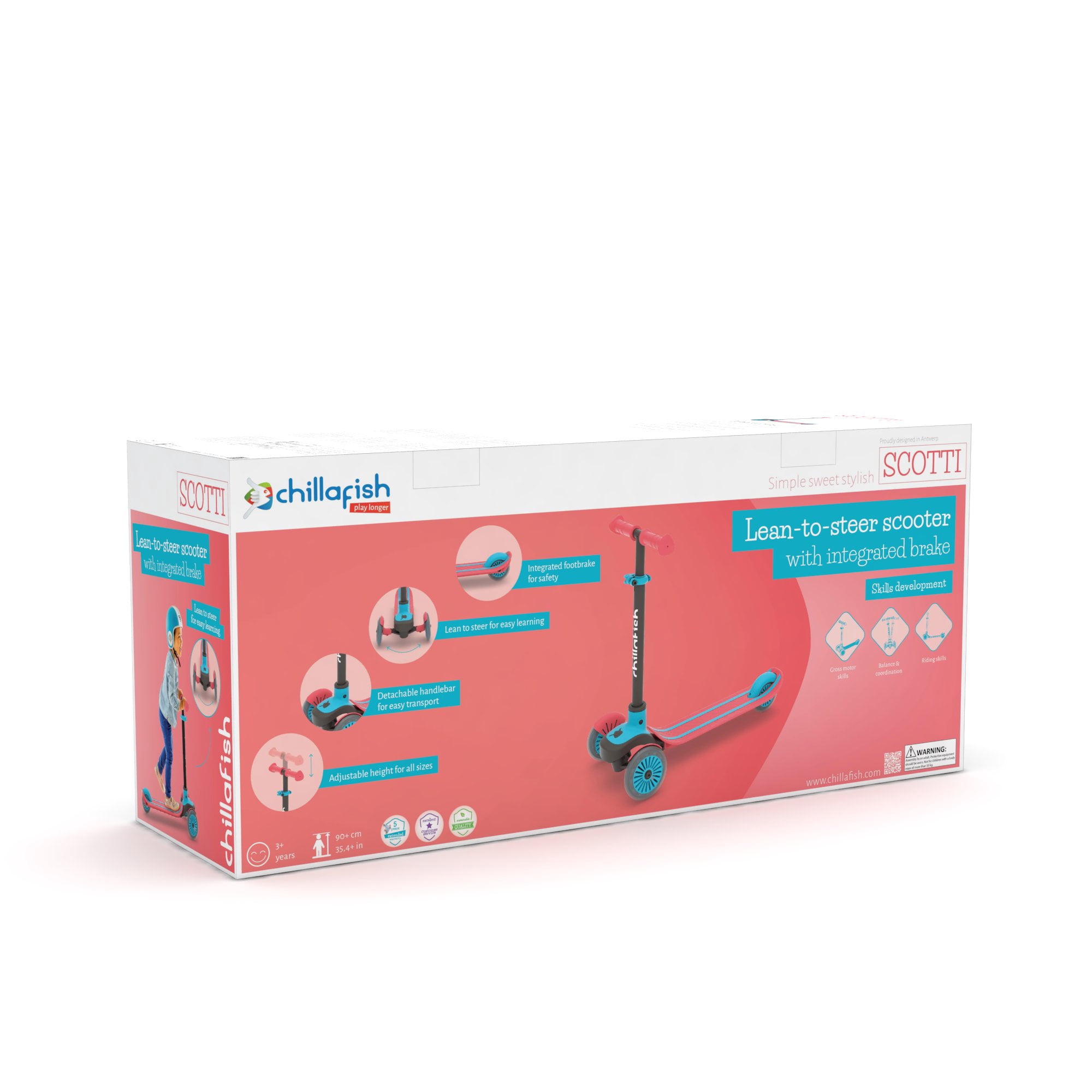 Scotti is our Chillafish interpretation of the classic 3-wheel scooter. Scotti lightweight scooter for kids age 3 and up is a re-invention of the lean-to-steer scooter, featuring our signature and stylish twintip deck with integrated footbrake. The handlebar comes off in a snap without tools so you can easily take Scotti along to friends or to the park. Adjust the height to suit small kids and tall friends – the handlebar can adjust from 52cm to 73cm (from the ground). The high quality ABEC-5 wheels make you roll like you’ll never stop and the comfy handgrips feel like you’ll never want to let go. The deck is lightweight yet strong, for kids and adults up to 50kg (but we tested higher :-)). Scotti, lightweight, simple, stylish fun quality by Chillafish. Play Longer. Comes fully assembled in the packaging, just snap-in the handlebar and ready to roll ! Recommended age: 3+ / Recommended weight: max 50kg