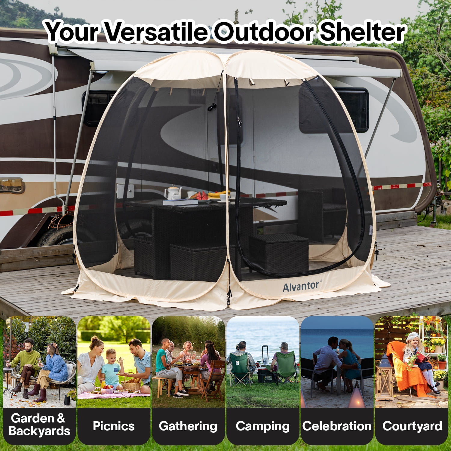 See the product Video in action. There are 3 sizes screen house available in our store if necessary! 10′ for 4-6 person. 12′ for 6-8 person. 15′ for 8-10 person. All the accessories need to be purchased separately, Sand Bags and metal stacks are included. Notice: Not recommended to use when the wind force reaches 24 mph (10.8m/s)! Screen house is Not Waterproof! Descriptions: Product Advantage: Lightest screen house. The poles of this canopy is made with fiberglass. The other item basically use steel tube structure which is bulky and easy to rust. The screen gazebo is suitable for party and barbecue on the backyard. The good choice for picnic on the park. Patented Design: Patented pop up style screen house. Due to the unique frame and the folding way, it is easy to take away. 6-sides mesh wall provide the perfect air ventilation. Enjoy the excellent scenery outdoors with the 360-degree view. At the same time, you don’t need to worry about the pesky mosquitoes, fly and insects. The 6 extra sandbags, 12 guylines and 12 metal mounting stakes can also provide more stability in windy conditions. Easy Set Up & Storage: It Only take 1 minute to complete the quick set up and fold down with the patent design. Easy assemble by one person. Folding into the compact carry bag, it is easy to take away! High Quality: The structure of the tent will not be bent or unusable due to long-term use. Polyester fabric can be cleaned easy. It can provide 50 + UPF protection roof for harmful rays of the sun. Dimensions: 10′ x 10′ x 7′ H fits 4-6 people or family. This tent can be folded into the flat compact small carrying size: 38” x 3.5” H. Weight: 16.5 lbs! Lighter than the other same items! 1 Year 100% SATISFACTION GUARANTEE: Alvantor is a U.S. based company which is located in Los Angeles, CA. Trademark is registered. if you have any question about Alvantor Tent, please contact us 626-542-3420.