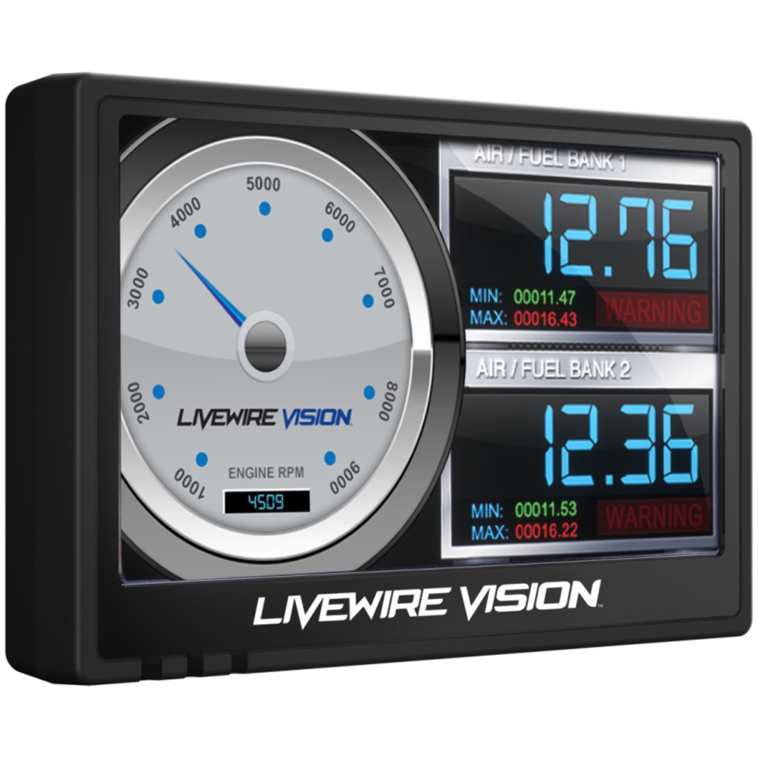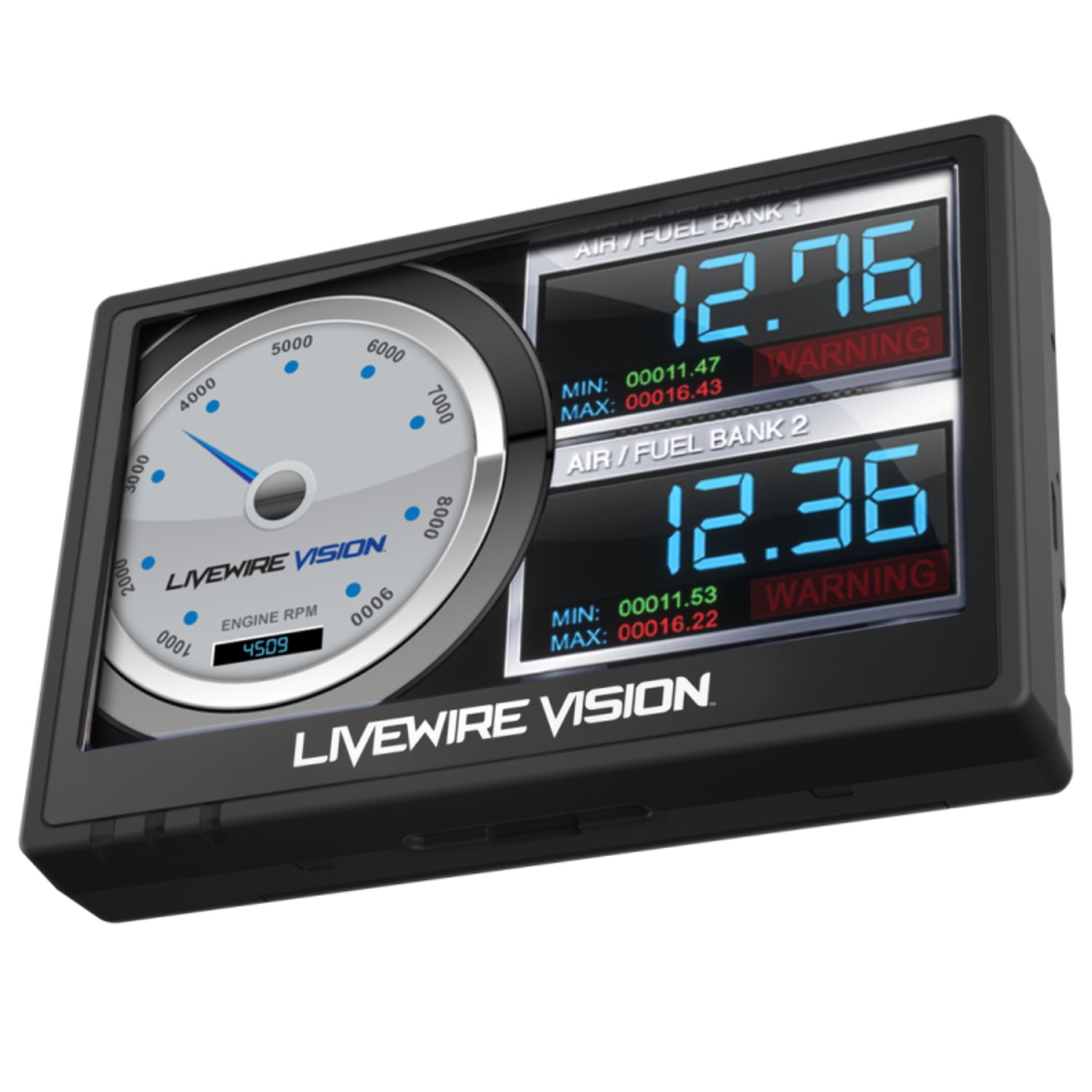The Livewire Vision Performance Monitor puts your vehicle’s vital stats on display. This easy-to-use monitoring device includes the latest data logging capabilities to precisely measure each drive and uncover your vehicle’s power potential. Review your vehicle’s data and performance tests with SCT’s free software, LiveLink. Extend the possibilities with additional inputs for analog sensors and a backup camera.