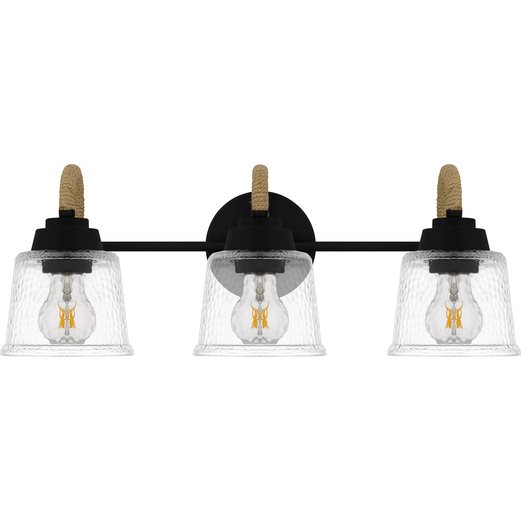 Upgrade any bathroom vanity with the addition of Seabreeze. This coastal-inspired bath light collection features clear hammered glass shades and a matte black finish. A natural looking arm takes the place of traditional metal, adding a nautical feel. Install Seabreeze with shades facing upwards or downwards, whichever best suits your unique space.