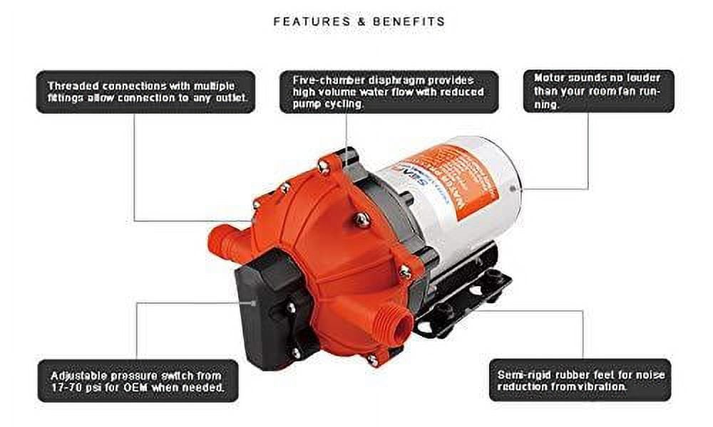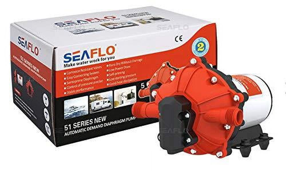 SEAFLO 12V Water Pressure Diaphragm Pump 5.5 GPM (20.8 LPM) 60 PSI The55-Series is our all new heavy duty water pressure pump with the most heavyduty pressure switch on the market. It provides high volume water flow withreduced pump cycling and smooth flow thanks to the large five-chamberdiaphragm. It provides up to 5.5 gallons per minute. The 55-Series pumps areself-priming, can run dry without damage, and are performance reliable. Thisautomatic demand water system pump has a built-in pressure switch whichautomatically starts and stops the pump when the faucet is opened and closed.Easy to install service and winterize. This pump works best when paired with aSEAFLO Accumulator Tank. Technical Specifications Voltage: 12 VDC Dimensions:8.25″ X 5.30″ X 6.0″ Inlet / Outlet: 1/2″-14 MNPT Flow Rate: 5.5GPM Amps: 8.0(17.0 Max. Amps) Shut-off Pressure: 60 PSI Weight: 6.1 lbs