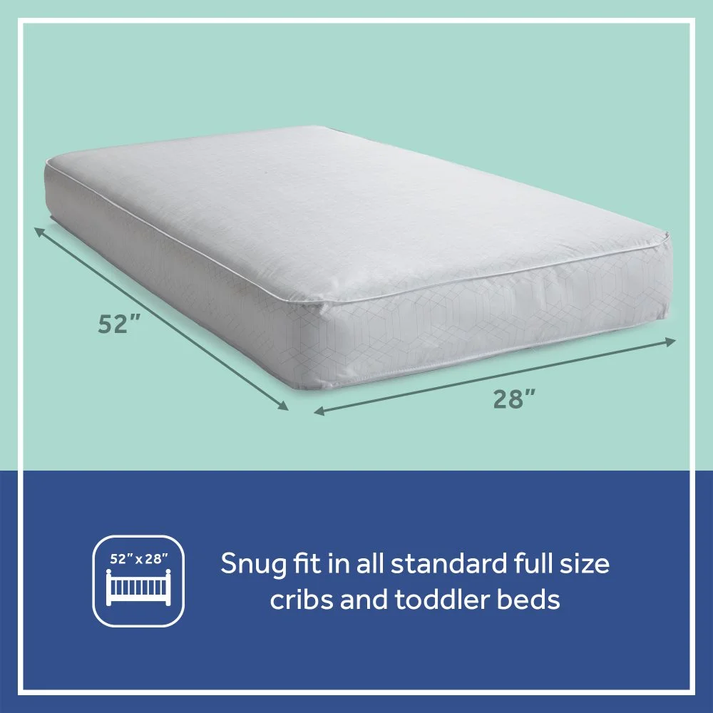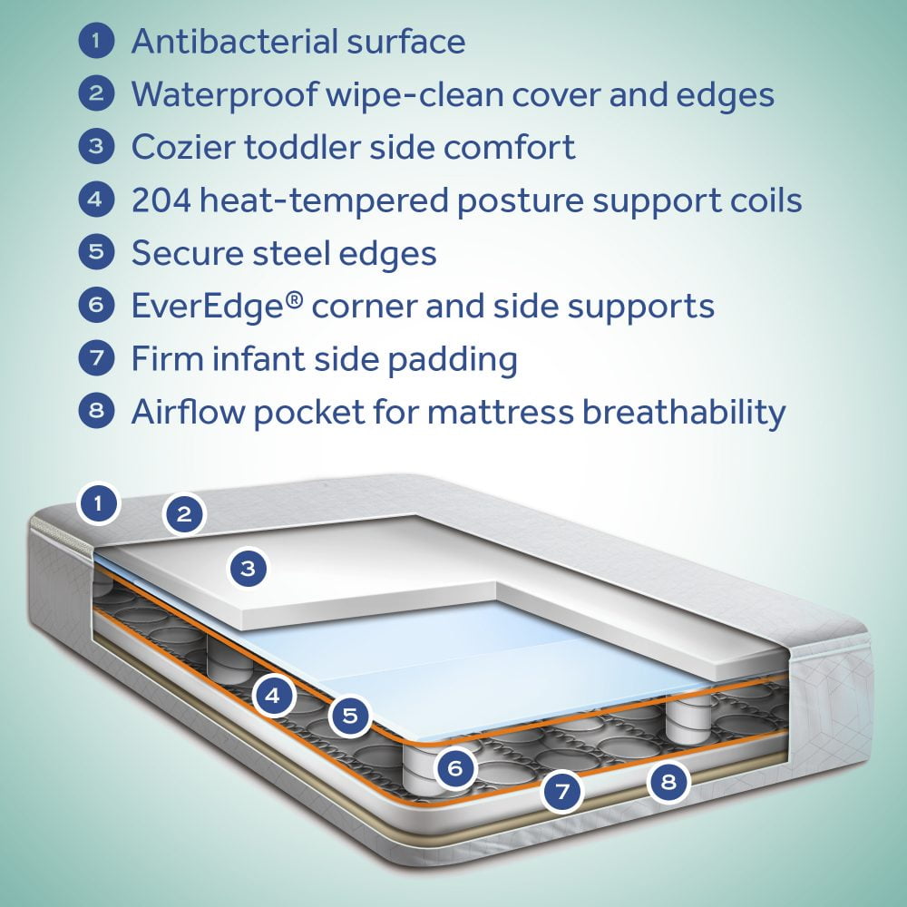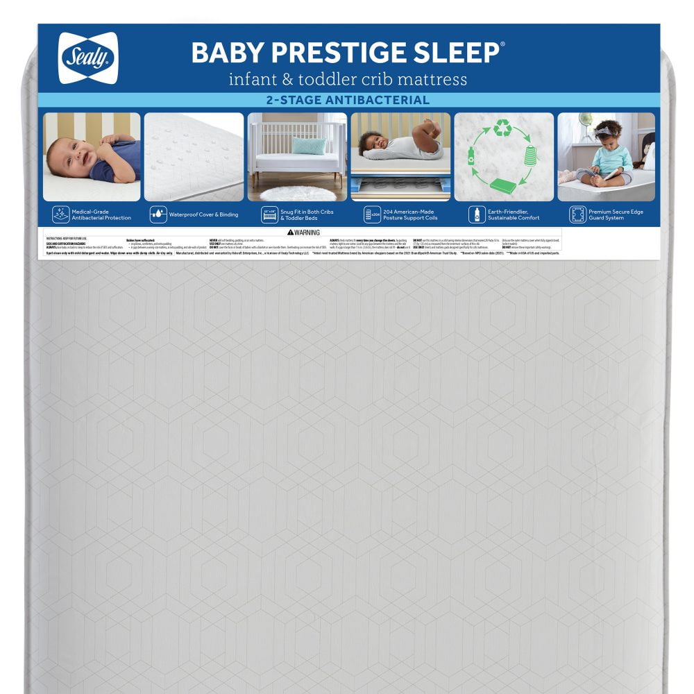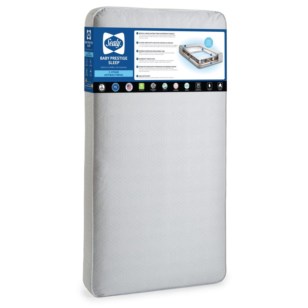 The Sealy Baby Prestige Sleep Antibacterial 2-Stage Baby Crib Mattress and Toddler Mattress is designed with health and safety in mind. The high 204 coil count is posture supportive and durability tested. The Ever Edge steel sides, corner and edge protectors keep the edges firm. An EPA-approved Staph-Gard antibacterial cover is lab-tested to help eliminate bacteria on baby’s mattress surface. Must-have waterproof surface keeps liquids from seeping inside. Wipes clean with a damp cloth. Extra firm infant side and cozier toddler side for grow-with-me firmness. Tested to fit all standard size cribs and toddler beds. No harsh materials are used, does not contain any flame retardants. GREENGUARD GOLD Air Quality Certified for a healthier indoor environment. Complies with ASTM crib mattress standards for durability and firmness. More babies sleep on award-winning Sealy than any other crib mattress brand. Lightweight to easily change crib sheets. Measures 51.63 x 27.25 x 5.75 inches. 20 year warranty on workmanship and materials.