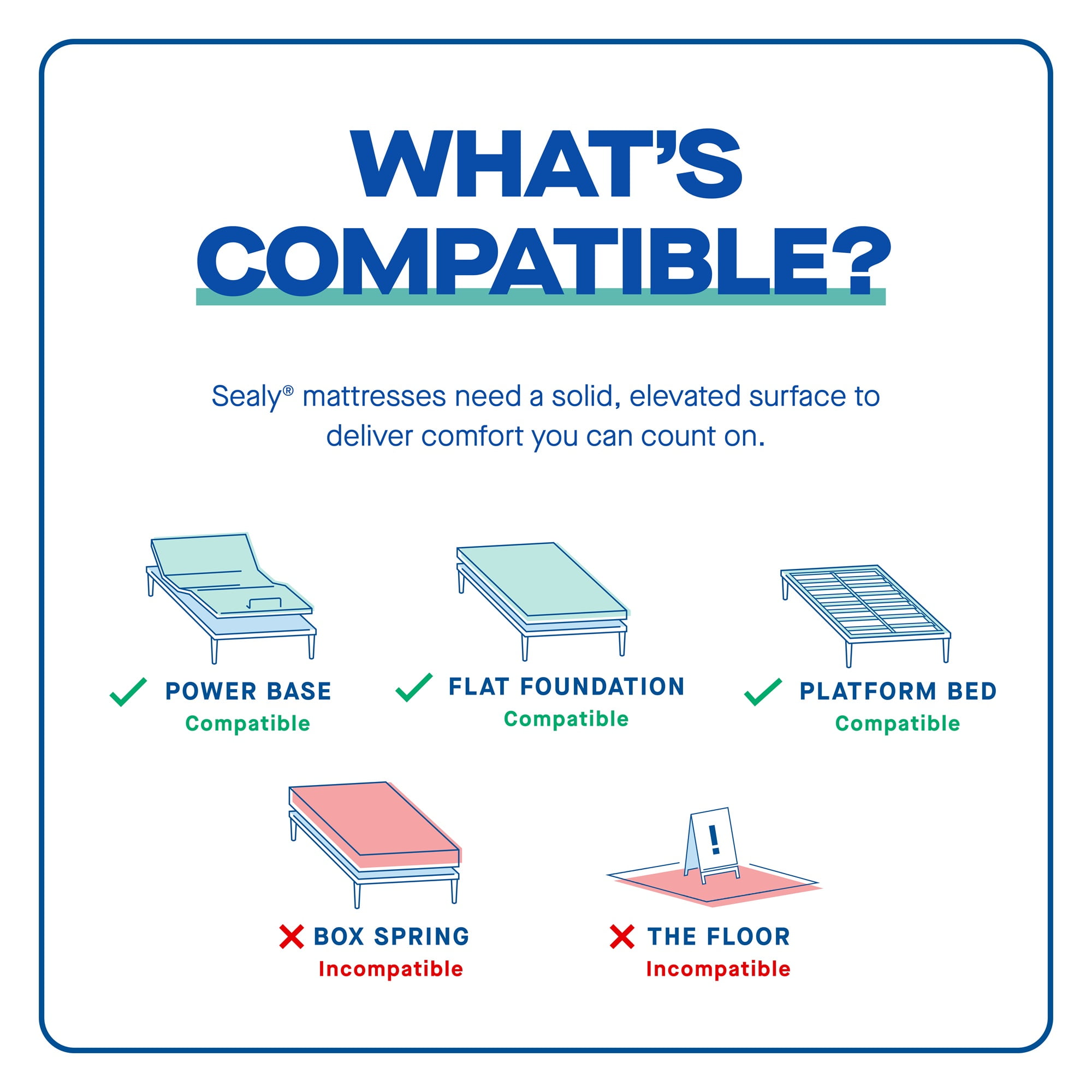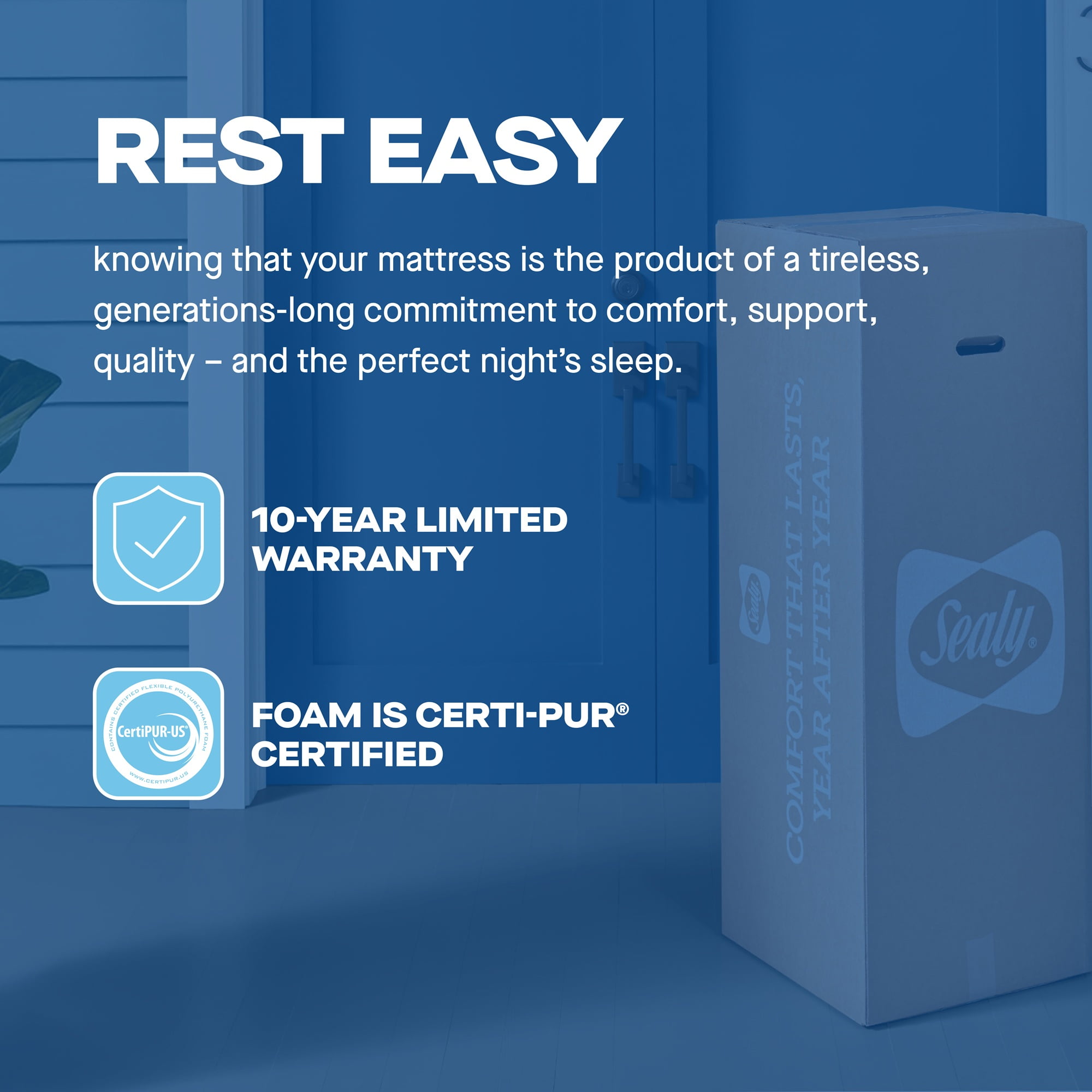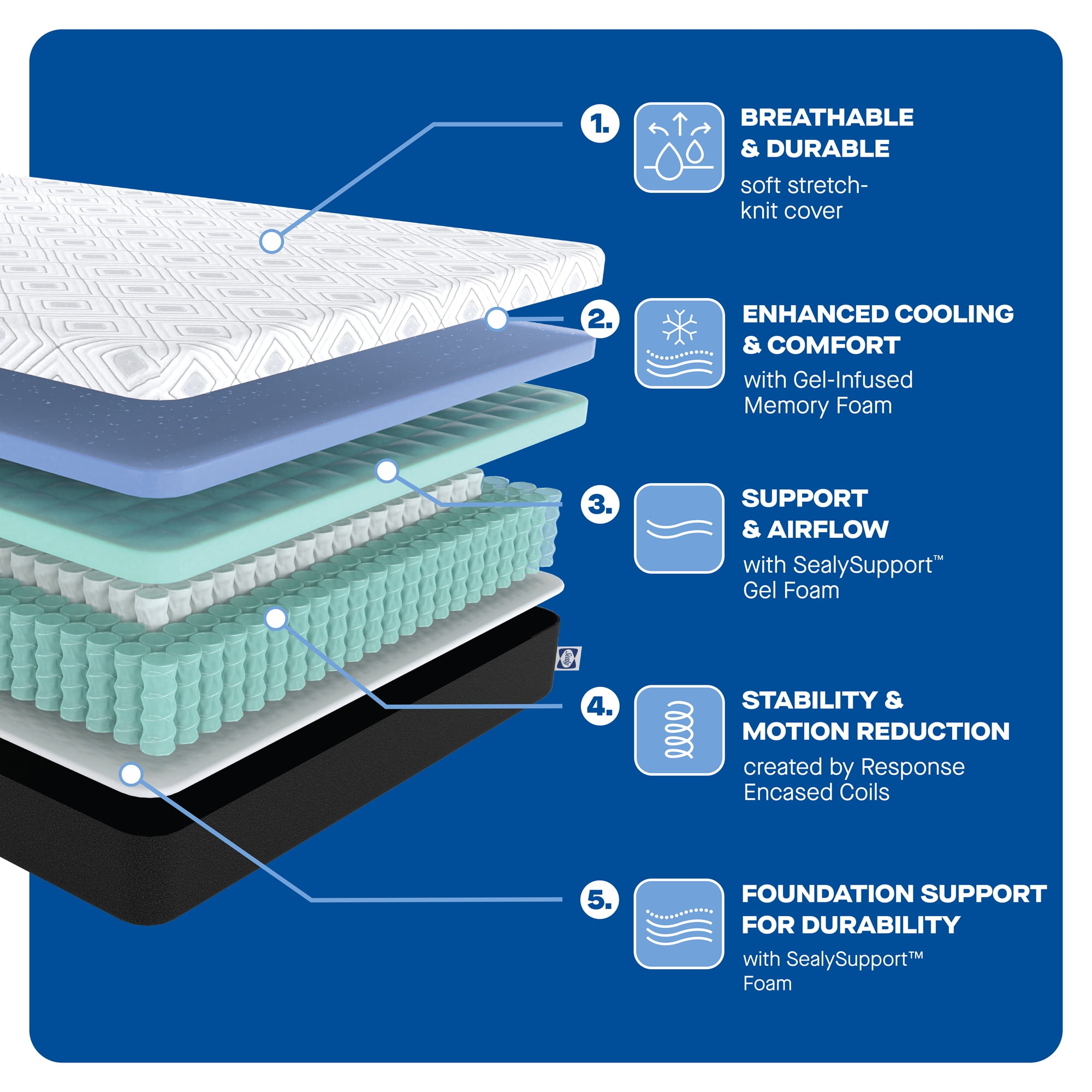 BEST-OF-BOTH-WORLDS COMFORT – Carefully engineered coils adapt and support every part of your body, while specialty foams conform and cushion for your most comfortable night’s sleep. Gel-infused memory foam adapts and responds to you while delivering breathable comfort and a deeper level of conforming support. SEALYSUPPORT™GEL FOAM – This breathable gel foam layer provides support and aids in airflow for a refreshing night’s sleep. RESPONSE™ ENCASED COILS – Response-encased coil layer creates a stable, supportive surface while reducing motion transfer. SEALYSUPPORT™ FOAM – This traditional foam layer provides foundational support and long-lasting durability. MATTRESS-IN-A-BOX – Compressed mattresses that combine Sealy® quality, durability, and comfort with the convenience of easy shipping and transportation. BREATHABLE AND DURABLE STRETCH-KNIT COVER – Includes a durable, soft stretch-knit fabric cover for comfort and to help keep your mattress protected. CERTIPUR-US® CERTIFIED: Rest easy knowing all Sealy® foams meet CertiPUR-US® safety standards. 10-YEAR LIMITED WARRANTY: You’ll get comfort you can count on, backed by a 10-year limited warranty. Feel/Support Level: MEDIUM SUPPORT Designed for all age groups: Adult, Teen, Child