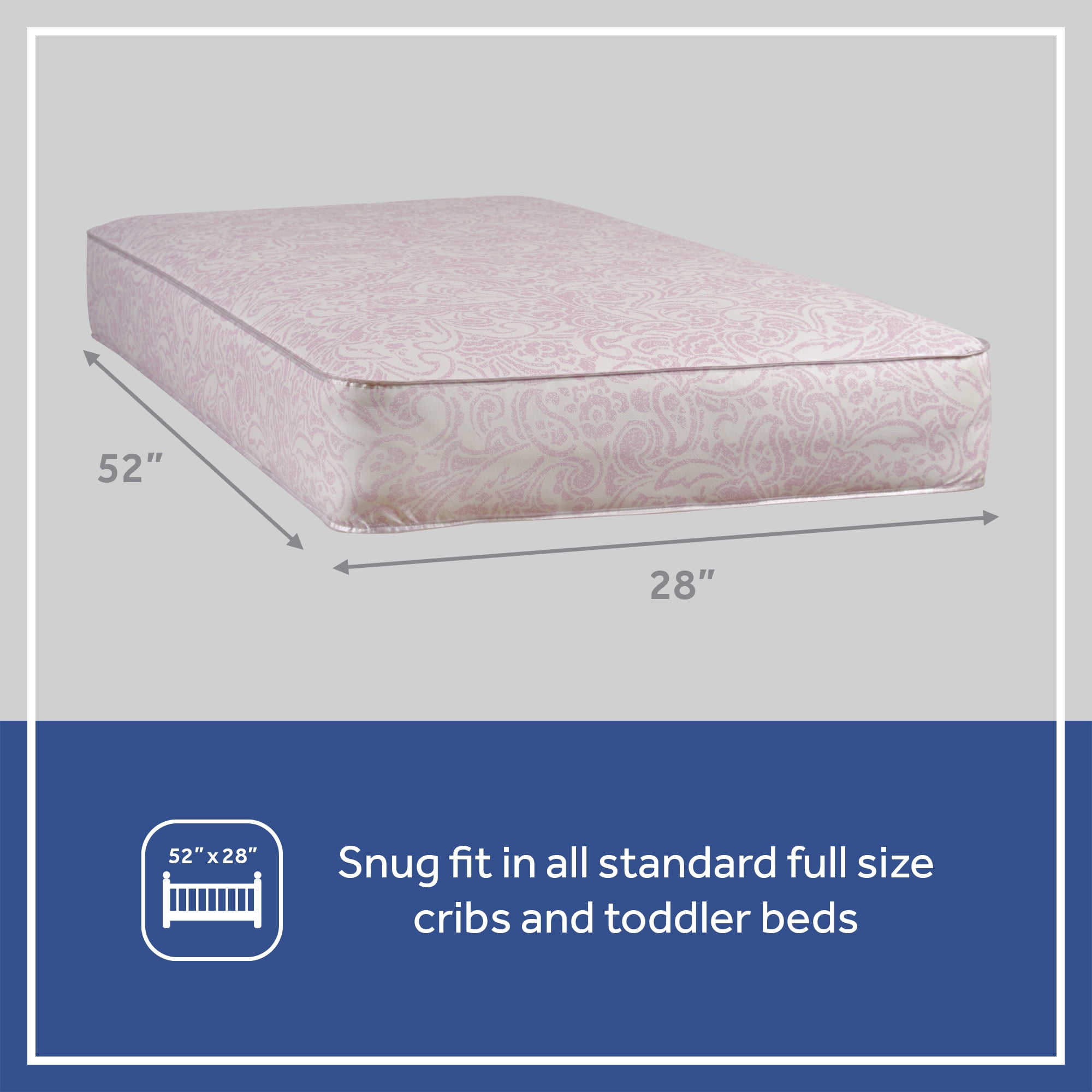 This Sealy Ortho Rest Crib Mattress is an extra firm high coil count baby crib and toddler bed mattress perfectly designed for years of use with infants and toddlers. The Sealy Ortho Rest is engineered with 150 premium posture-supportive and durability-tested steel coils for extra firmness to help create a firm, flat surface for babies as recommended by pediatricians. Designed with two thick hypoallergenic layers surrounding the core for lasting comfort on both sides. Waterproof crib mattresses are essential for a sanitary sleeping environment! This reinforced and highly durable cover is waterproof, so accidents won’t seep inside. Plus, the lock-stitched waterproof binding won’t allow liquids to seep through the edges to help avoid mold, mildew, odors, and other bacterial growth. Simply wipe the mattress clean with a damp cloth or baby-friendly soap and water. An airflow pocket allows the mattress to breathe. Light enough to easily lift and change the sheets. It meets ASTM crib mattress standards and creates a perfectly snug fit inside USA standard-size cribs and toddler beds. You can choose your favorite crib for a perfect fit. Light enough to lift to change the sheets easily. All Sealy crib mattresses are green guard gold certified for a healthier indoor sleeping environment; the gold standard encompasses strict tests for products used with children. Parents trust Sealy as the leading crib mattress brand because it is tested to the highest safety and quality standards. Bring safe, supportive crib mattresses home for your little one with a Sealy baby product. The Sealy ortho rest is available in neutral silver-gray and a bright pink paisley pattern.