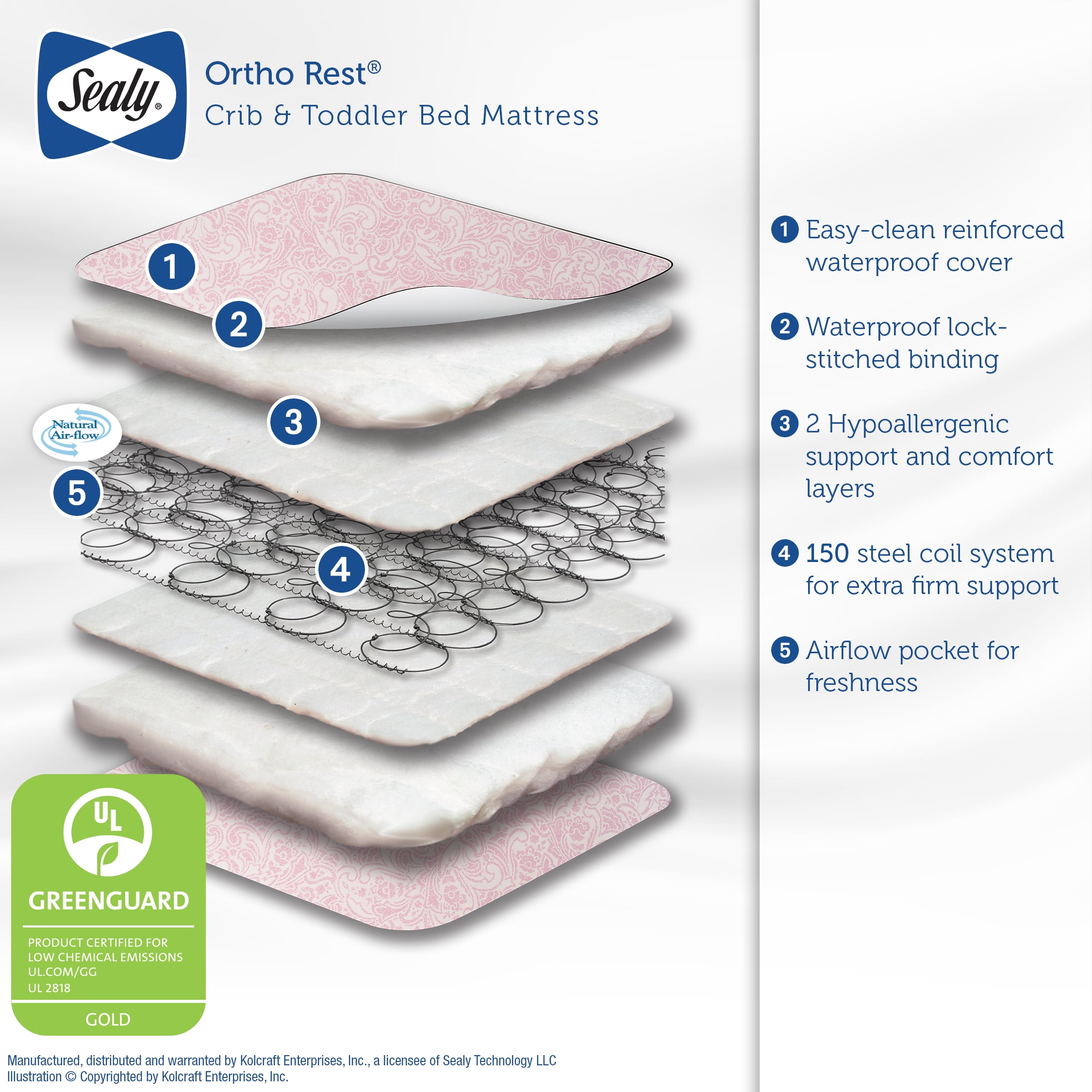 150 extra firm and resilient steel coils offer a safe and supportive sleep surface GREEN GUARD certified for a healthier sleeping environment Product Dimension: 51.63 x 27.25 x 5.25″ The airflow pocket allows the mattress to breathe Fits all USA standard-size cribs and toddler beds for years of use Waterproof cover wipes clean extra-durable cover Extra durable reinforced cover and binding 2 hypoallergenic layers offer cushioned comfort for infants and toddlers IMPORTANT – CHECK THE SELLER PRIOR TO MAKING YOUR PURCHASE. Sealy cannot guarantee the quality or authenticity of Sealy products from unauthorized sellers on . To ensure the very highest safety and quality for you and your family, only buy from listings that are “Sold and Shipped by .” The Sealy warranty does not cover products purchased from unauthorized sellers.