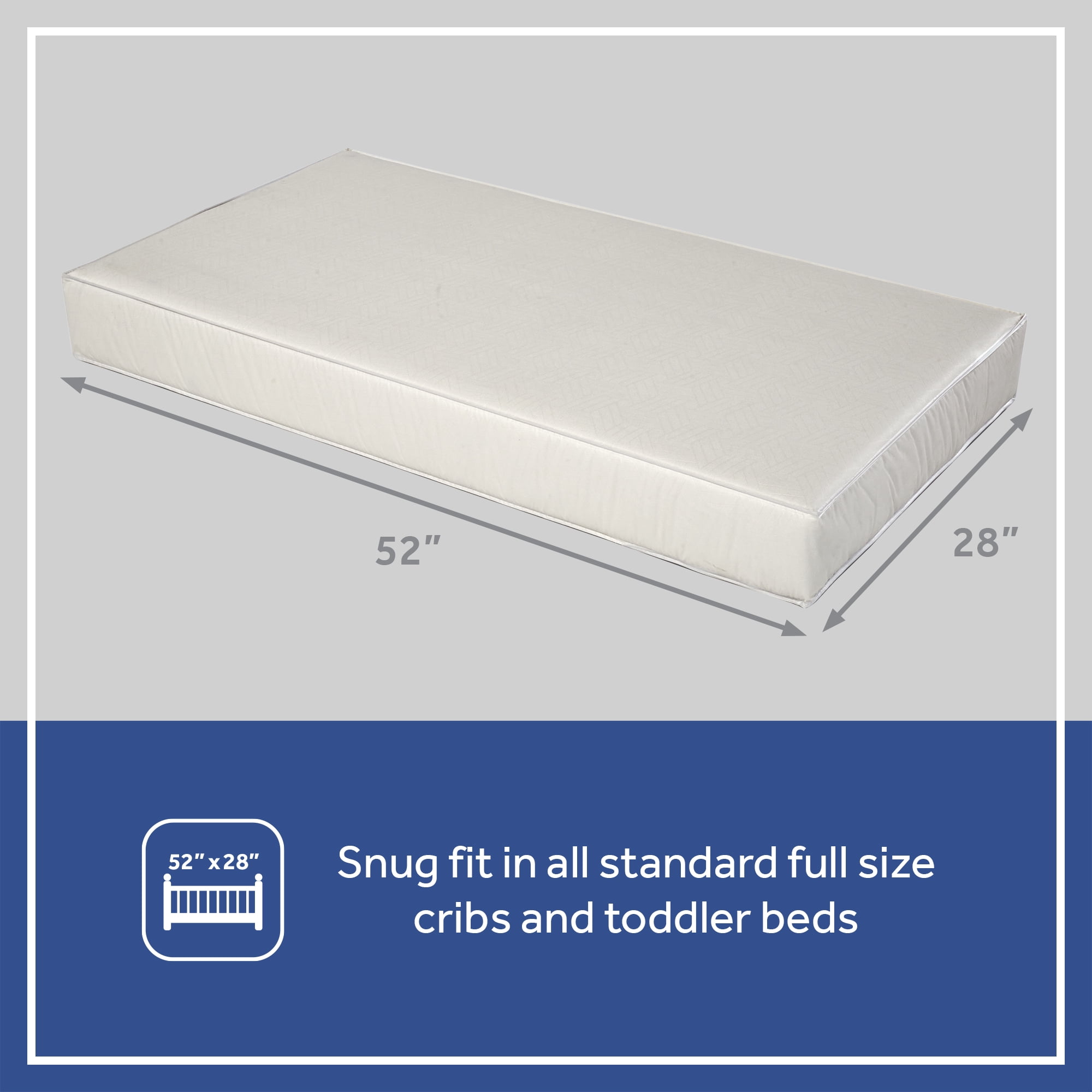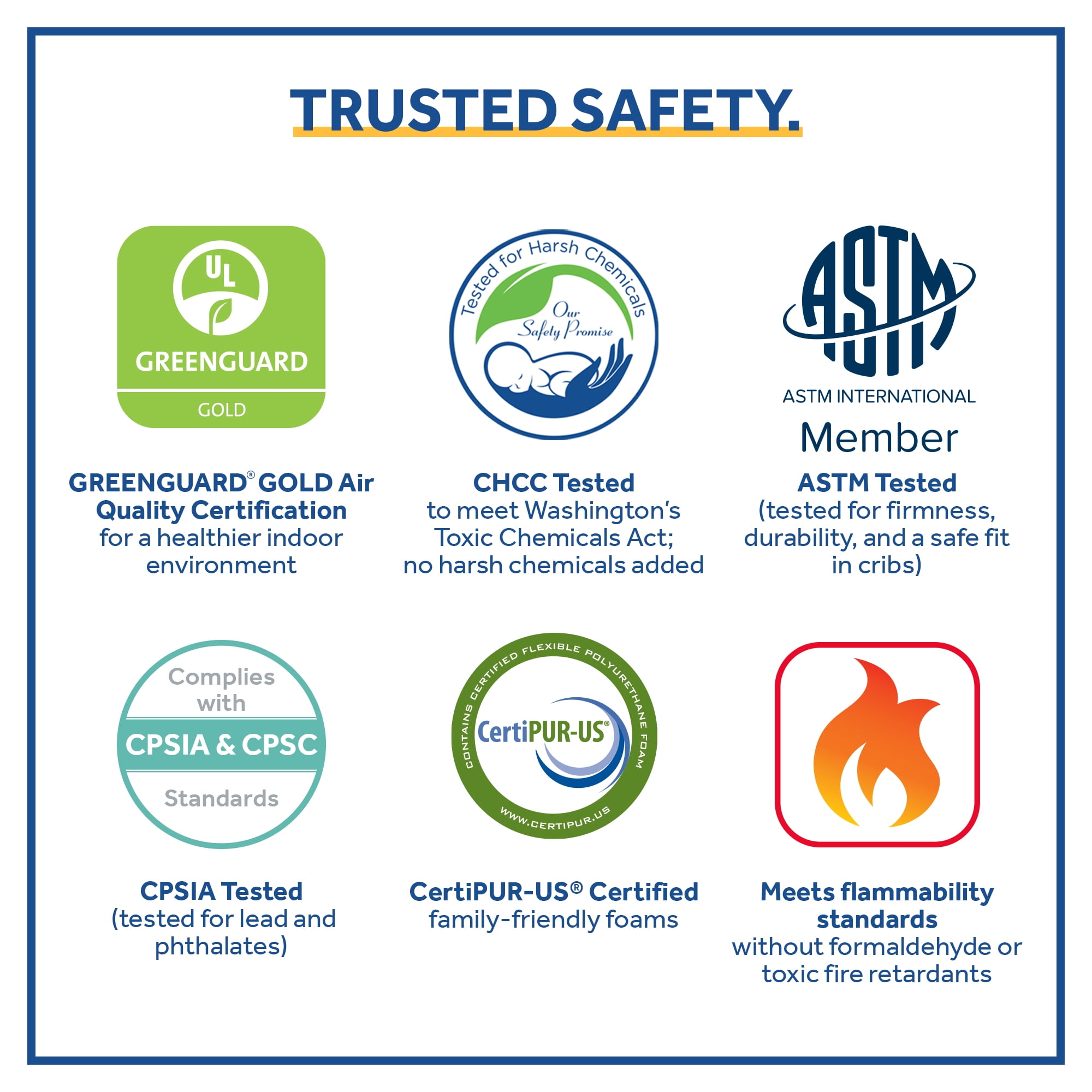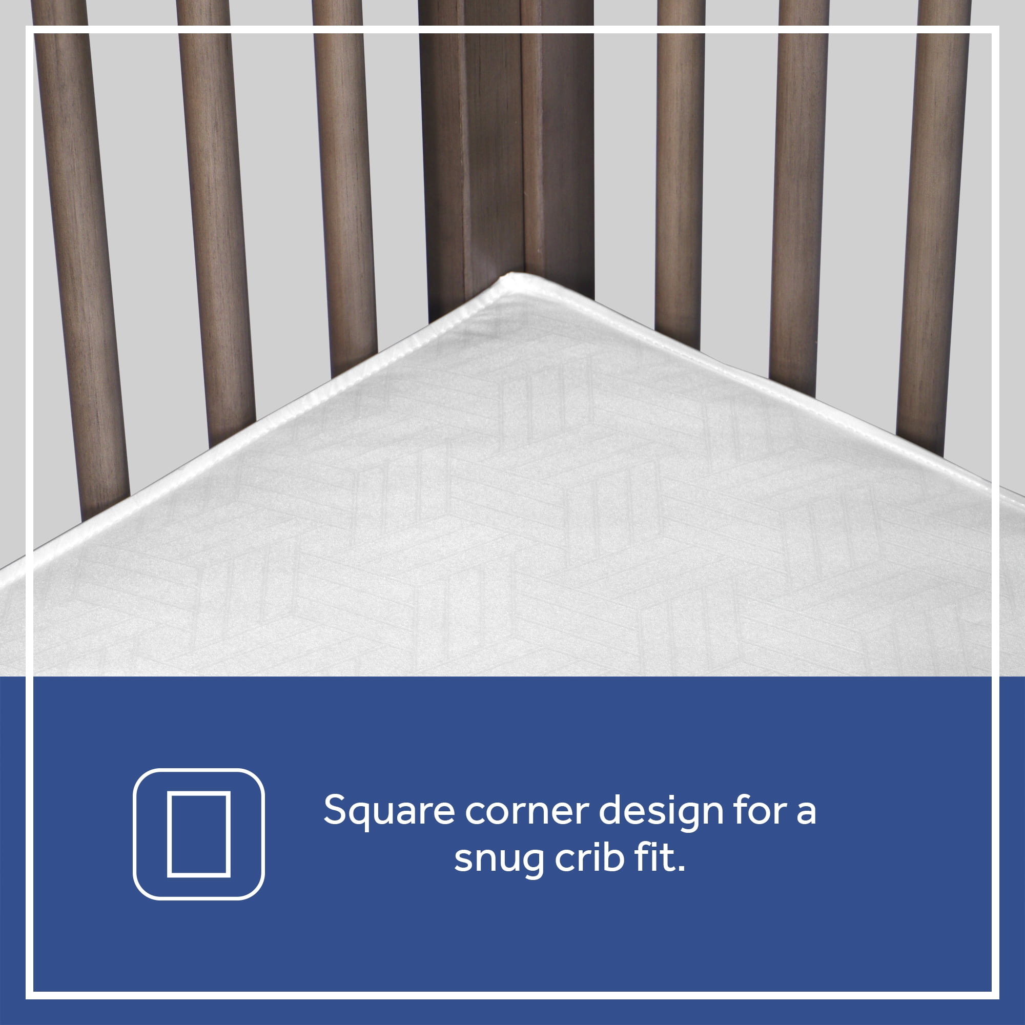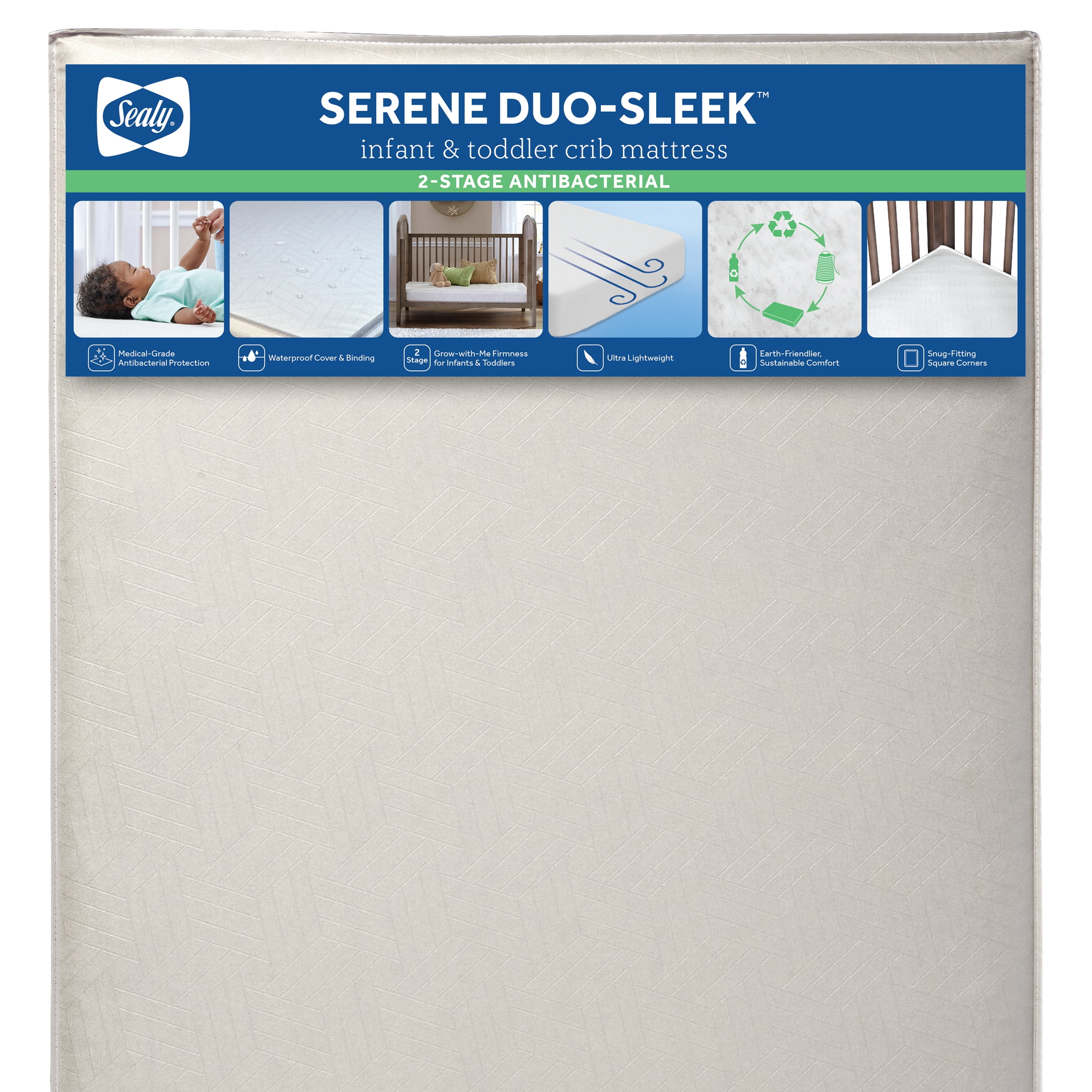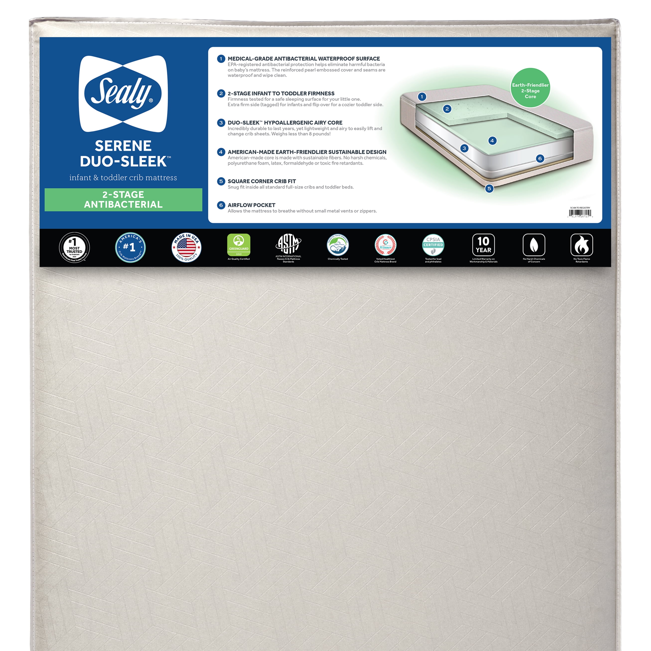 Sealy Serene Duo-Sleek 2-Stage Dual Firm Sustainable PolyFoam Crib Mattress and Toddler Mattress SUSTAINABLE, SLEEK & LIGHTWEIGHT CRIB MATTRESS: A super-sleek streamlined infant mattress and toddler mattress that weighs less than 8 pounds. Airy hypoallergenic poly-core made with a sustainable edge. EARTH FRIENDLIER MATERIALS: Top-quality, locally sourced and air-quality certified cushioning all throughout. Sustainably sourced and made by experts. This model does not have polyurethane foam, latex foam, memory foam, or hard polyethylene plastic “air” cores that create a hard plastic feel. FIRMNESS AND DURABILITY TESTED: Passes the latest crib mattress standards to ensure a firm and supportive sleeping surface for babies as well as firm/flat baby mattress testing to help reduce the risk of suffocation. TRUSTED BRAND WARRANTY: Sealy supports infants and toddlers; this crib mattress comes with a 10 year warranty on workmanship and materials. SAFETY TESTED AND NON-TOXIC, FOR BABY: Tested to meet or exceed children’s safety regulations, no lead or harsh phthalates, no flame retardants, voted Healthiest Crib Mattresses by parents, fits all standard size cribs and toddler beds. AIRFLOW POCKET: Airflow pocket helps the mattress to breathe. EXPERTLY MADE BABY MATTRESSES: More babies sleep on Sealy crib mattresses, which are crafted by crib mattress experts with over 70+ years creating the best baby crib mattresses parents and babies have depended on for decades. AIR QUALITY CERTIFIED: GREENGUARD GOLD Air Quality Certified, helping infants and toddlers experience a healthier indoor environment. WATERPROOF, PEARL EMBOSSED STAIN-RESISTANT COVER: Crib mattresses perform best with a waterproof cover so liquids and germs can easily be cleaned up quickly. 100% waterproof reinforced surface and waterproof lock-stitched binding repels liquids, odors and stains while keeping mold, mildew and wetness from seeping inside. 2-STAGE DUAL FIRMNESS: Infant side is designed to be firmer for newborns and infants for the first year, then flip to the toddler side for extra comfort layers; tags clearly indicate each side for infants and toddlers. IMPORTANT – PURCHASE AUTHORIZED CRIB MATTRESSES BY CHECKING THE SELLER SECTION PRIOR TO MAKING YOUR PURCHASE.: Simply choose to purchase from for this baby mattress when ordering online. Sealy cannot guarantee the quality or authenticity of Sealy products from unauthorized sellers who also list the crib mattress on . To ensure a new product that offers the highest safety and quality for you and your family, only buy from listings that are “Sold and Shipped by .” The Sealy warranty does not cover products purchased from unauthorized sellers. Thank you for considering Sealy crib mattresses. You will be pleased like the millions of families who choose Sealy baby!