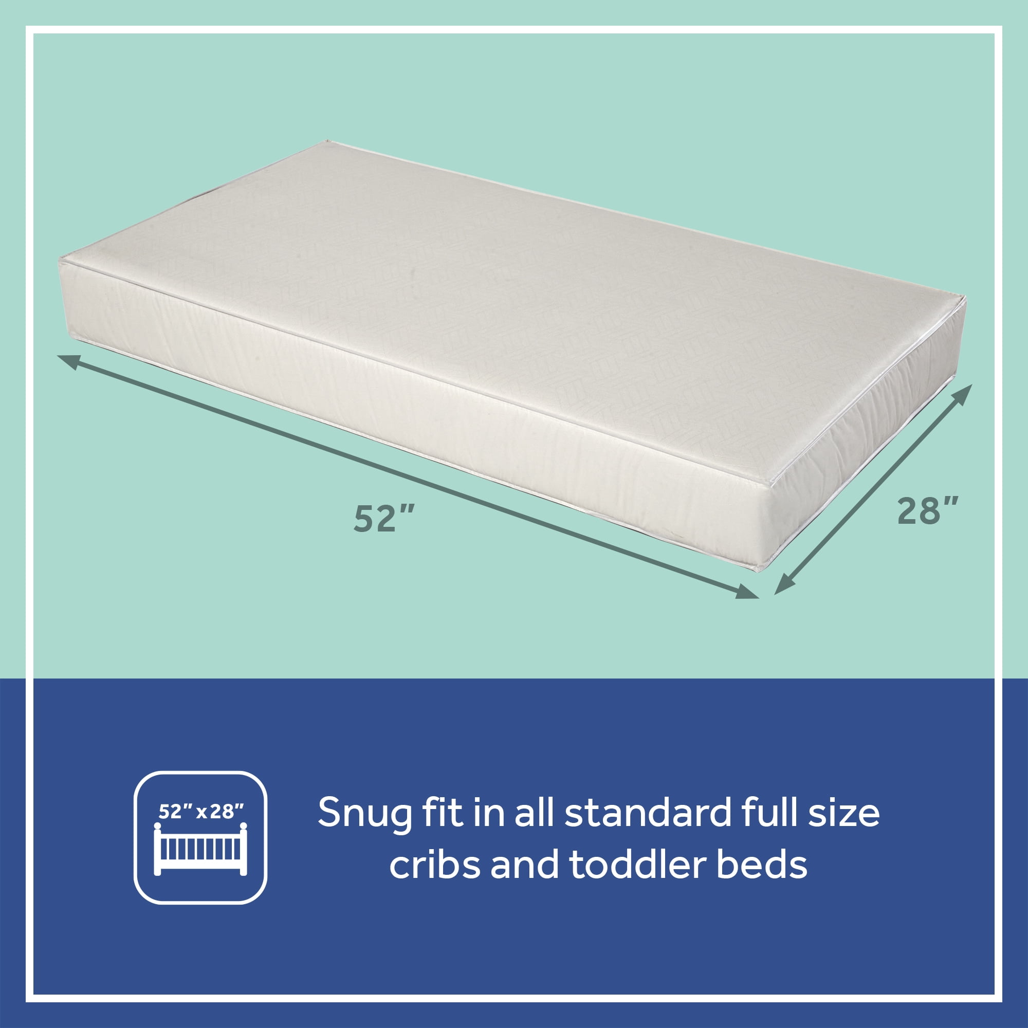 The Sealy Serene Duo-Sleek 2-Stage Crib Mattress and Toddler Mattress is a grow-with-me dual firm baby mattress made from premium, sustainable fiber foam that is gentle on baby and the environment. Firmer infant side and cozier toddler side. Earth-friendlier, sustainable foam crib mattress is hypoallergenic and extra durable. 100% waterproof crib mattress. Reinforced pearlized cover is durable and tear-resistant, stain-resistant and odor-resistant. An airflow pocket helps baby’s mattress to breathe without any small metal vents or leaky zippers. Infant mattress wipes clean with a damp cloth. Full standard size crib mattress measures 52 x 28 x 5.75 inches for a secure fit in all standard cribs and toddler beds. The square corner design offers a snug corner fit. Ultra-lightweight crib mattress weighs less than 8 pounds to easily change baby’s crib sheets. Tested for firmness to help reduce risk of suffocation, and durability tested to perform comfortably through the toddler years! Sealy baby crib mattresses all meet ASTM Crib Mattress standards for safety, quality and lasting durability. GREENGUARD GOLD Air Quality Certified for a healthier indoor sleeping environment. Trusted brand and quality warranty for workmanship and materials. Parents have voted Sealy the most trusted mattress brand. Parents trust Sealy crib mattresses because they are tested to the highest safety and quality standards and Sealy is globally recognized as a premier brand in bedding for almost 140 years.