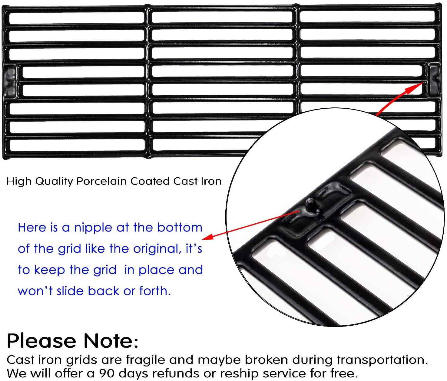 【Fits for Chargriller Replacement Parts】 – Fits for Chargriller 5050, 3001, 5650, 5252, 5072, 3030, 3008, 3000. FITS KING GRILLER GRILL MODELS: 3008, 5252. 【Product Details】 – Stainless Steel Burner :20 1/8″ x 1″, Porcelain Steel Heat Plate: 18 15/16″ x 3 7/8″, Porcelain Cast Iron Grill Grid: 19 3/4″ x 6 3/4″ each, 19 3/4″ x 20 1/4″ for total. 【Superior Quality】 – Made of premium stainless steel to ensure long-lasting use, non- Magnetic. Strong corrosion & heat resistant and heat preservation give us a great and safety barbecue experience. Do not chips, warp or rust out like other material. Compare with the original parts, the material of our grill tube burner are more heavy duty, last longer. 【Made Your Grill Like New Again】 – Extend the life of your grill; Lasting longer; Exact-fit your parts. Heat plate corrosion resistance and heat resistant. Protect burners and prevent flare ups, prevent direct exposure to flame. Smooth surface, non-stick oil and easy to clean, just wash with soapy water. The cooking grates not only heat evenly and retain heat superbly, but also cook professional sear marks. 【Save Your Money】 – 3pcs burner, 3pcs heat plate. 3 pcs cooking grates, 15pcs hardware screws, 3 igniter, 3 Hanger Bracket. 【After-sales service】Before purchasing, please compare with the size and model of the original part. If there is a problem with the product you received, you can contact us at any time and we will deal with it for you.