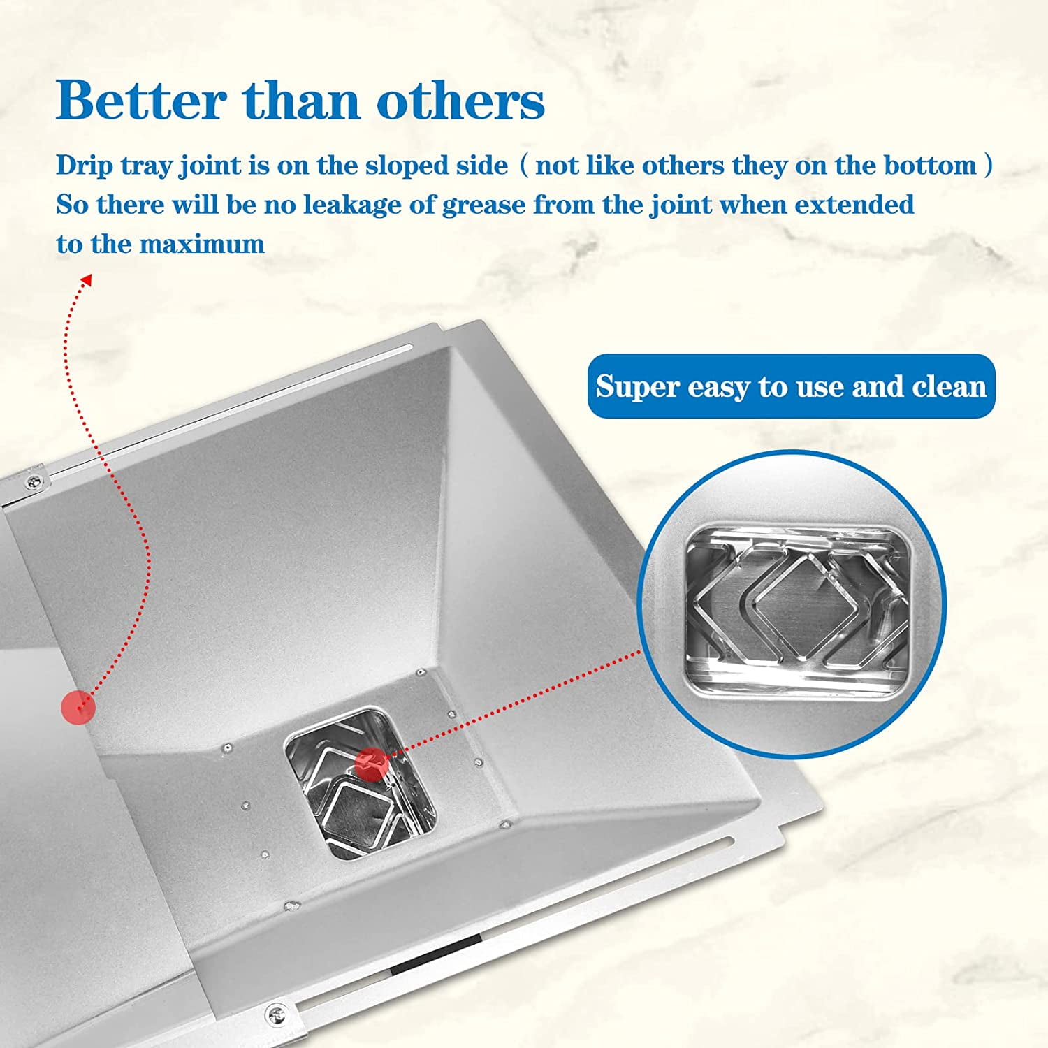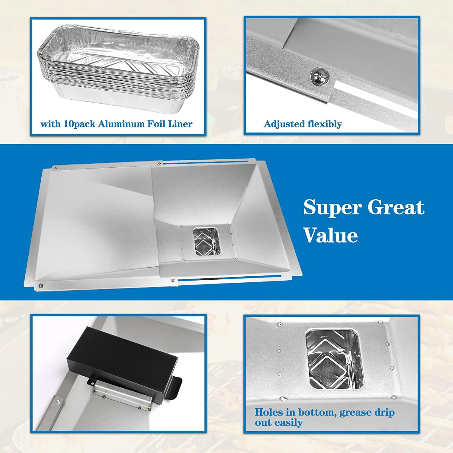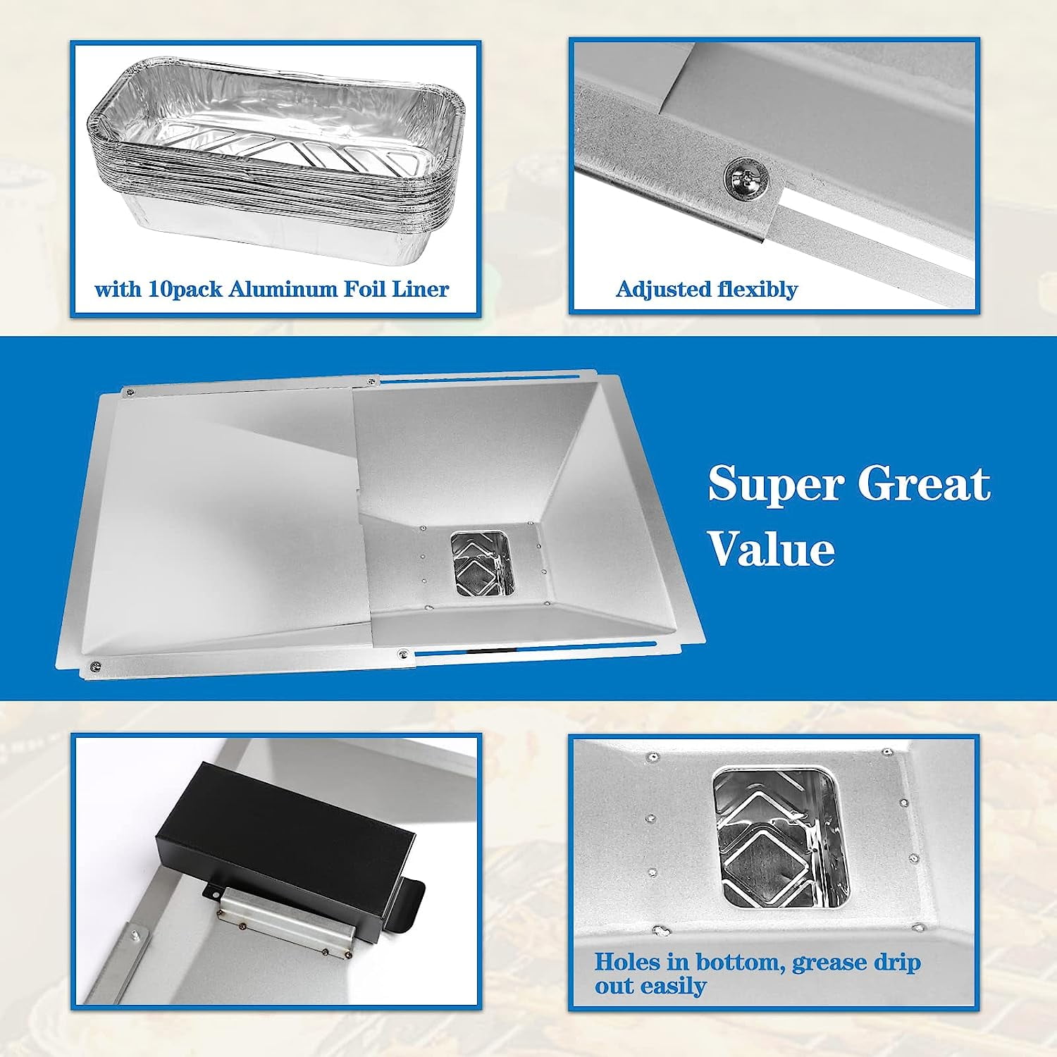 “The Searglow Universal Grease Tray with Catch Pan and Foil Liner is a perfect fit for most 2/3/4 Burner Gas Grills including Nexgrill, Cuisinart Charbroil, Kenmore, Dyna-Glo, Master Forge, Members Mark, BHG, Expert Grill, Jenn Air, Backyard Gas Grill and more. It features an adjustable length between 15“ to 25.5″”, and a width of 14.17″”. The package includes 1x Grease Tray, 1x Catch Pan, 10x Aluminum Foil Liner. Made of heavy-duty metal material, it is long-lasting, non-deformable, and heat resistant. The inclined channel in the drip pan allows the grease to flow to the hole on the bottom, where it is collected by the catcher pan. Use with the extra foil liner for easy cleaning. Simply replace the foil liner when it is full, and clean the grease tray to keep your grill clean. The drip tray joint is on the sloped side, preventing grease leakage when extended to the maximum.”