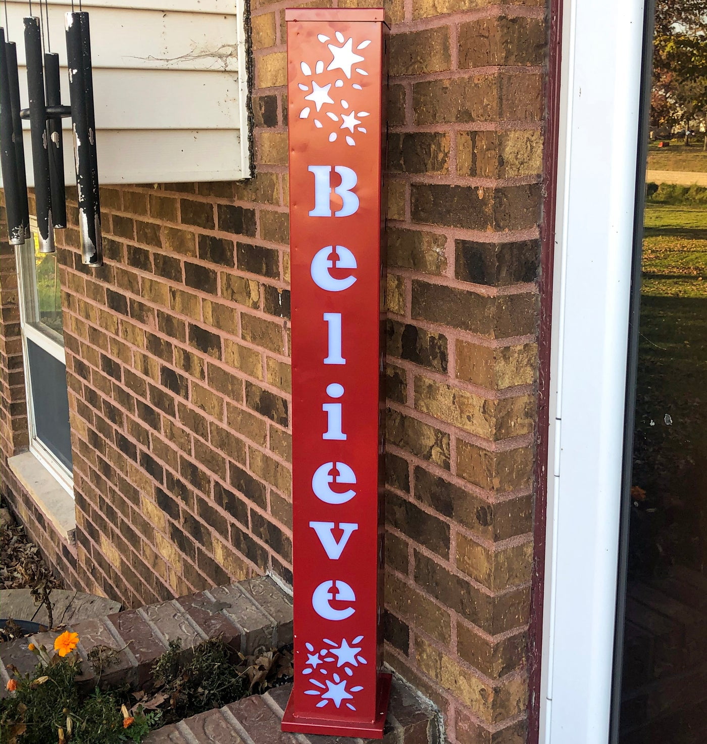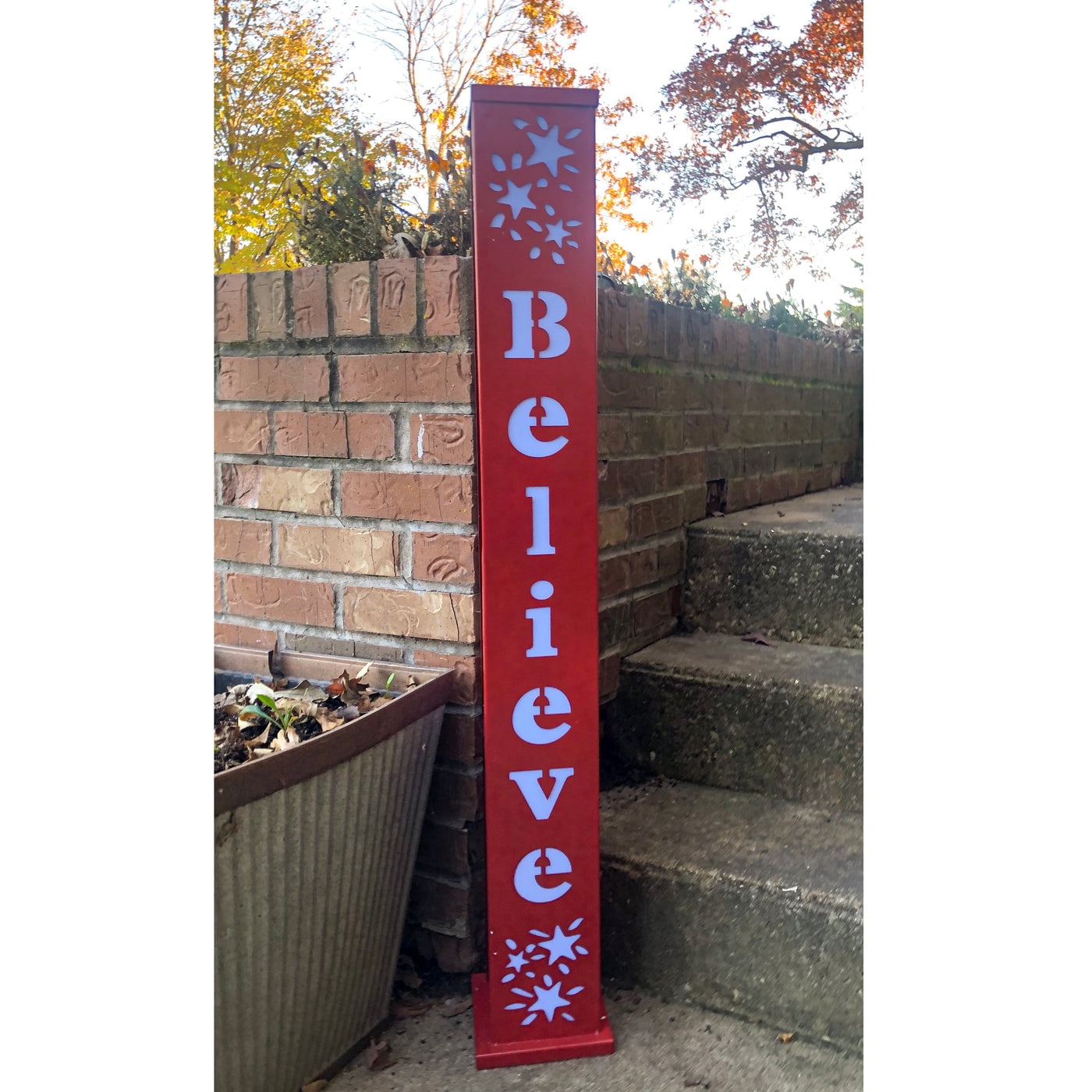 Backyard Expressions’ Believe Outdoor Pillar Lighted Display| Show your Christmas Spirit with the Backyard Expressions Believe indoor or outdoor lighted pillar. This pillar is battery operated with LED lights and features on/off as well as a timer to automatically shut off. Brightly lit and made of durable metal, this decorative pillar will last for years to come.