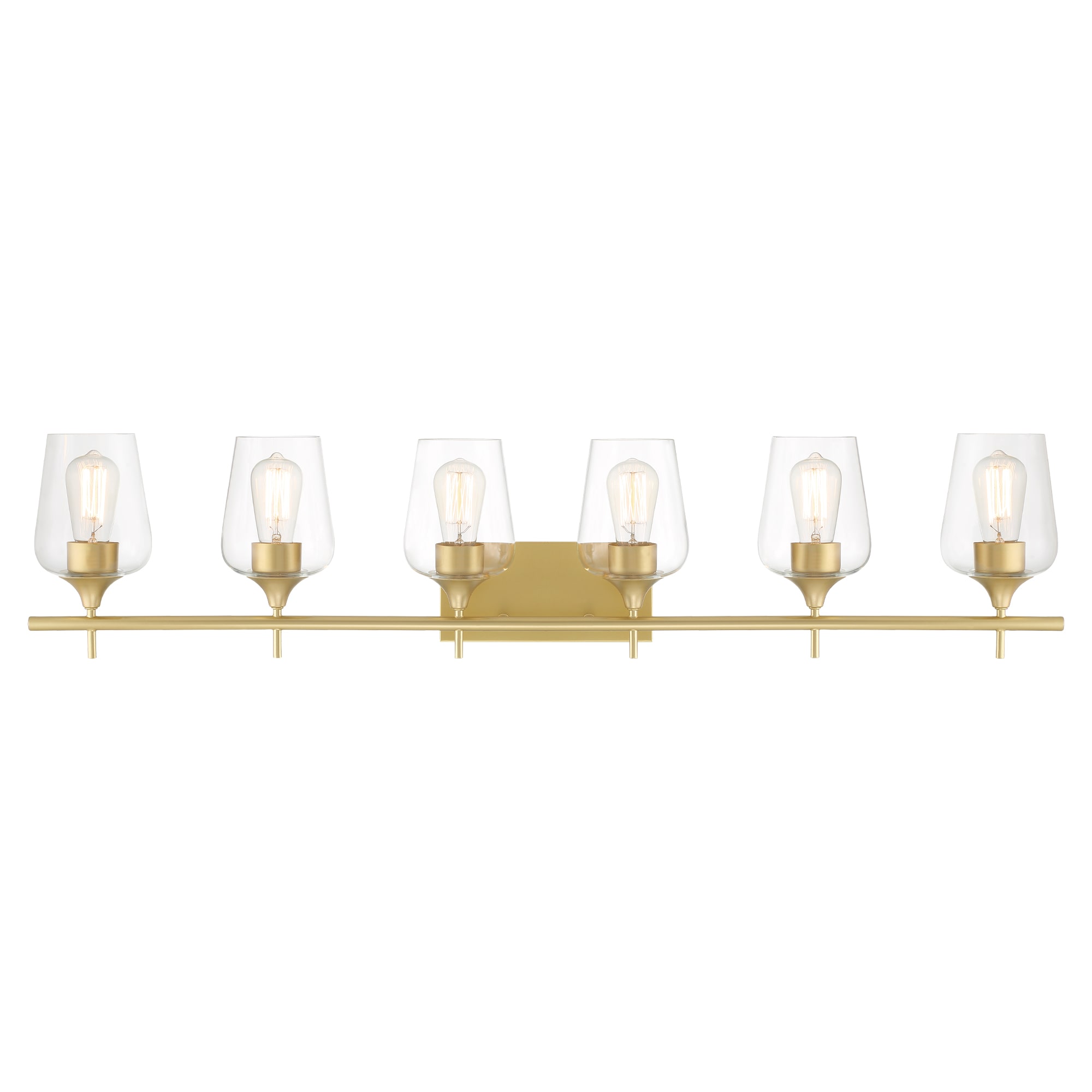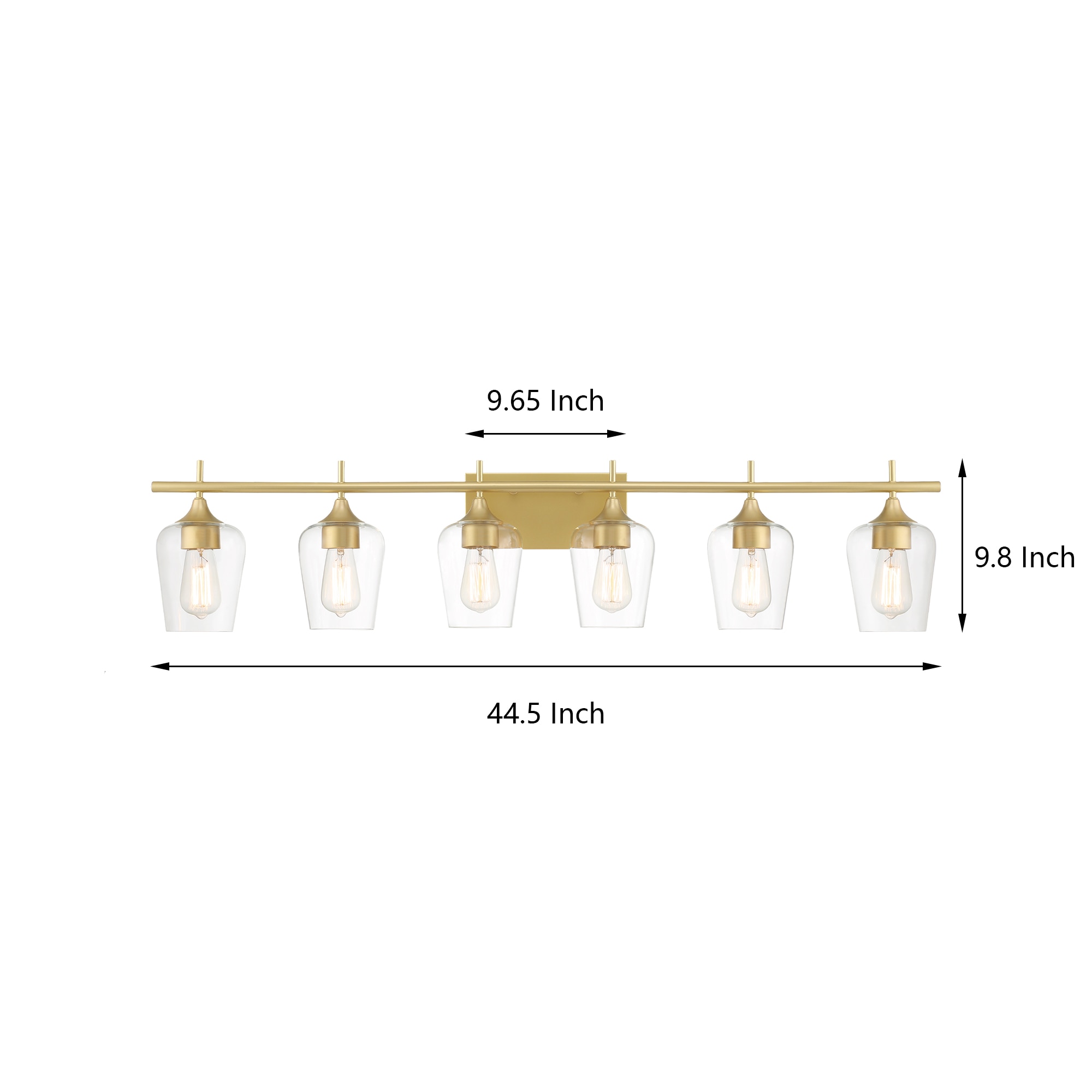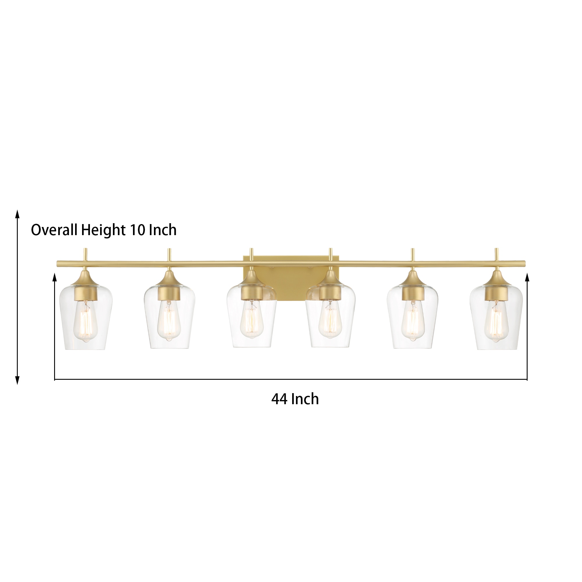Elevate the look in your main bathroom or powder room with this 6-light vanity fixture. It’s crafted from metal in a gleaming gold finish that complements aesthetics from glam to coastal. The square, stainless steel backplate affixes to the wall and supports a bar, from which the six lights suspend. We love how the clear glass shades allow you to see inside the dimmable bulbs (sold separately). This light is 44” wide, so it’s just right to mount over most sinks or vanities. Plus, it has reversible orientation, giving you the option to direct the light upwards or downwards.