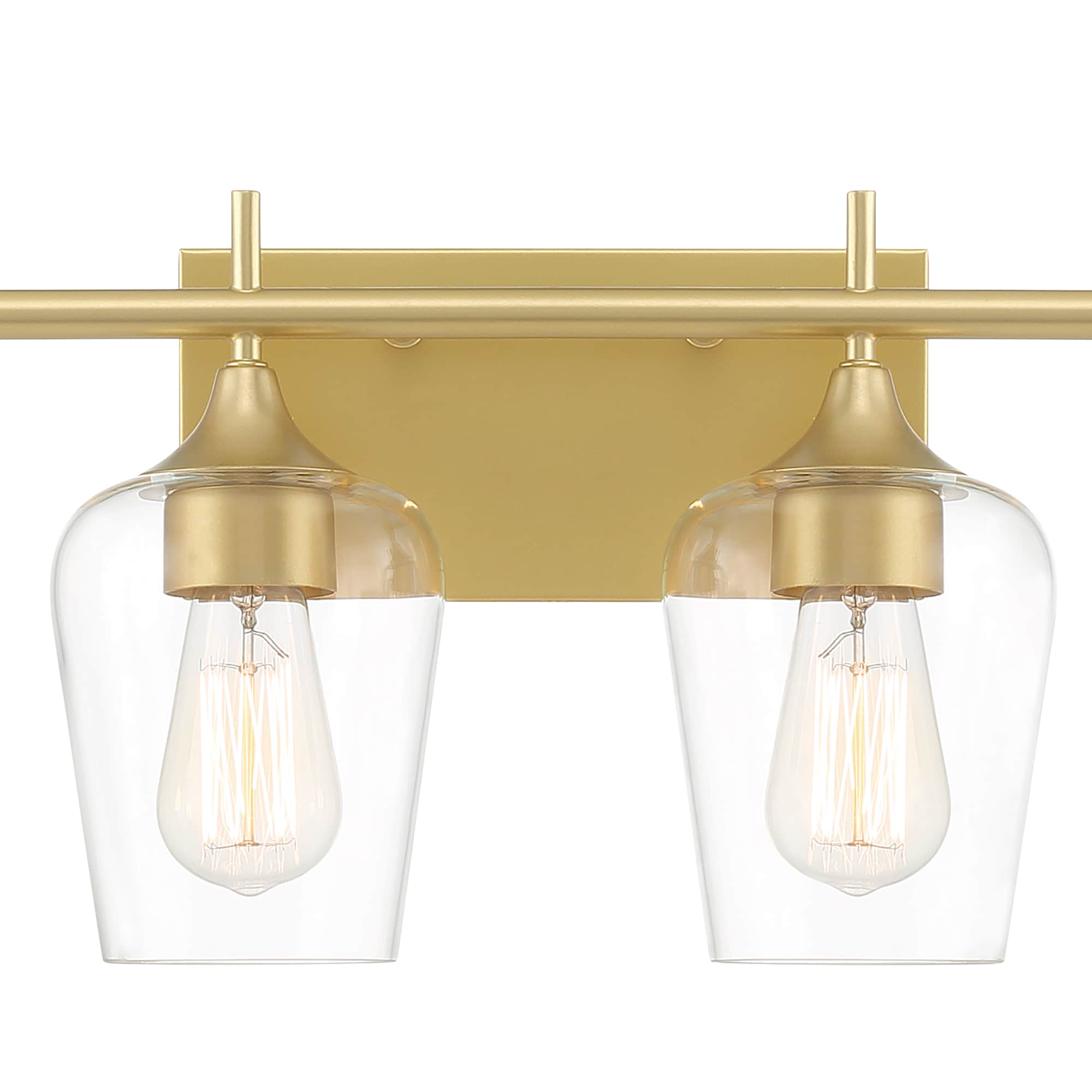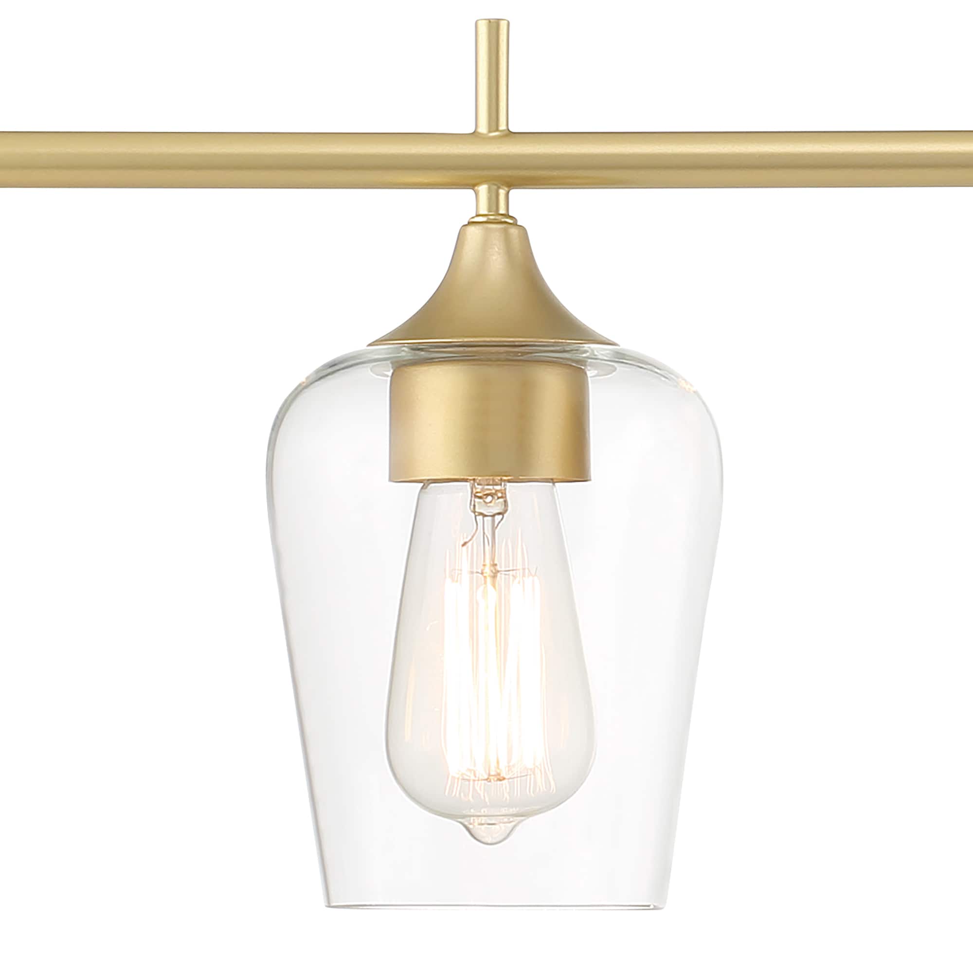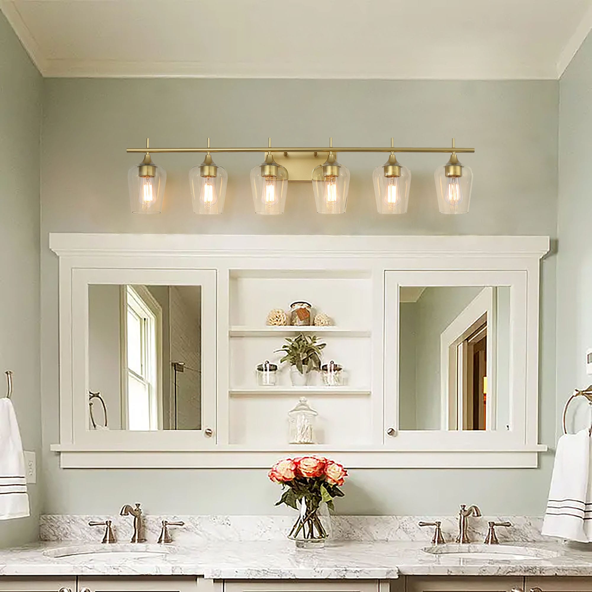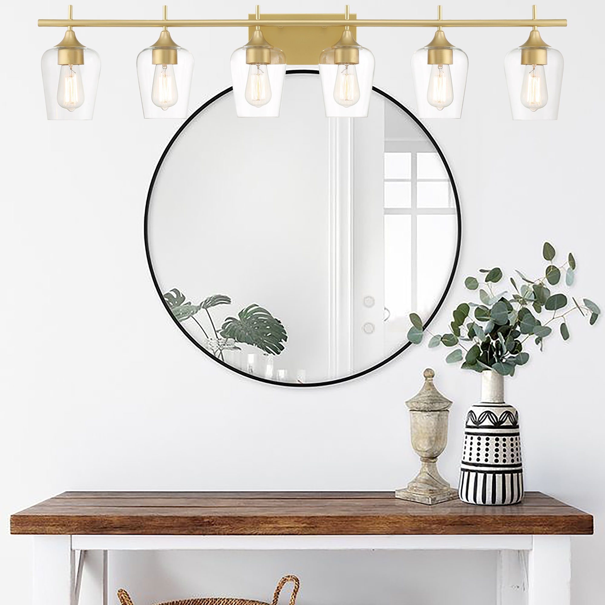 Elevate the look in your main bathroom or powder room with this 6-light vanity fixture. It’s crafted from metal in a gleaming gold finish that complements aesthetics from glam to coastal. The square, stainless steel backplate affixes to the wall and supports a bar, from which the six lights suspend. We love how the clear glass shades allow you to see inside the dimmable bulbs (sold separately). This light is 44” wide, so it’s just right to mount over most sinks or vanities. Plus, it has reversible orientation, giving you the option to direct the light upwards or downwards.