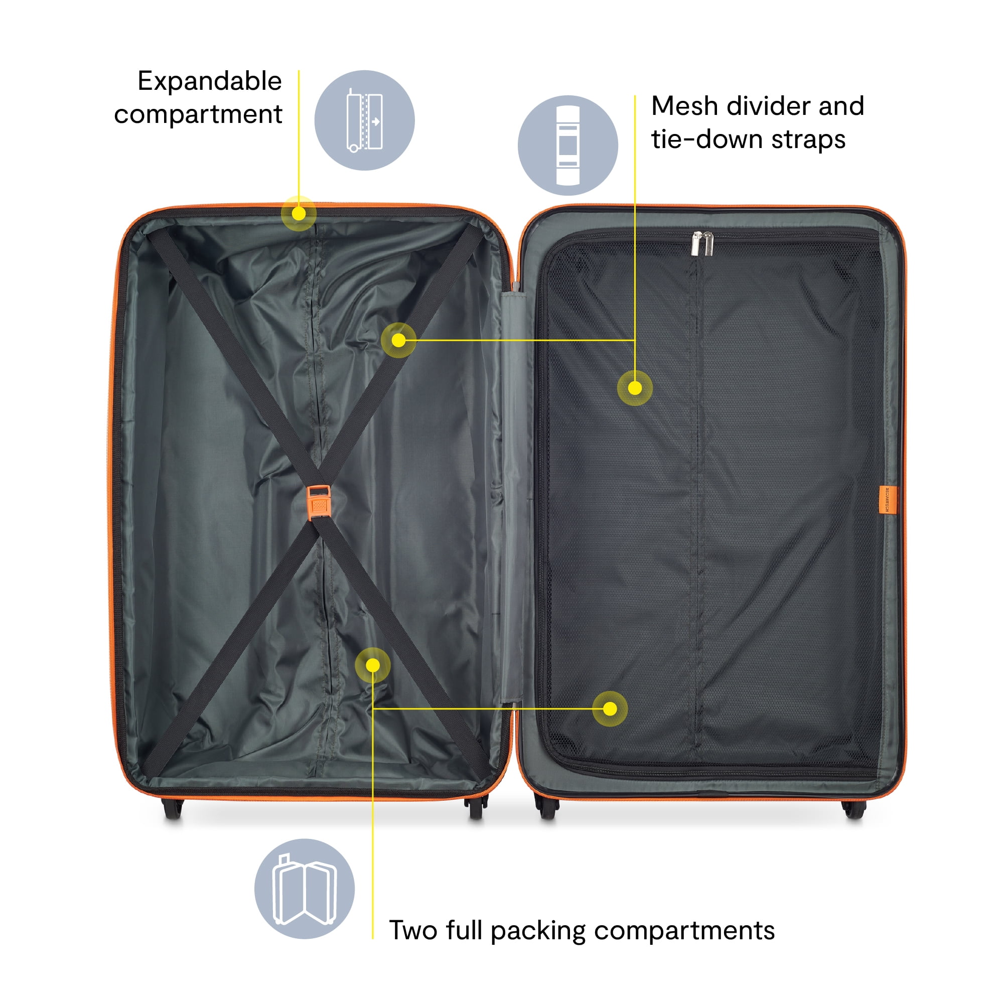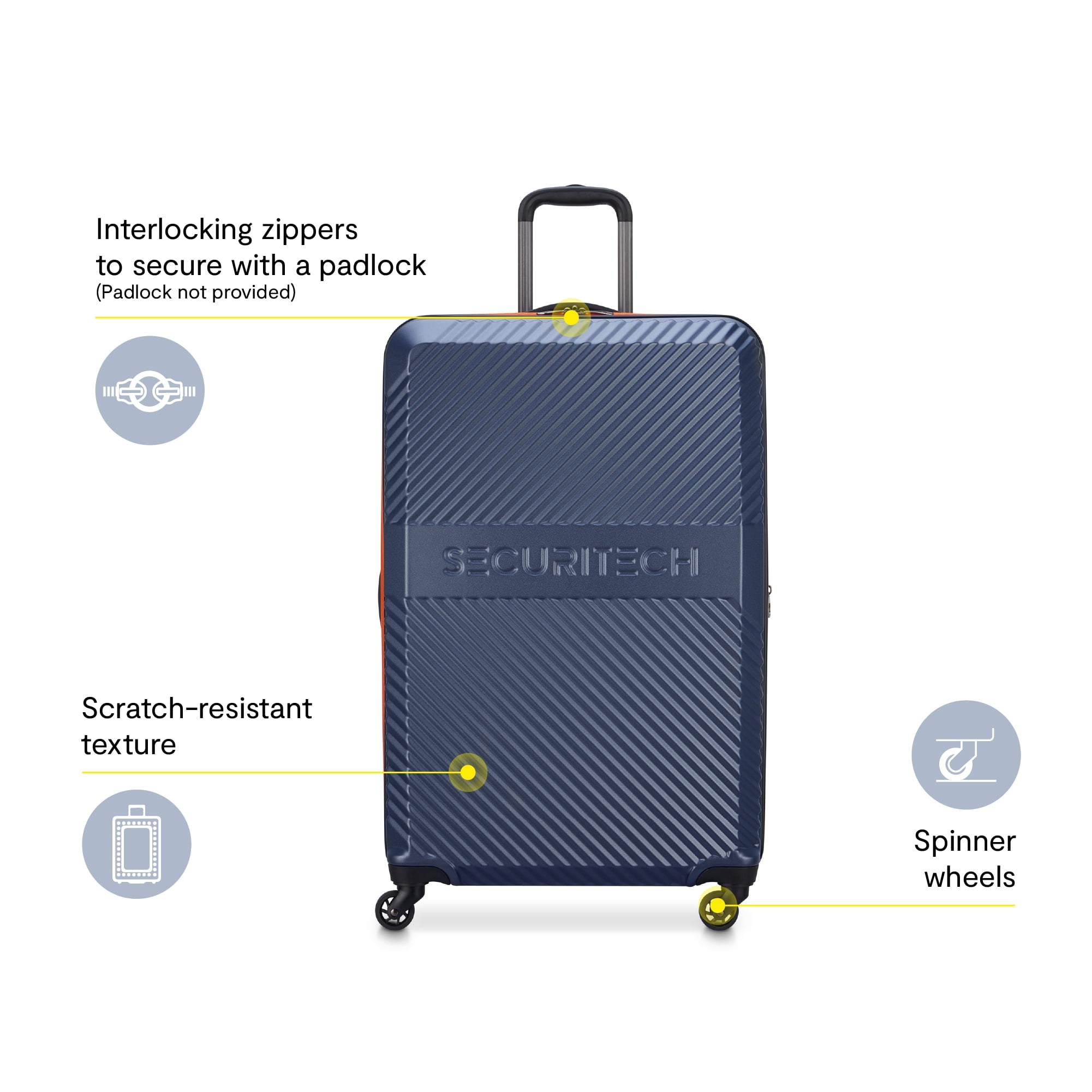 Securitech’s Patrol 28″ Checked Hardside Spinner Luggage is your next adventure companion! The Patrol collection offers a sleek but sharp design, with a durable scratch resistant shell. With a pop of our signature Securitech orange color, you can quickly spot your bag anywhere. This checked bag is packed with simple yet necessary features to make any trip effortless! You can expect durable single spinner wheels for ease of movement, and a roomy interior with tie-down straps and mesh panel divider to create an organized packing system. Each bag in this collection is also expandable creating plenty of space to bring home items from your travels.