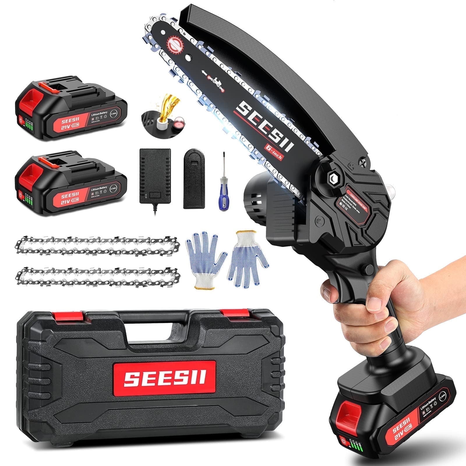 Features: 1. Pure Copper Motor 2. Efficient Haet Dissipation 3. High Hardness Chain 4. 30ml Oil Inspection 5. Low Kickback Specification: Brand: Seesii Type: Cordless Mini Chainsaw Color: Black and Red Size: 15.75 x 7.87 x 5.91 inch Brushless Motor: 880W Max Speed: 16.4 ft/s Power Source: Battery Battery Type: 2.0Ah Lithium-Ion Battery Qty: 2 Working Time: 30-40 minutes Charging Time: 2-3 hours Voltage: 21V Weighing: 3.15 lbs Package Included: 1 x Electric Chainsaw 2 x Battery(w/ indicator) 1x Charger 2 x Chain(One has been installed) 1 x Bar protection cover 1 x Screwdriver 1pair Gloves 1 x Carrying Case 1 x User Manual
