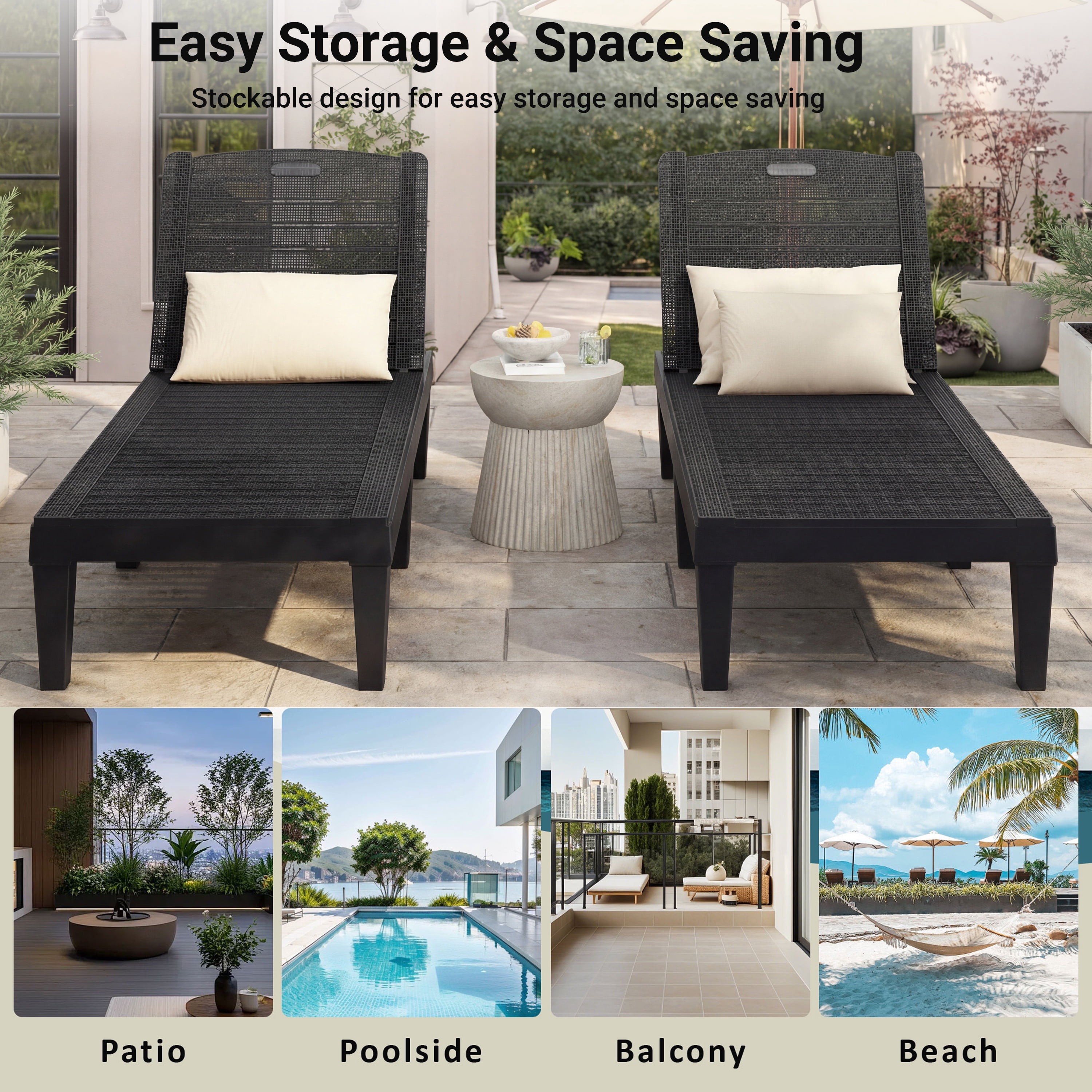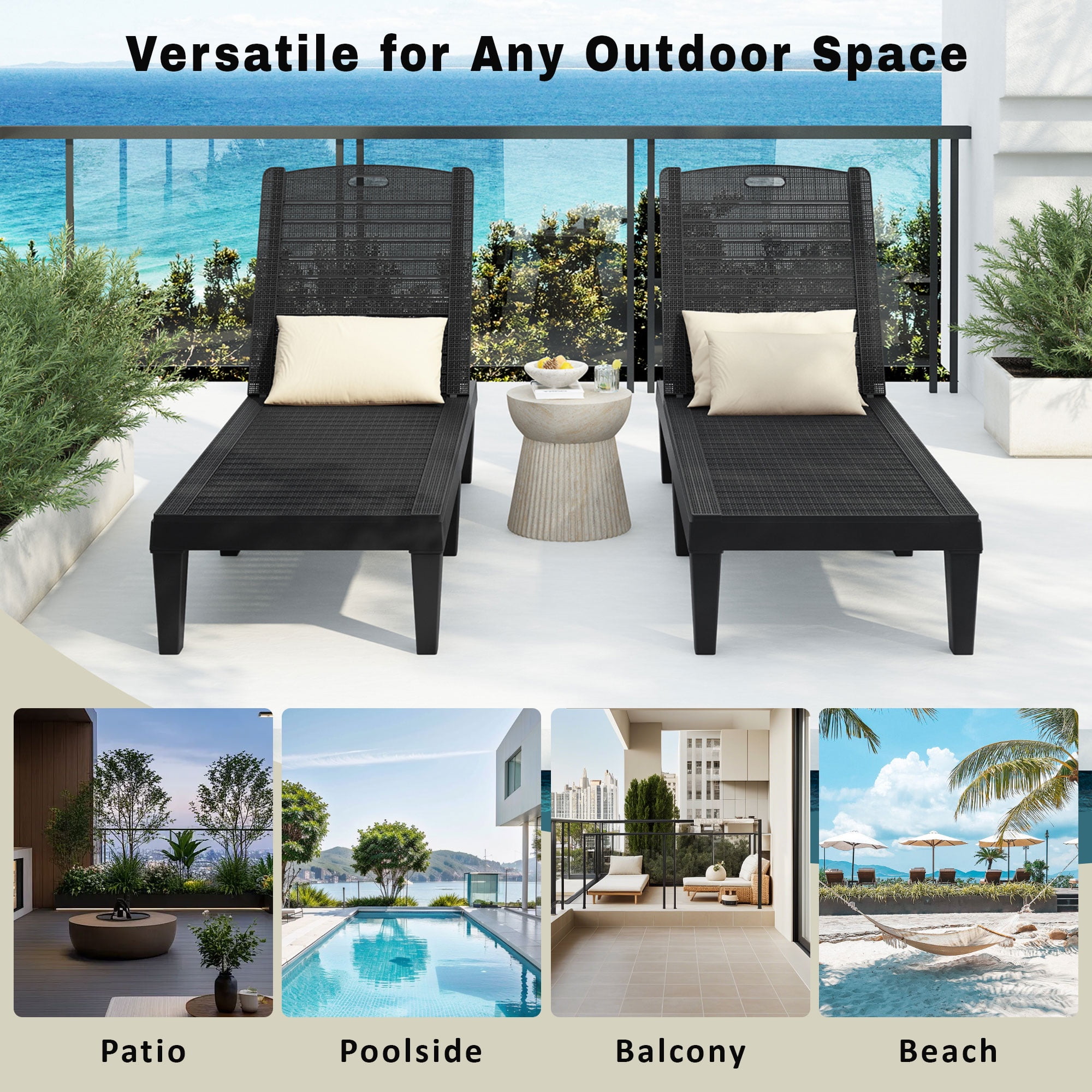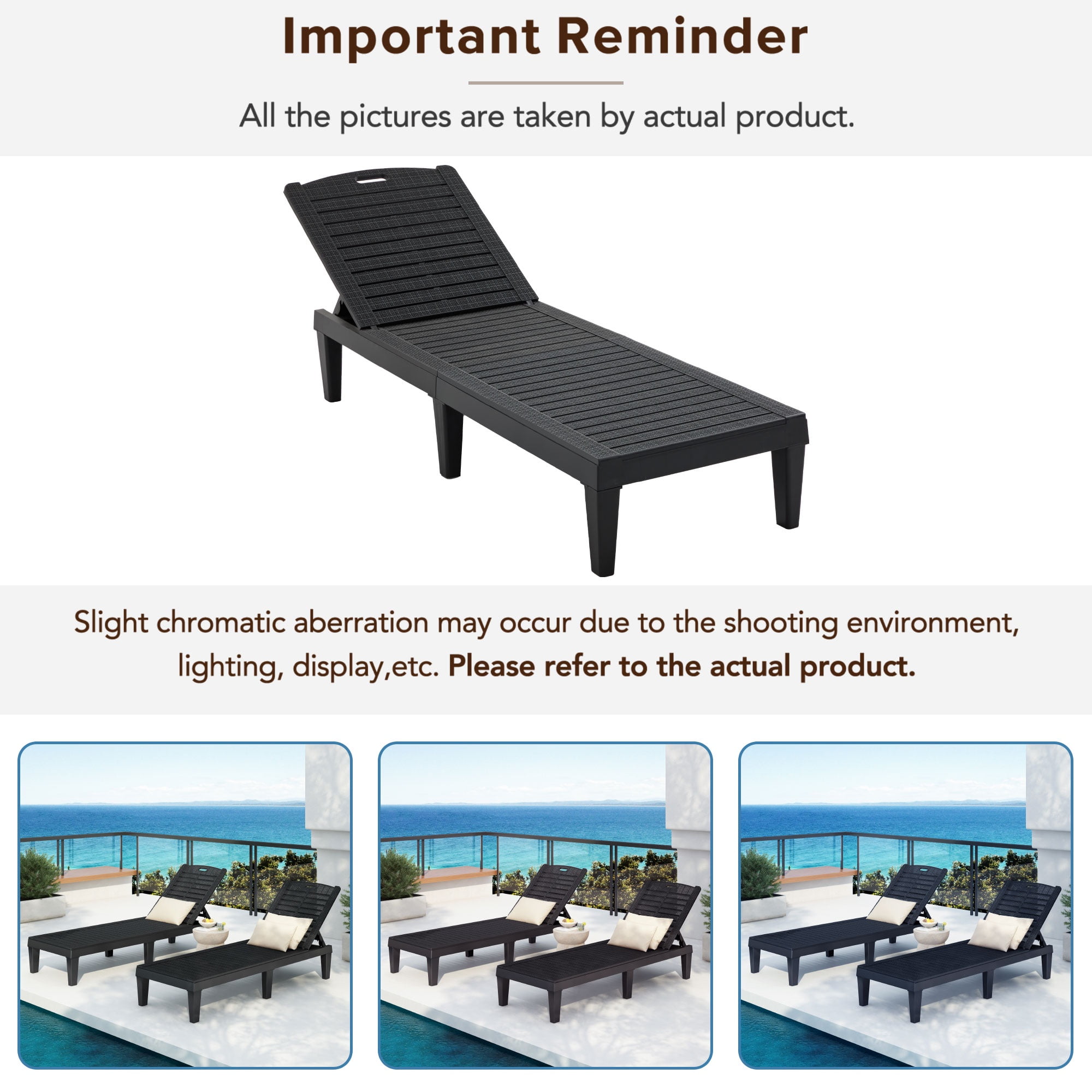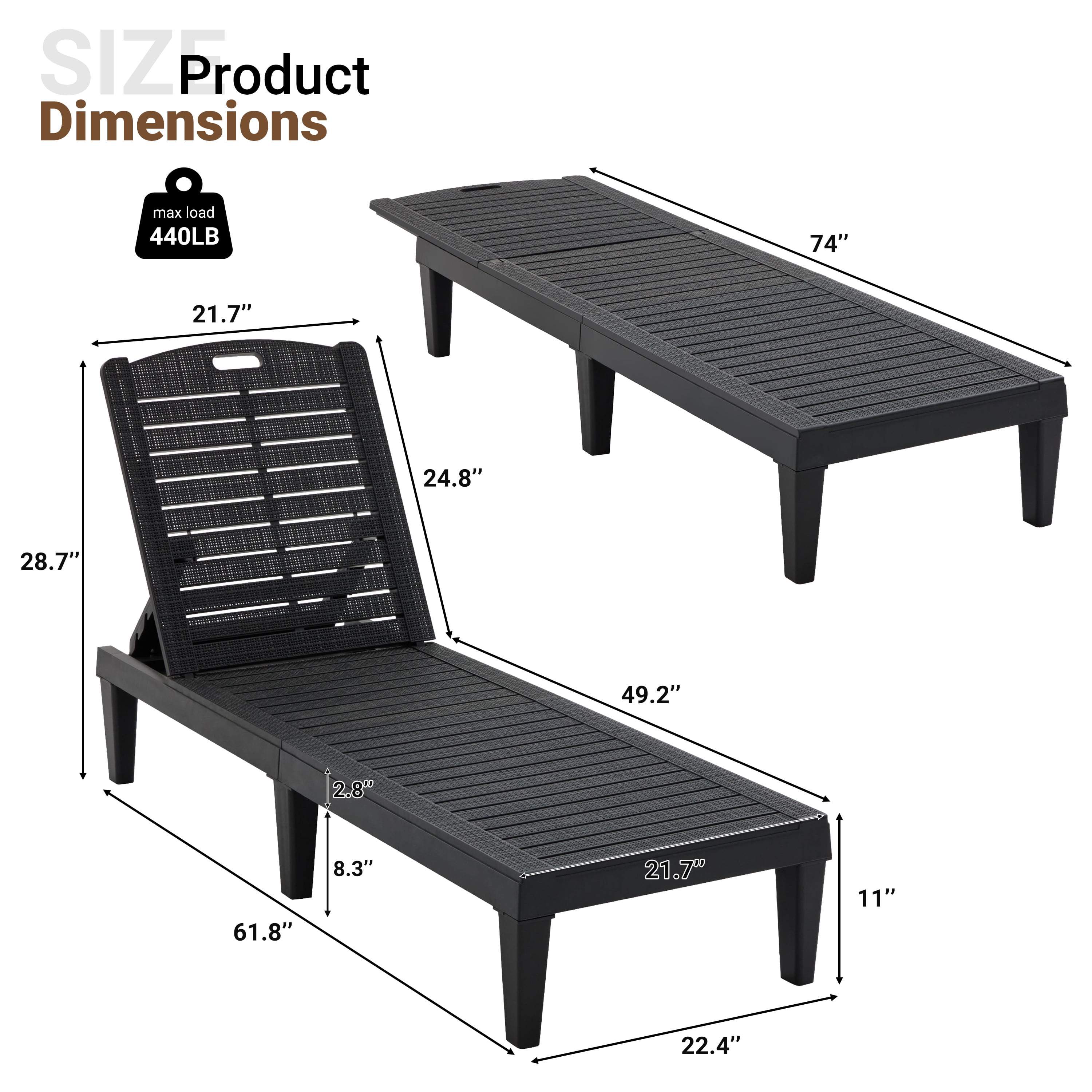 Our outdoor lounge chairs combined with comfort and practicability will be an excellent choice for your backyard. The chaise lounge chairs are made of polypropylene resin, which are waterproof and can be used for many years. The chaise lounge chair comes with an adjustable back so you can find a comfortable position according to your preference. Do not hesitate!!! Buy it!!! 1. Premium Material Our outdoor chaise lounge chairs are made of waterproof PP resin, water-repellent and quick dry, which is durable enough to resist sun light and rain for year-round use. The breathable cutout design allows this chaise longue to provide a cool and comfortable sitting experience even in hot summer. 2. Adjustable Reclining Positions Equipped with 5 5-level adjustable backrest, our outdoor lounge chair allows you to choose the most comfortable position according to your preference. The backrest perfectly fits the curve of your body and the armless design with an ergonomic design can free your arms from relaxing. 3. Tool-Free Assembly Designed with convenience in mind, this chaise lounge requires no tools for assembly—just snap the legs into place, and you’re ready to relax. 4. Sturdy Construction The back buckle adopts triangular design to ensure safety when you lie down. And each chair is equipped with six thick chair legs to ensure the stability of the chair. Each chair has a maximum weight capacity of 440 lbs, you can enjoy sunbathing without any worries. 5. Wide Application The outdoor lounge chairs are not only suitable for relaxing and enjoying with your family near the swimming pool, in your garden, on your deck. but also suitable for the beach, camping, fishing. Specifications: Material: PP resin Color: Black Lounge Size for Chatting Mode: 49.2”(L) x 22.4”(W) x 28.7”(H) Lounge Size for Sleeping Mode: 74”(L) x 22.4”(W) x 11”(H) Weight Capacity: 440 lbs Product Weight:21.39 lbs / Set Package Included: 2 x Lounge Chairs 1 x User Manual