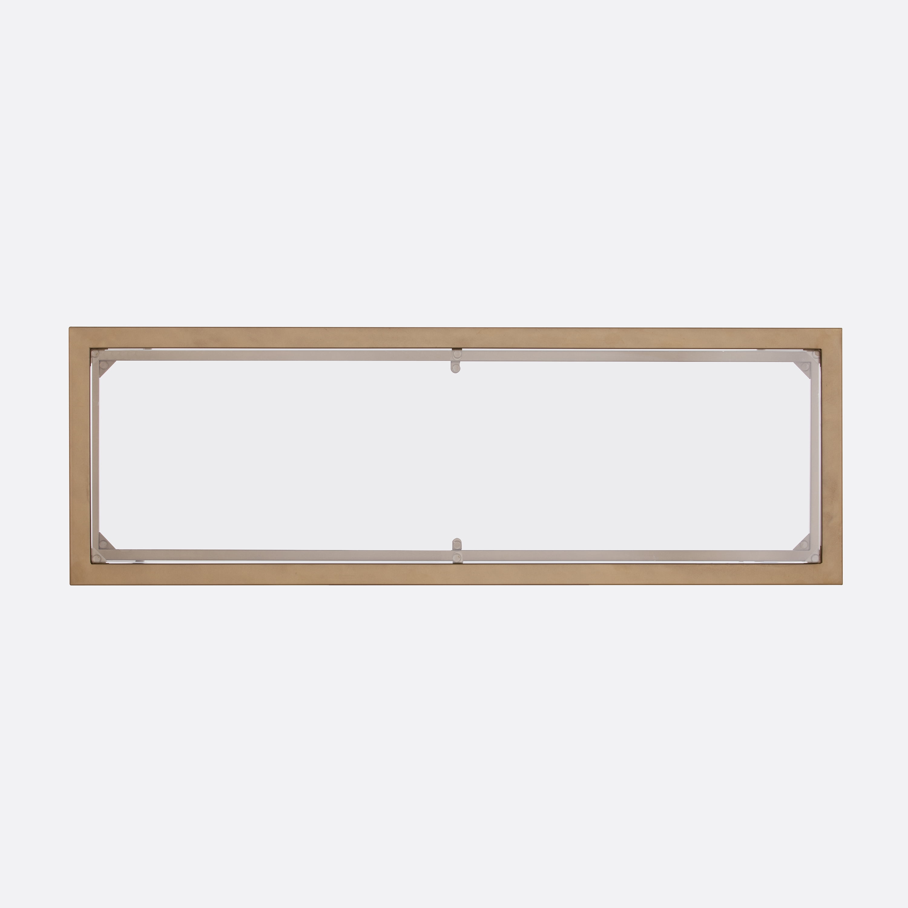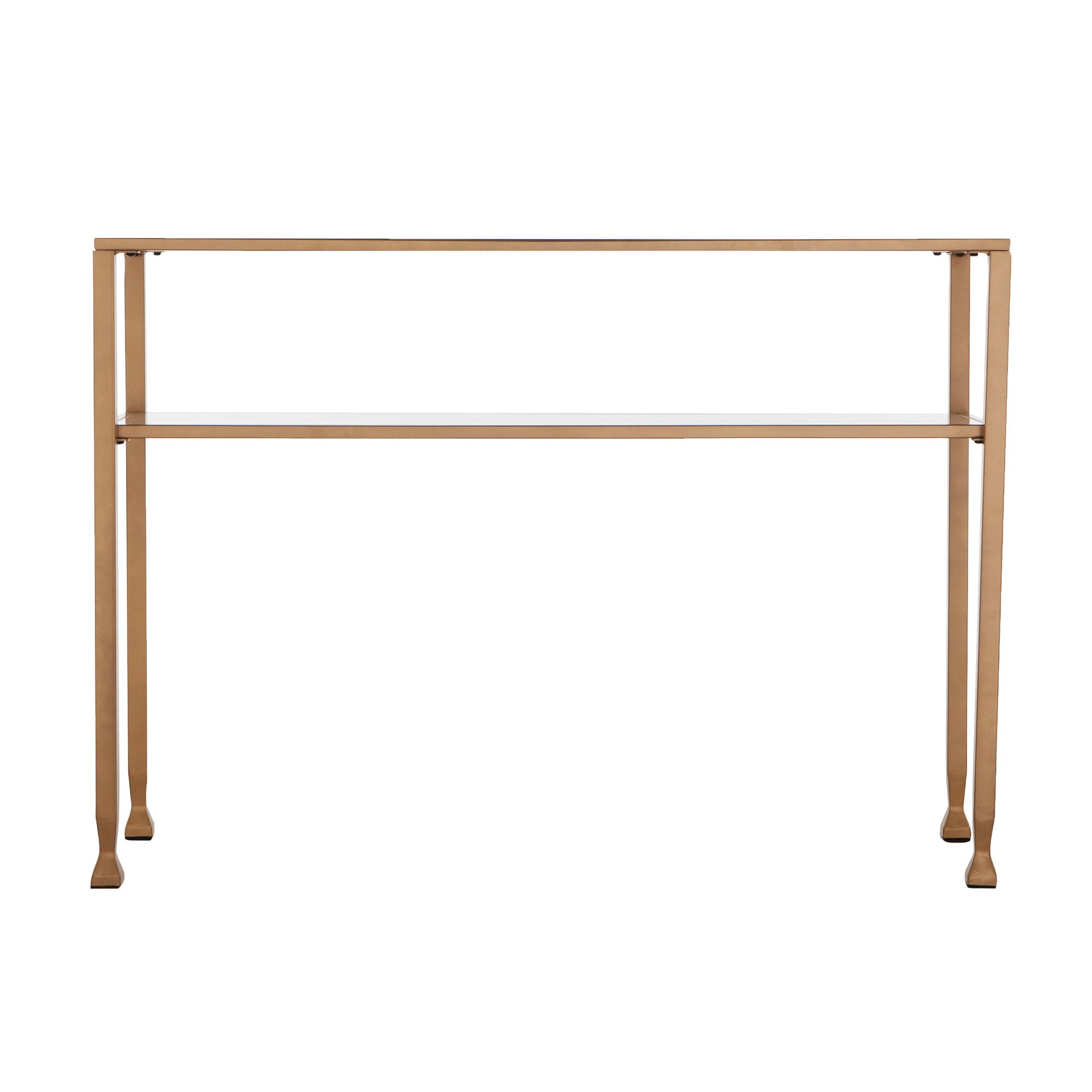 Finish: Soft Gold Materials: Powder-Coated Iron Metal, 5mm Glass Glass top entryway table 2 tier design provides ample storage Geometric shape with tapered legs Tempered glass and sturdy metal frame