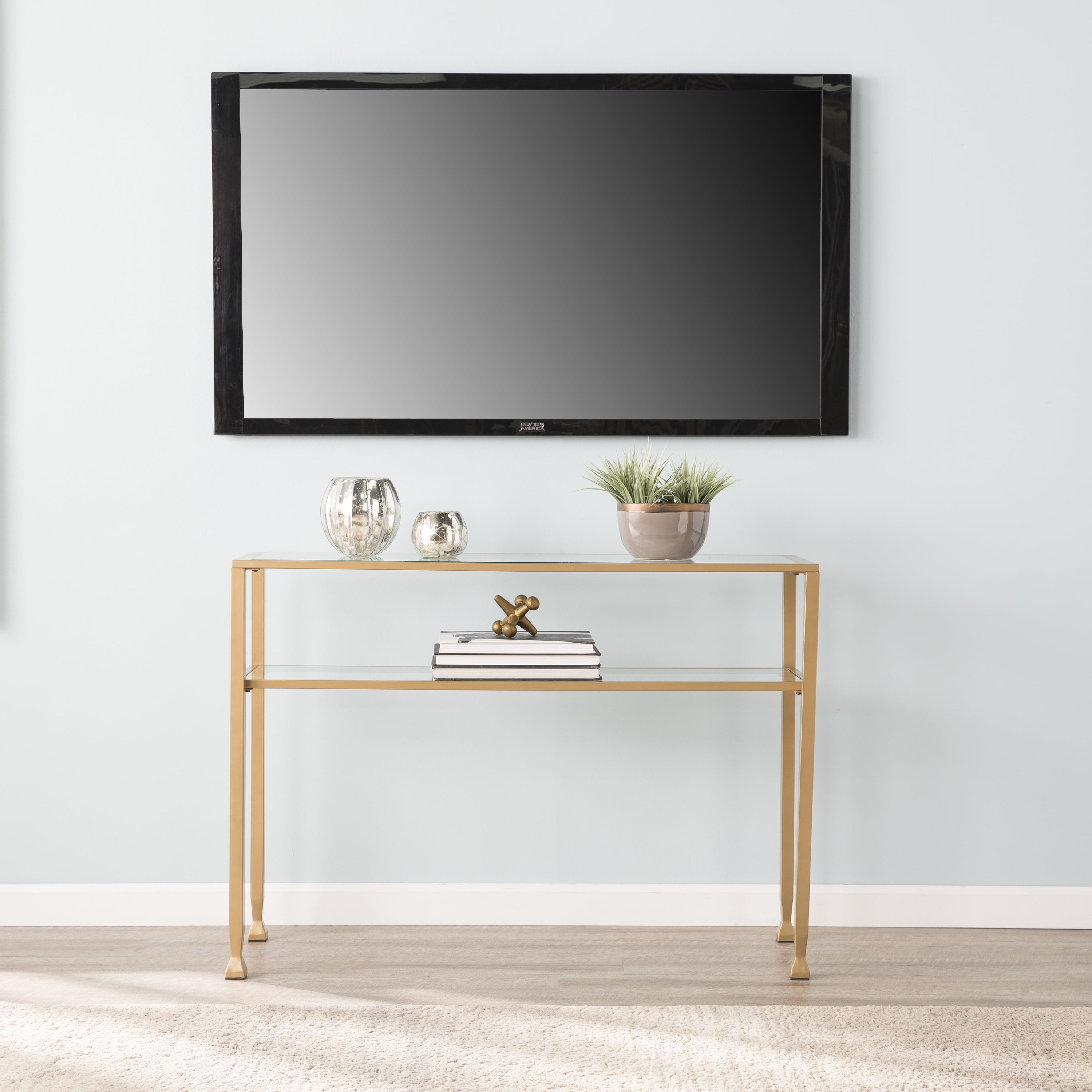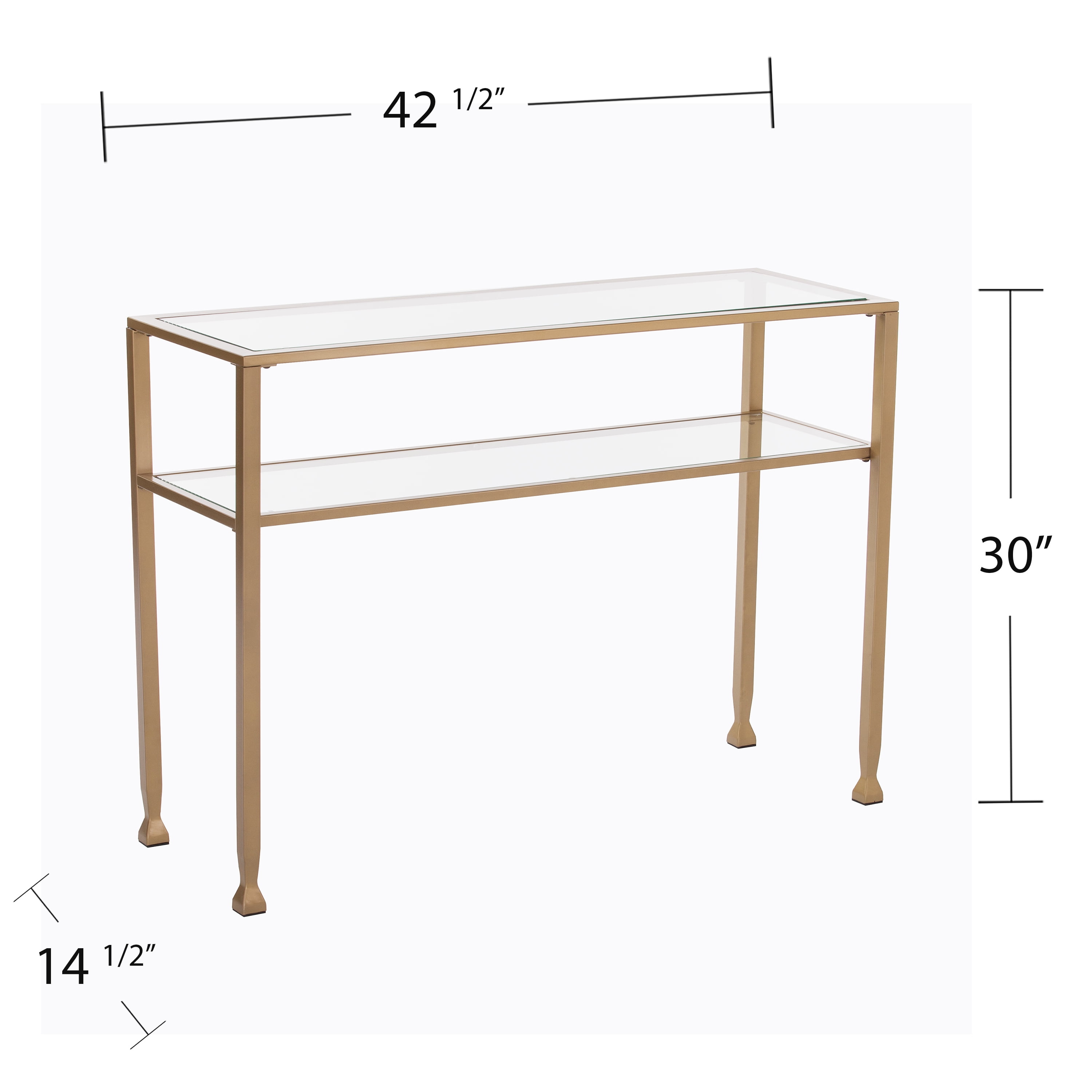 Sofa storage never looked so good. Refresh your living room’s style with this transitional console table. The soft gold finished frame contrasts nicely against the glass tabletop and shelf. Two-tiered designforms a shadowbox effect that makes an exquisite canvas for displaying books, photos, or precious keepsakes. Welcome geometric design in your home by placing this console table in your entryway. Features: Finish: Soft Gold Materials: Powder-Coated Iron Metal, 5mm Glass Glass top entryway table 2 tier design provides ample storage Geometric shape with tapered legs Tempered glass and sturdy metal frame Specifications: Product Dimensions: 30″H x 42.5″W x 14.5″D Product Weight: 31 lbs