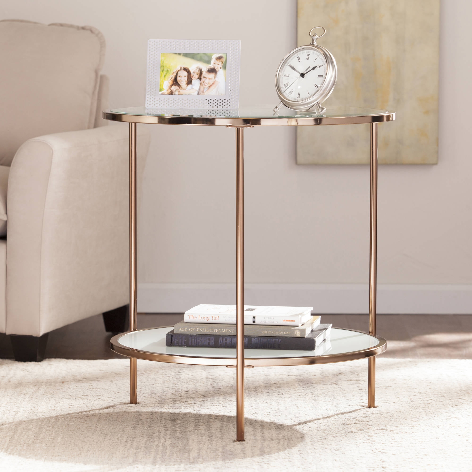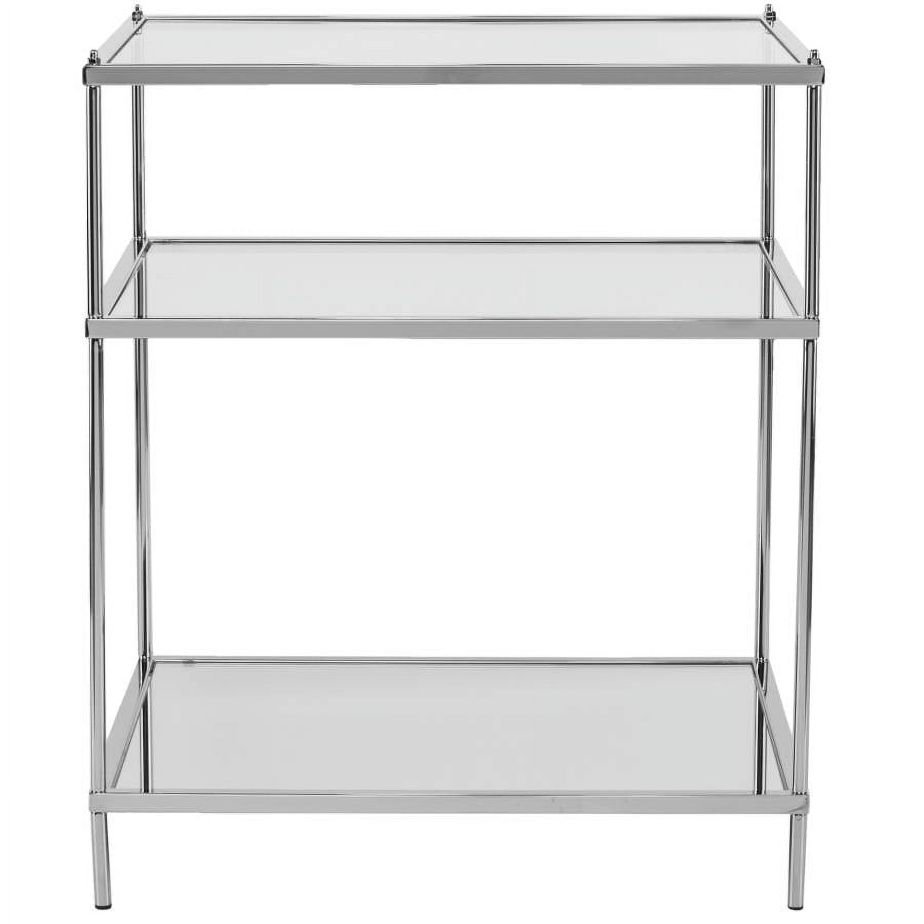 Flashback to flapper style with this oh-so glam side table. High shine chrome metal melds with reflective mirror and shimmering glass, crafting a sleek, elegant look. Shelves store tchotchkes, reading materials, or media accessories; tabletop handles chic lighting, nighttime necessities, or this morning’s coffee. Glamorize your flat with this metallic accent table in the living room, reading nook, or bedside as a nightstand.
