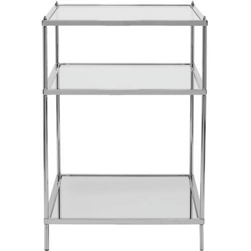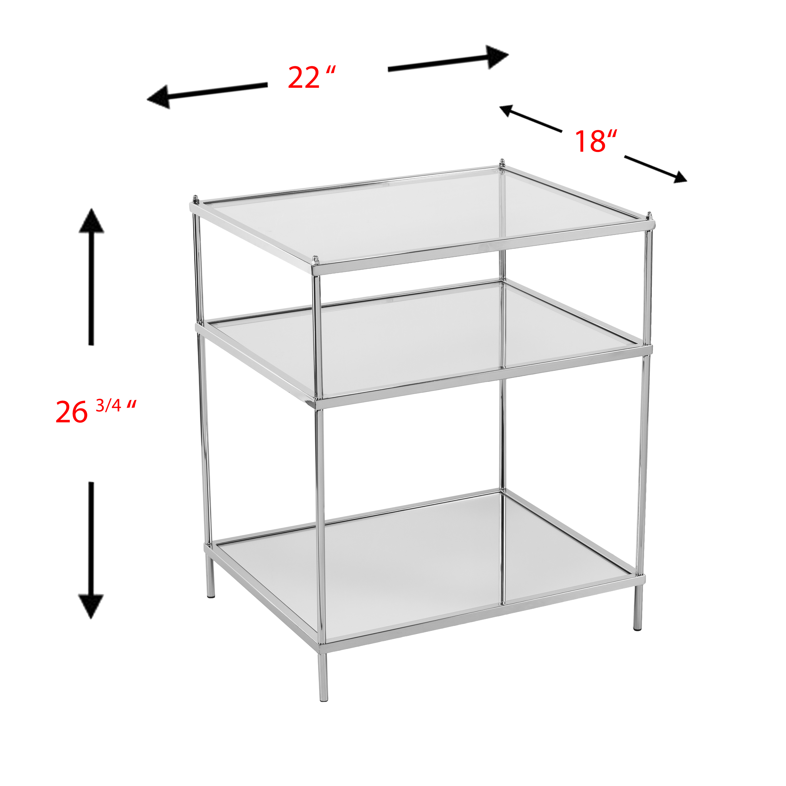 Southern Enterprises Kreamer Glam Mirrored Side Table, Chrome: Evokes 1920s luxury with metal, glass, and mirror 2 fixed display shelves Living room, reading nook, or bedroom Glam style Metallic chrome Overall: 22″ W x 18″ D x 26.75″ H Assembly: Easy to assemble Tabletop: 22″ W x 18″ D x .25″ thick Shelves: 20.75″ W x 16.75″ D x 7/14″ H (top/bottom) Glass/Mirror: 20.5″ W x 16.5″ D Clearance: 20.75″ W x 17″ D x 3″ H Footprint: 21.5″ W x 18″ D Approx. weight: 26 lb. Supports up to 35 lb. (tabletop / each shelf) Materials: Chrome-plated iron, 5 mm clear tempered glass, 5 mm mirror Evokes 1920s luxury with metal, glass, and mirror 2 fixed display shelves