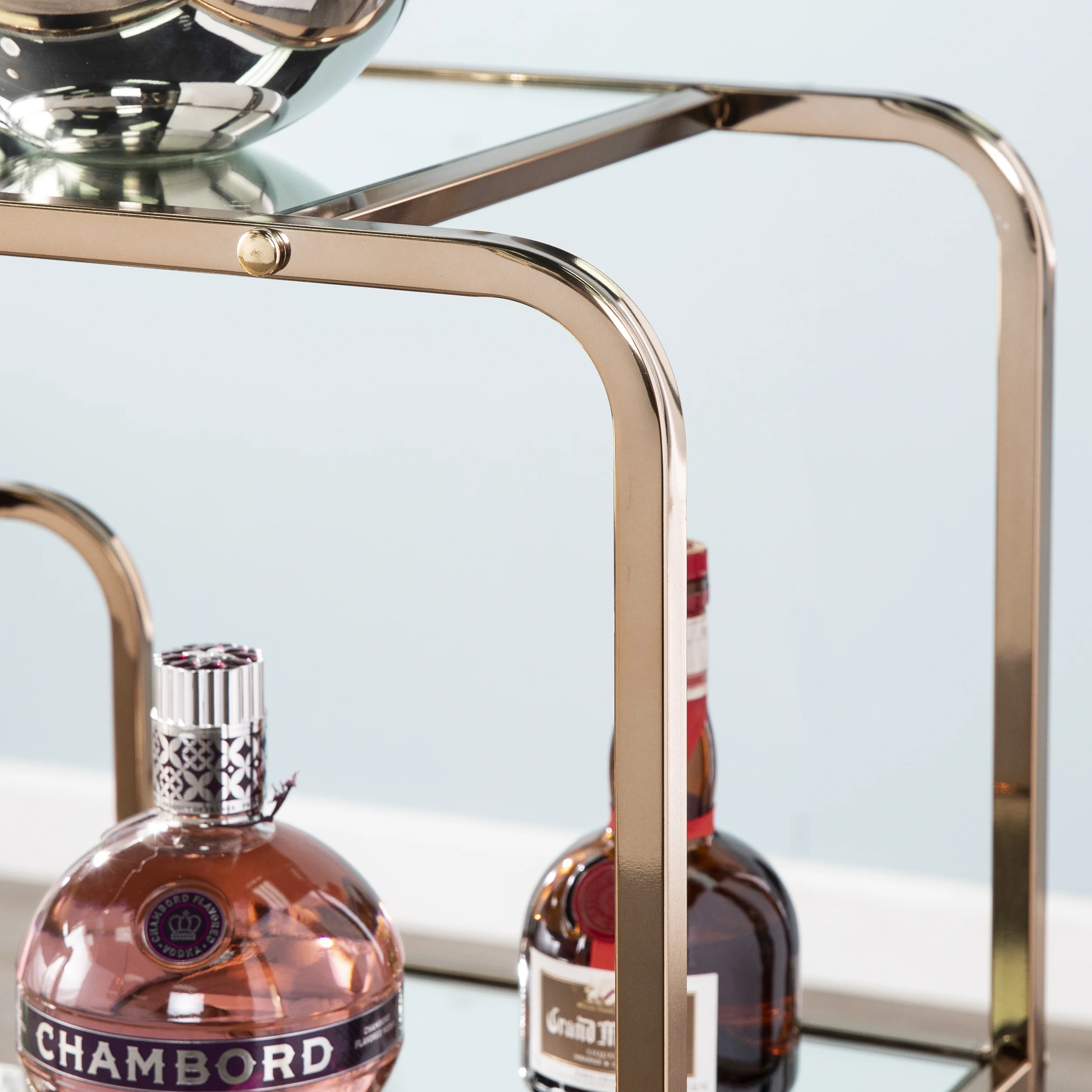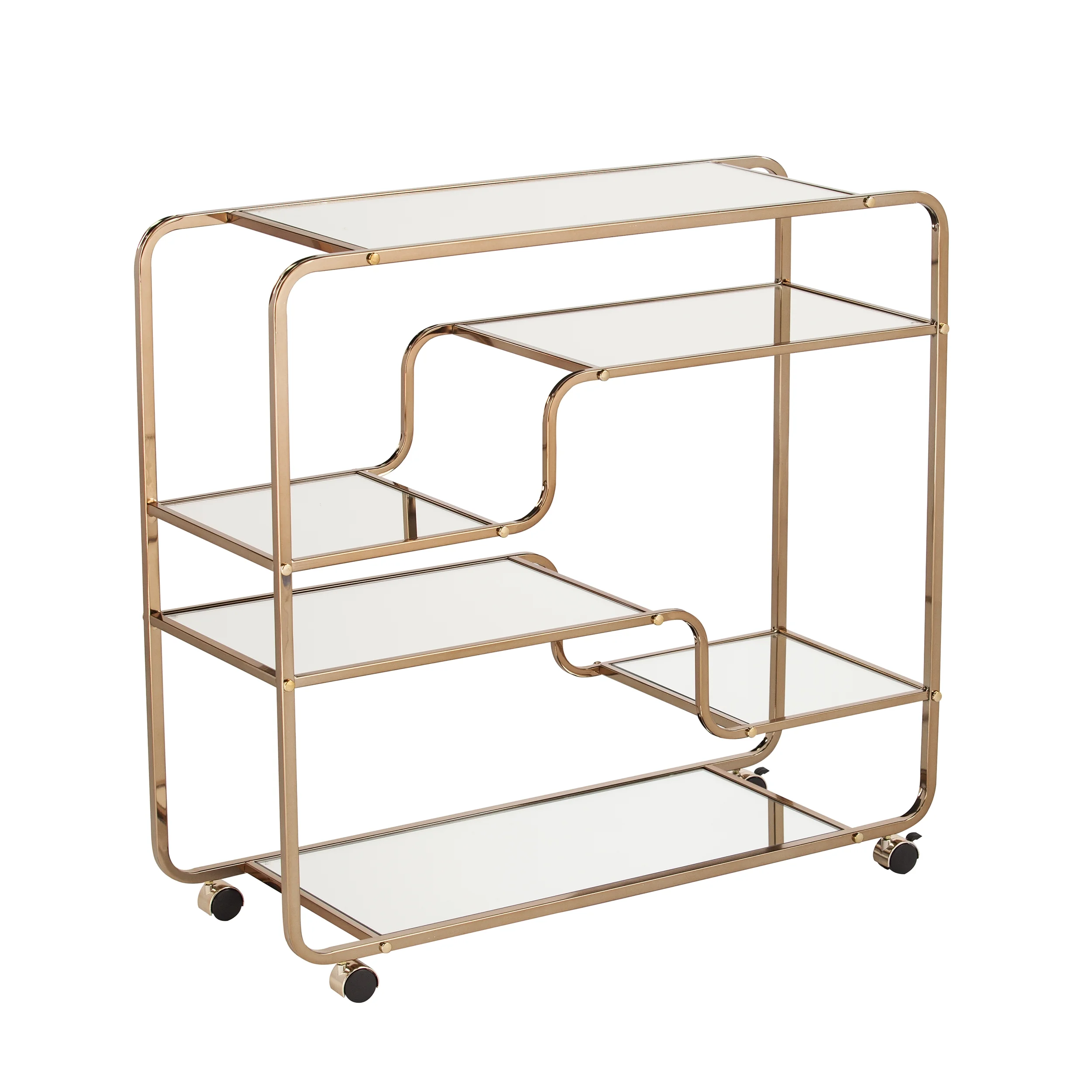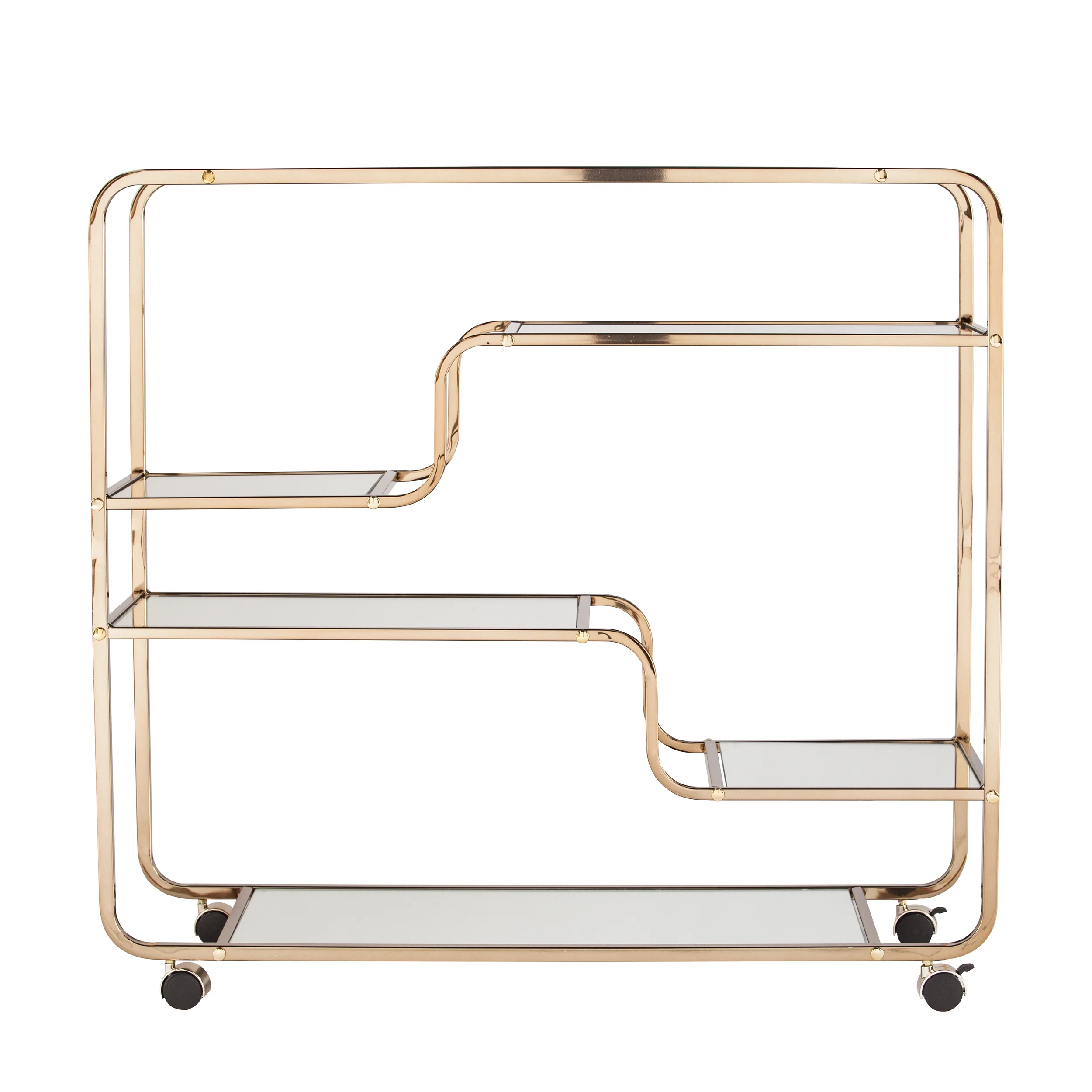 Bring out your bubbly with the Maylynn Art Deco Mirrored Bar Cart. With fluid, asymmetrical appeal, this coffee cart’s metal framework adds a midcentury modern aesthetic. Metal and mirror work in tandem to form a mixed material look, enhancing your home’s décor. Four wheels keep you moving and two locking casters keep you stopped while you pour and serve. Add to your kitchen and enjoy a cup of coffee worth talking about, serve guests tapas during cocktail hour, or add a little green with decorative vases and plants. From morning java to happy hour, the party follows you everywhere with this mobile cart.