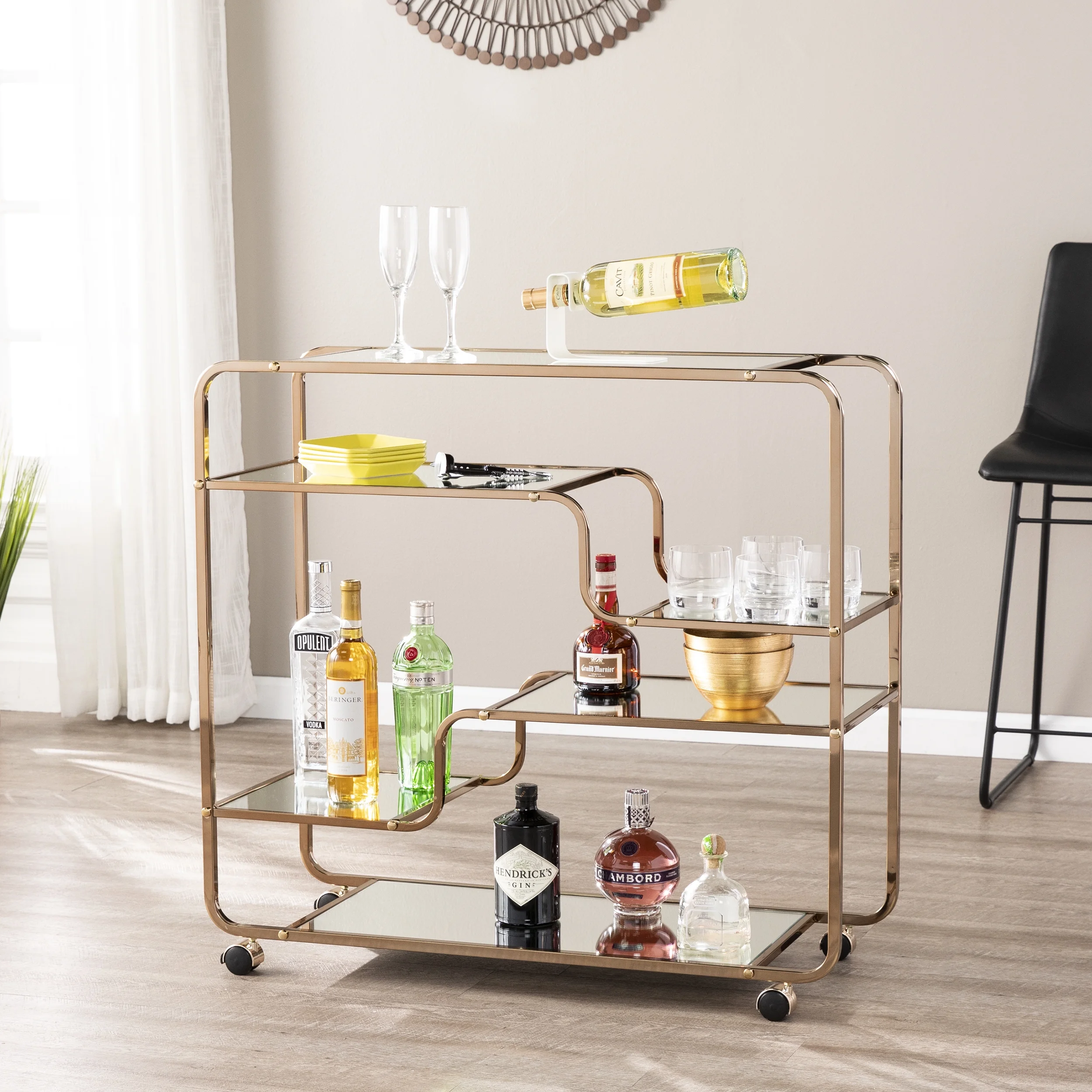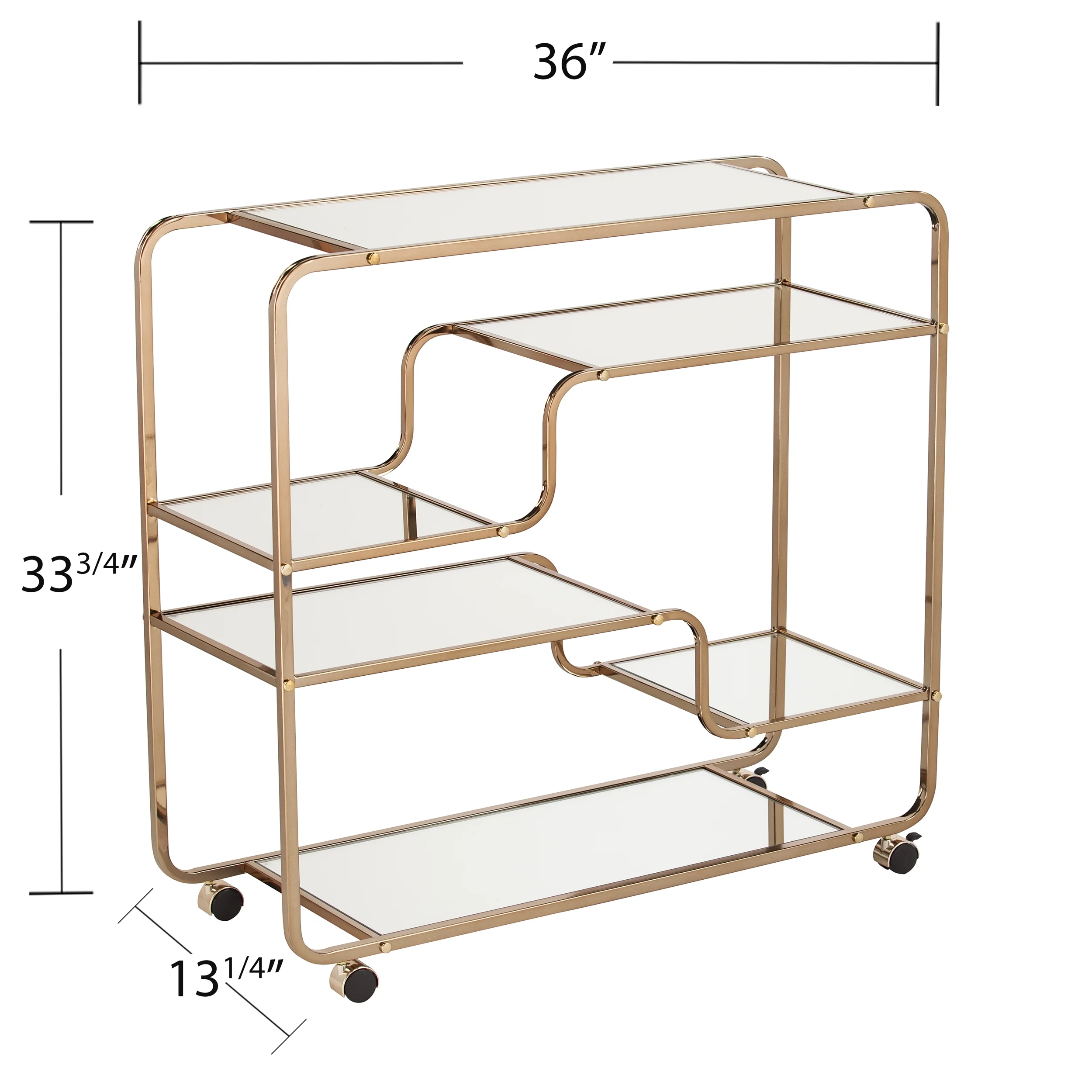 Product Features Mobile coffee or bar cart 5 mirrored shelves and 1 spacious countertop Asymmetrical design w/ multi-sized shelves Art deco inspired look 2 locking casters SEI Furniture 33.75 inch Height