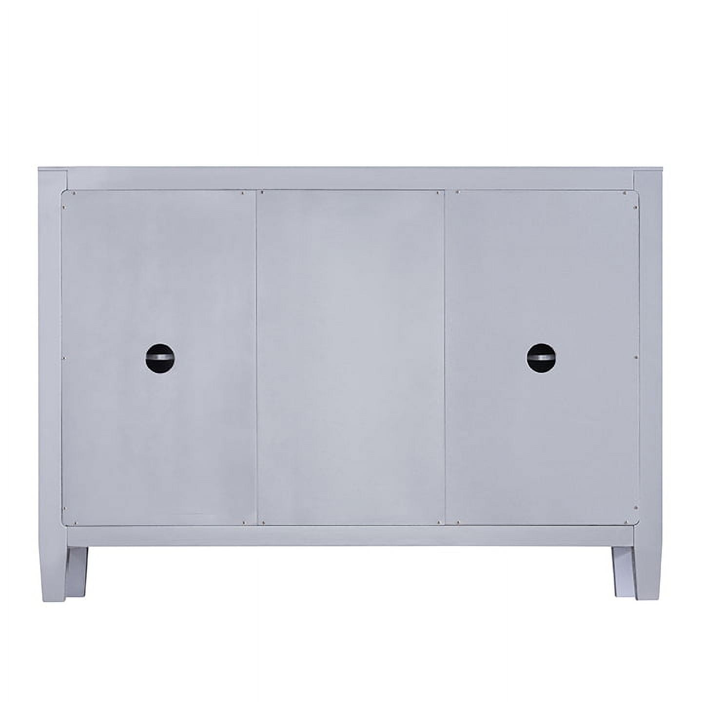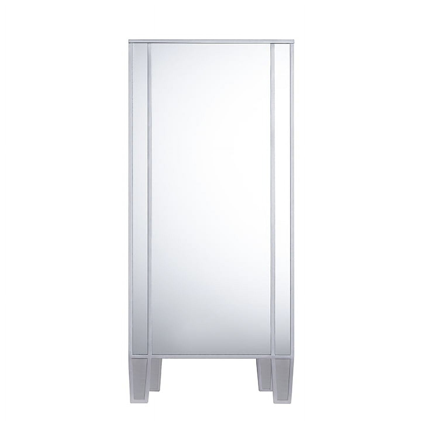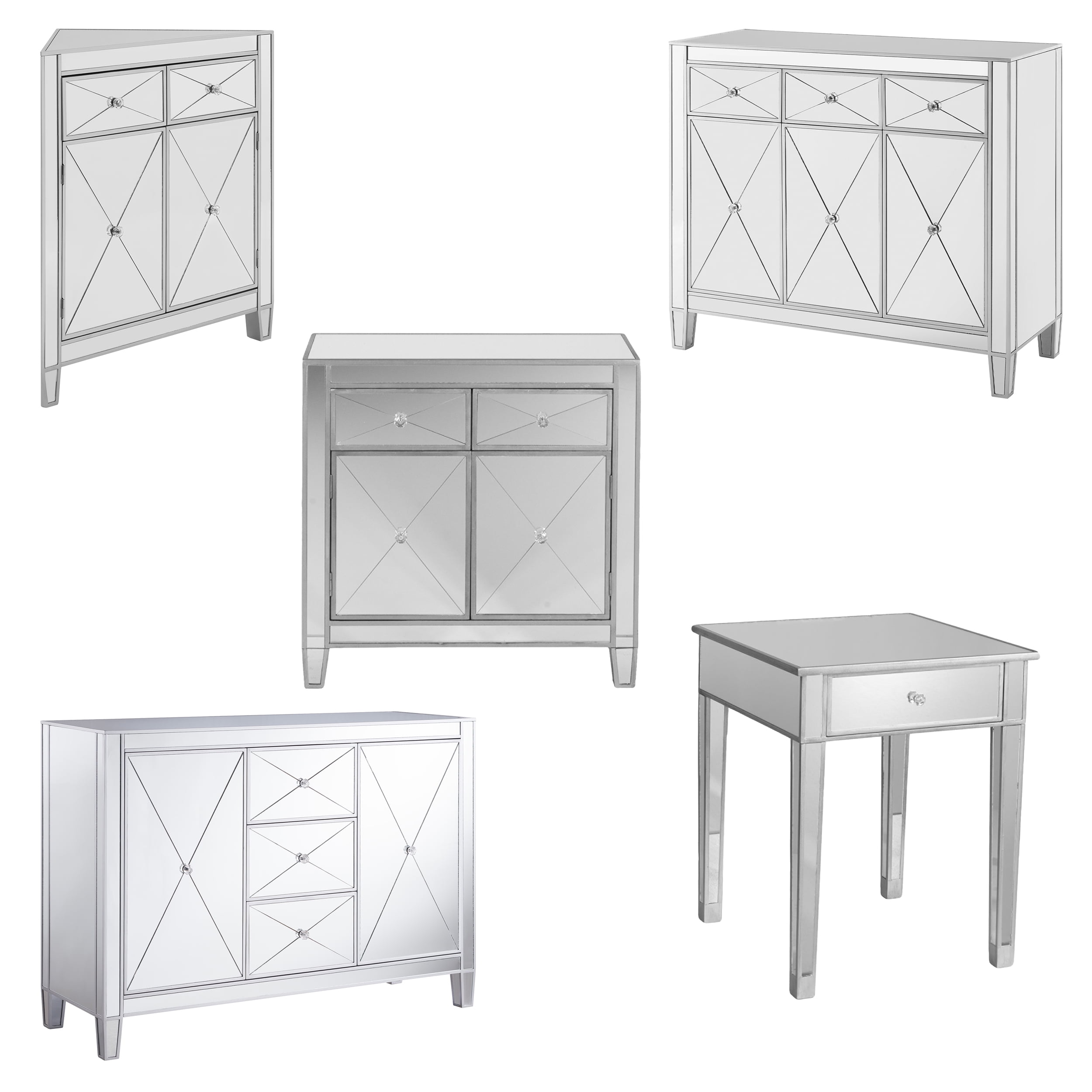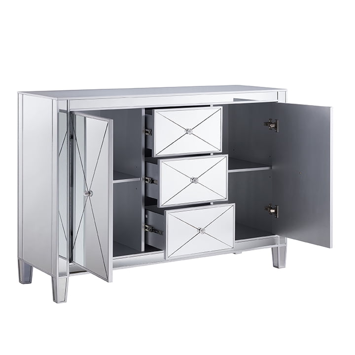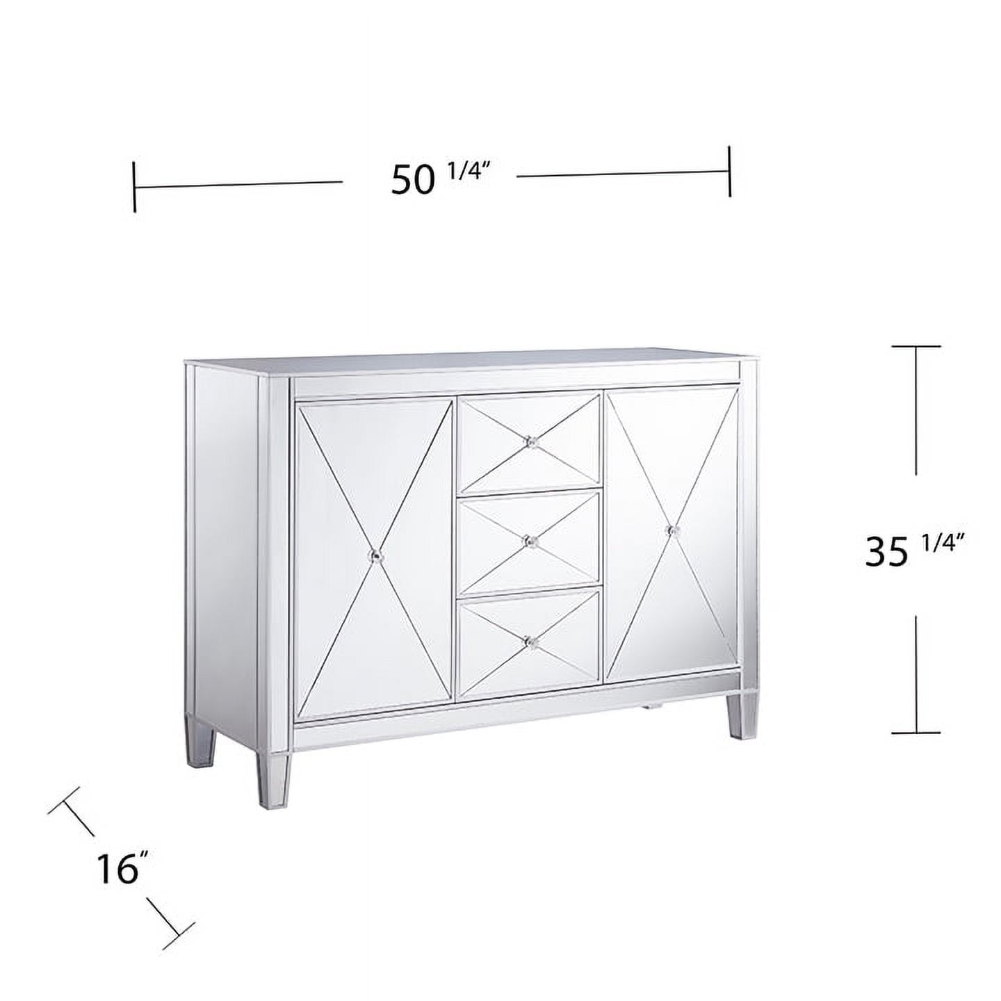 • Goes anywhere accent cabinet • 3 drawers and 2 cabinets w/ 1 adjustable and 1 fixed shelf each • Reflective surfaces on all visible sides; painted back • Criss-cross scoring and crystal style knobs • 2 shared cord control outlets • Living room, dining room, powder room, or hall/entry • Glam style • Mirrored finish with matte silver trim • Faux crystal knobs • Overall: 50.25” W x 16” D x 35.25” H • Required Goes anywhere accent cabinet 3 drawers and 2 cabinets w/ 1 adjustable and 1 fixed shelf each Reflective surfaces on all visible sides; painted back Criss-cross scoring and crystal style knobs 2 shared cord control outlets